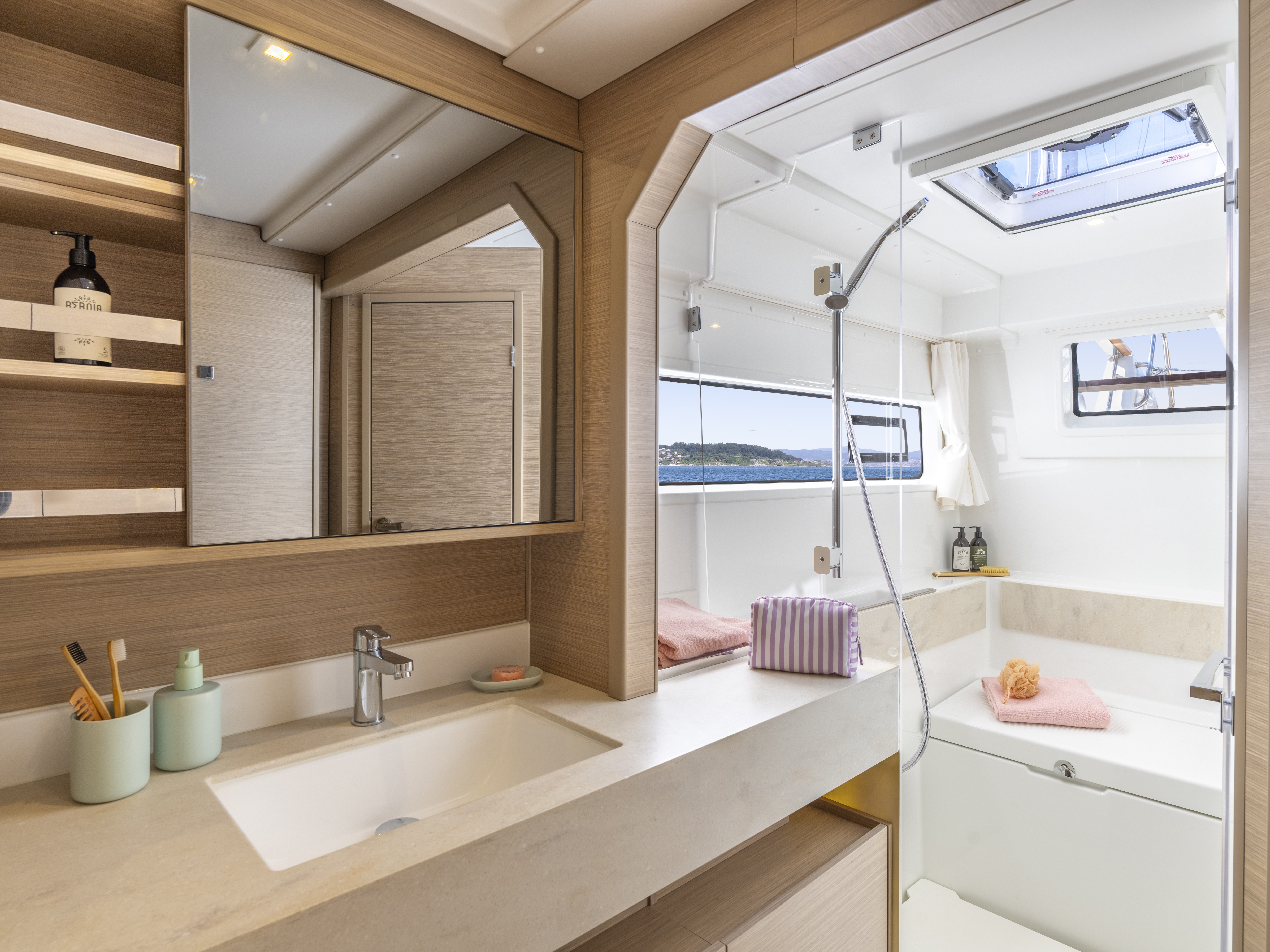 Aft opening porthole in bathroom