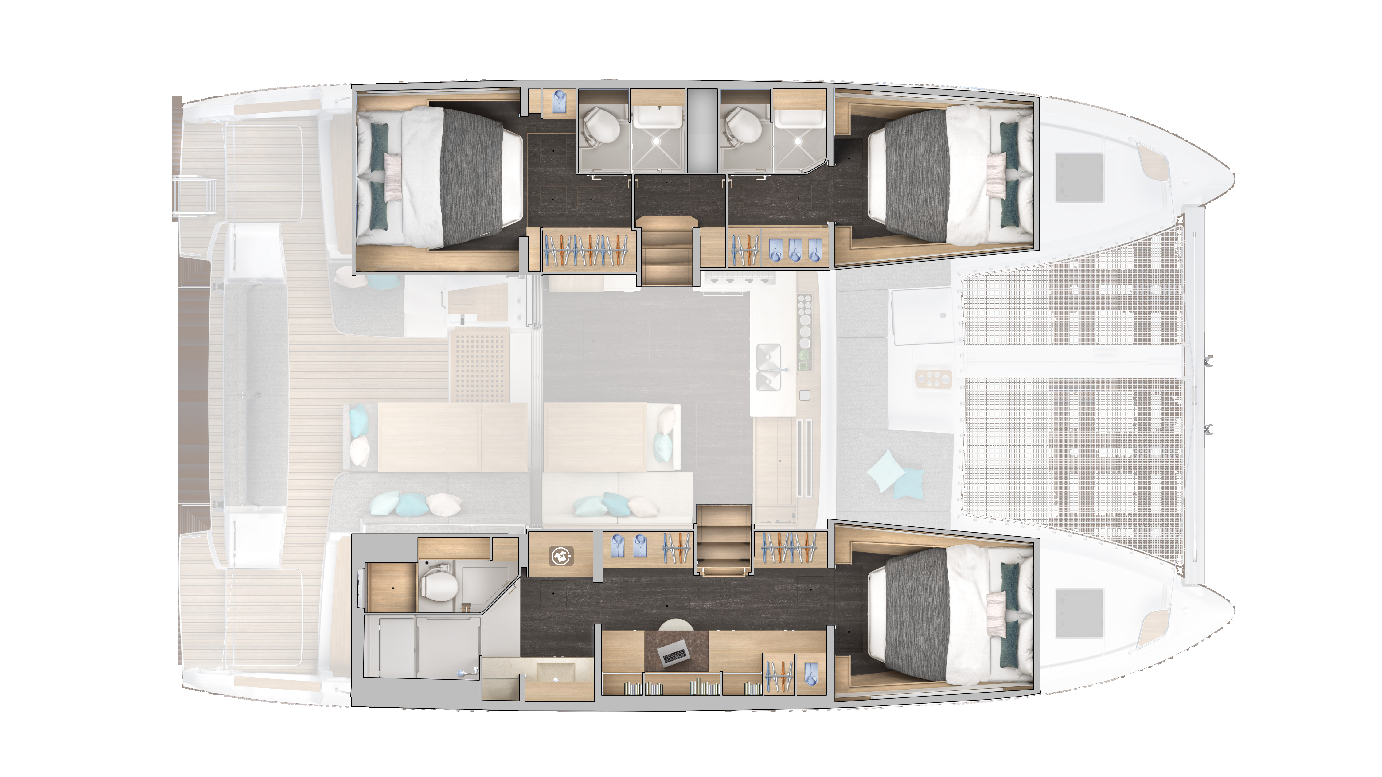With a newly designed hull to give maximum volume, more space is given in every cabin and living spaces are optimised for maximum comfort. In the three cabin layout a large forward berth in the starboard hull and a large shower room aft, means you can sleep in comfort undisturbed by engine noise. The 'Owner's hull' can be closed off giving a private sanctuary onboard. Two spacious double cabins with en suite heads are situated in the port hull, giving each guest their individual and luxurious space onboard. The open saloon allows for optimal flow between the interior and exterior living spaces. The optional modular dining area allows the cockpit and saloon tables to combine, thanks to the full width sliding doors, to create an inviting space to accommodate dinner for up to 12 people. The modular design aims to be adaptable to your unique adventure.