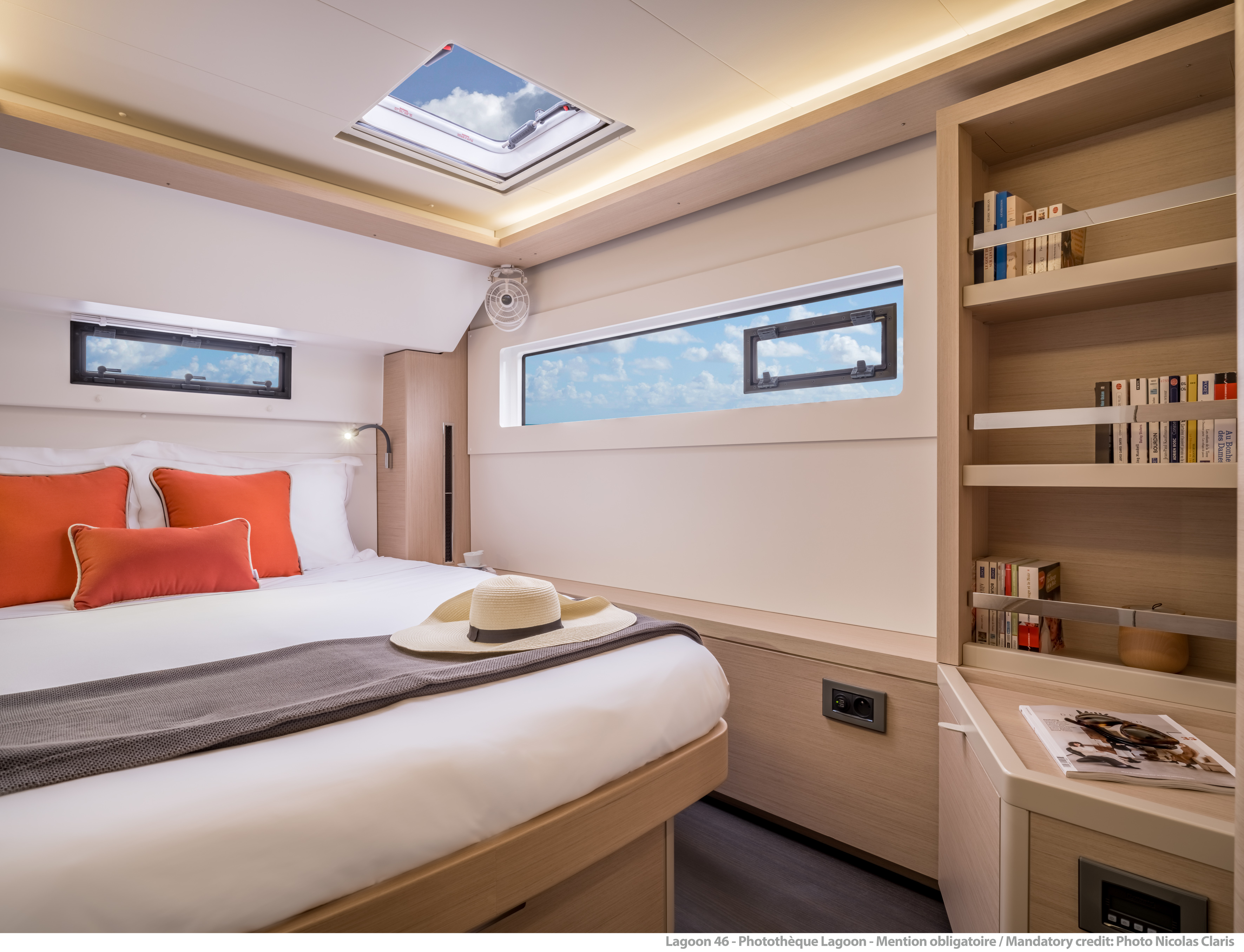 The moment you step inside, you get the impression of being on a much bigger yacht. The area is truly spacious, filled with natural light from large windows all around. Lagoon is dedicated to making use of every single space aboard the Lagoon 46 to provide as much storage as possible, a commitment reflected in every living space aboard this catamaran. From the impressively spacious cabins and their respective bathrooms to the multipurpose cockpits, you will find possibilities for storage in the most unexpected places.