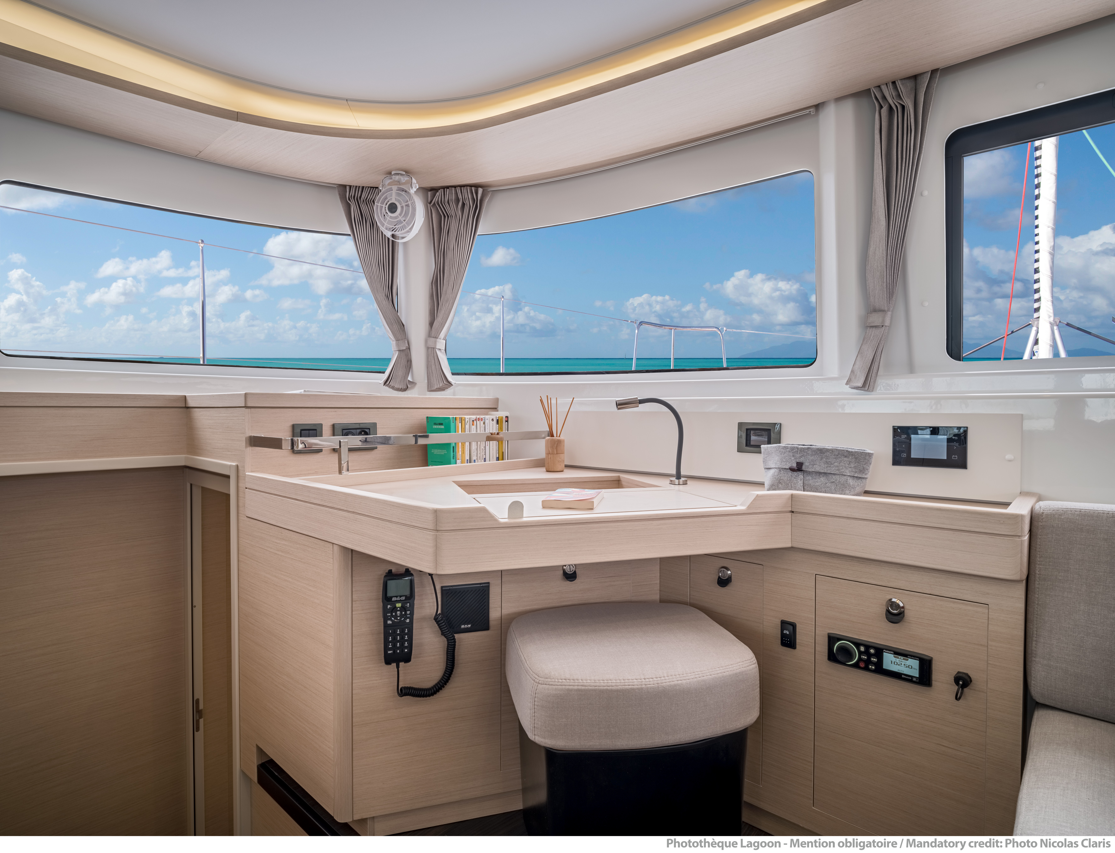 The Lagoon 46 is characterized by large and generous spaces, all easily accessible and carefully planned out. The comfortable and spacious flybridge, accessible from two points, is no doubt one of the main highlights on this model. Up here, you have great visibility, while also being protected from both sun and wind, and it’s a wonderful place to just be, whether you are maneuvering the vessel or simply relaxing. The forward cockpit, another highlight, is great for lounging with friends and family in the late afternoon and it may be transformed into a sunbathing area for ultimate comfort during daytime. It also has large storage areas and windows connecting to the interior.