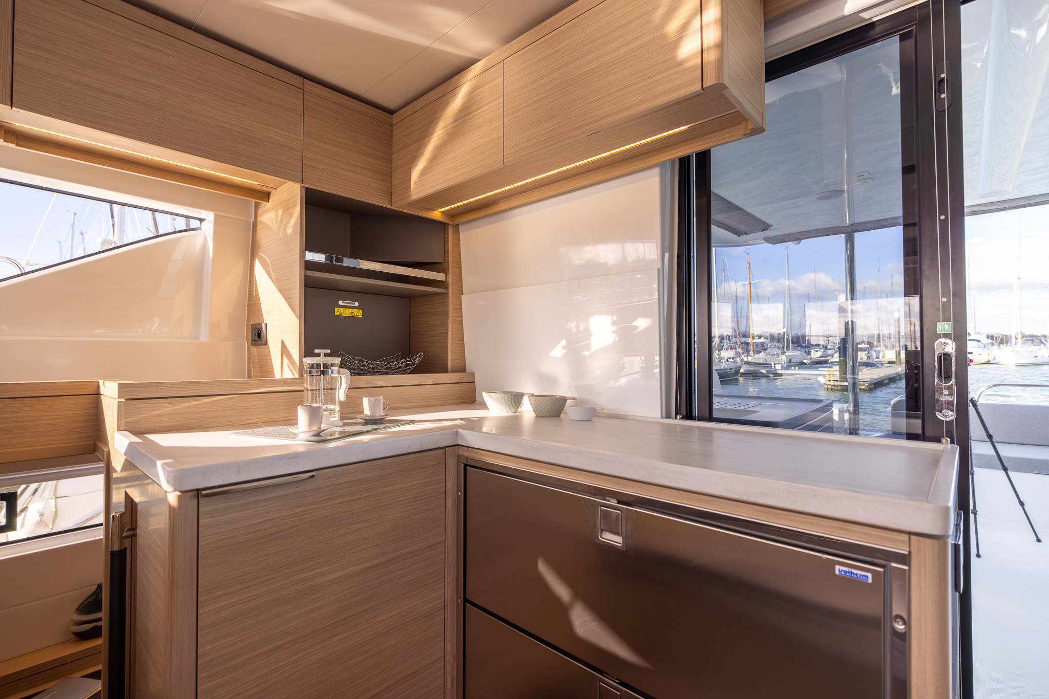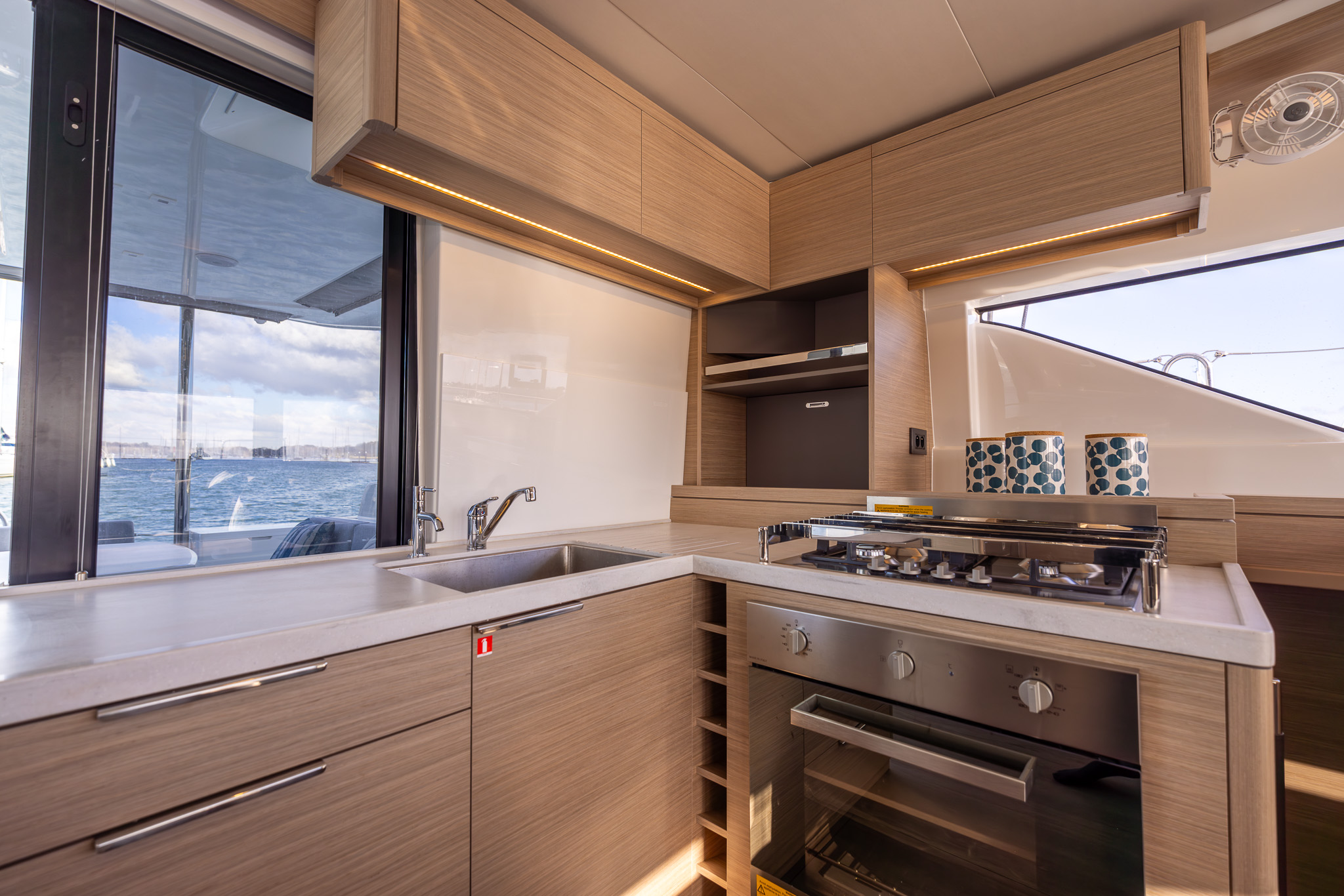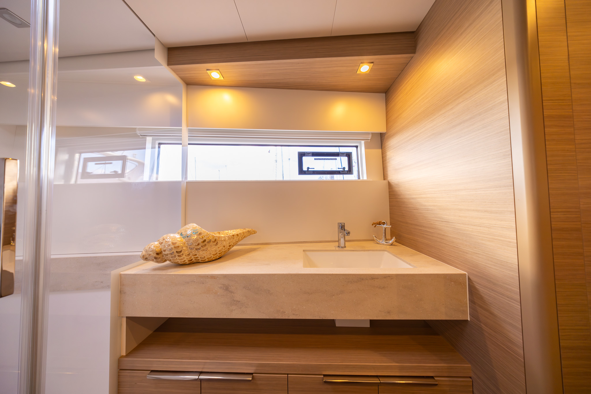 The port hull has two double cabins with en-suite bathrooms and another cabin midship