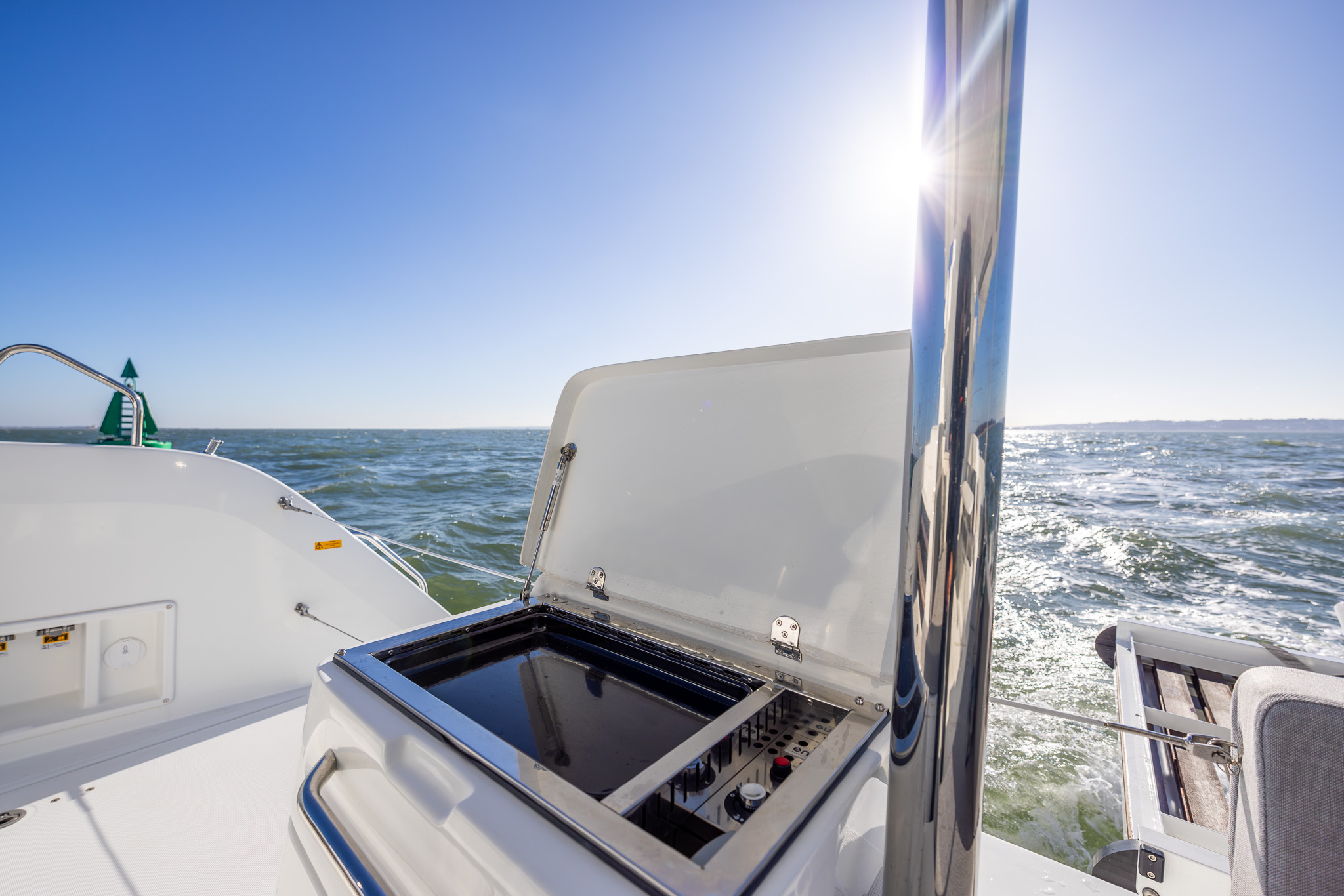 Powered by Yanmar 80hp engines with folding props, the Lagoon 51 boasts Raymarine electronics, the elegance package, air conditioning, a generator, composite flybridge bimini, and a tender-lift platform, among other premium features.
