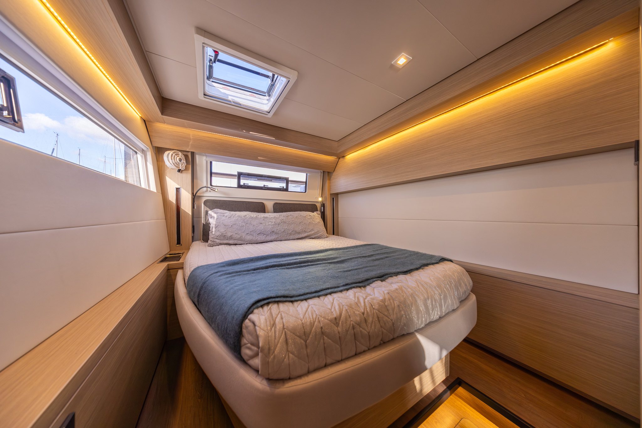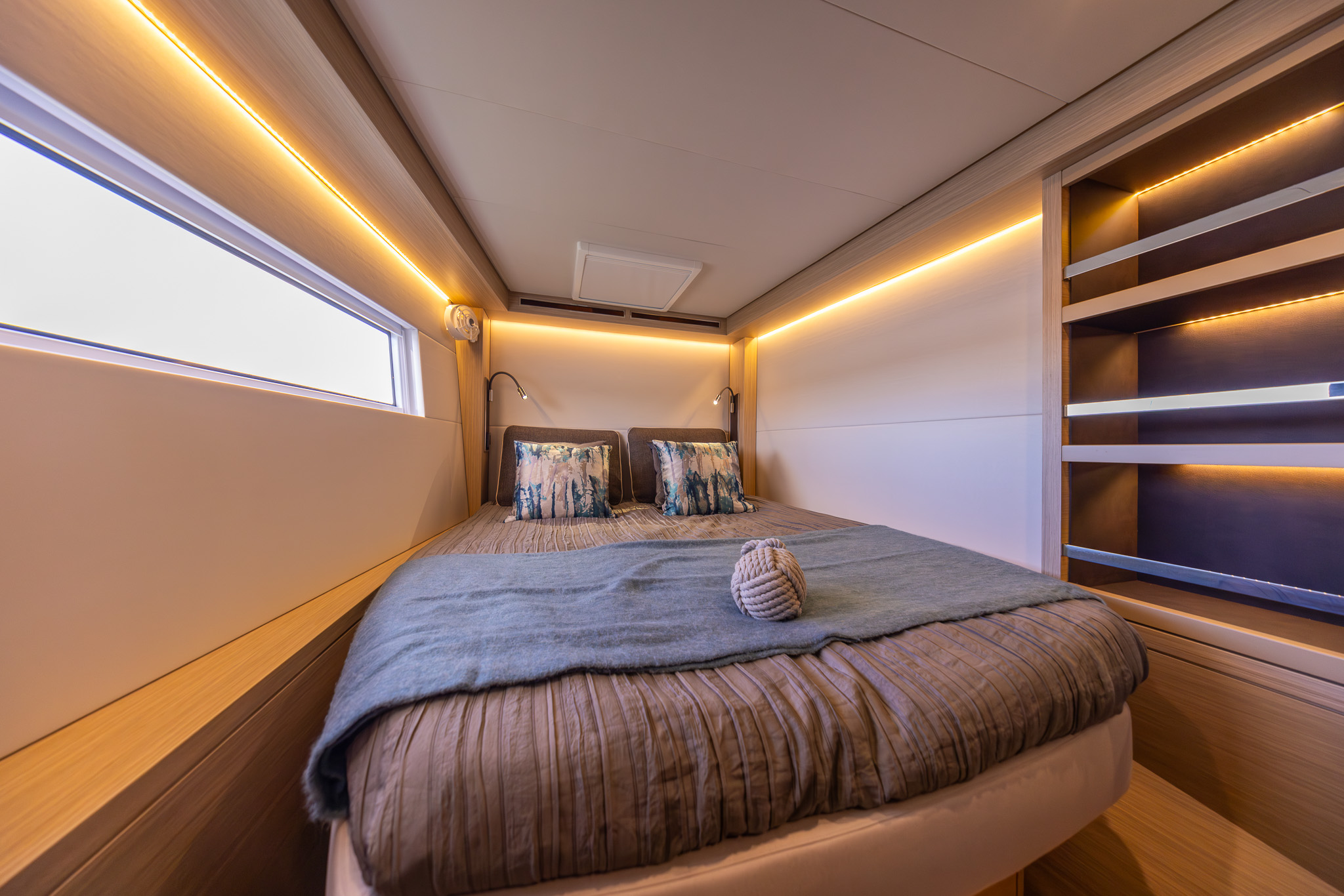 The owner's suite occupies the entire starboard hull with a large dressing room amidship