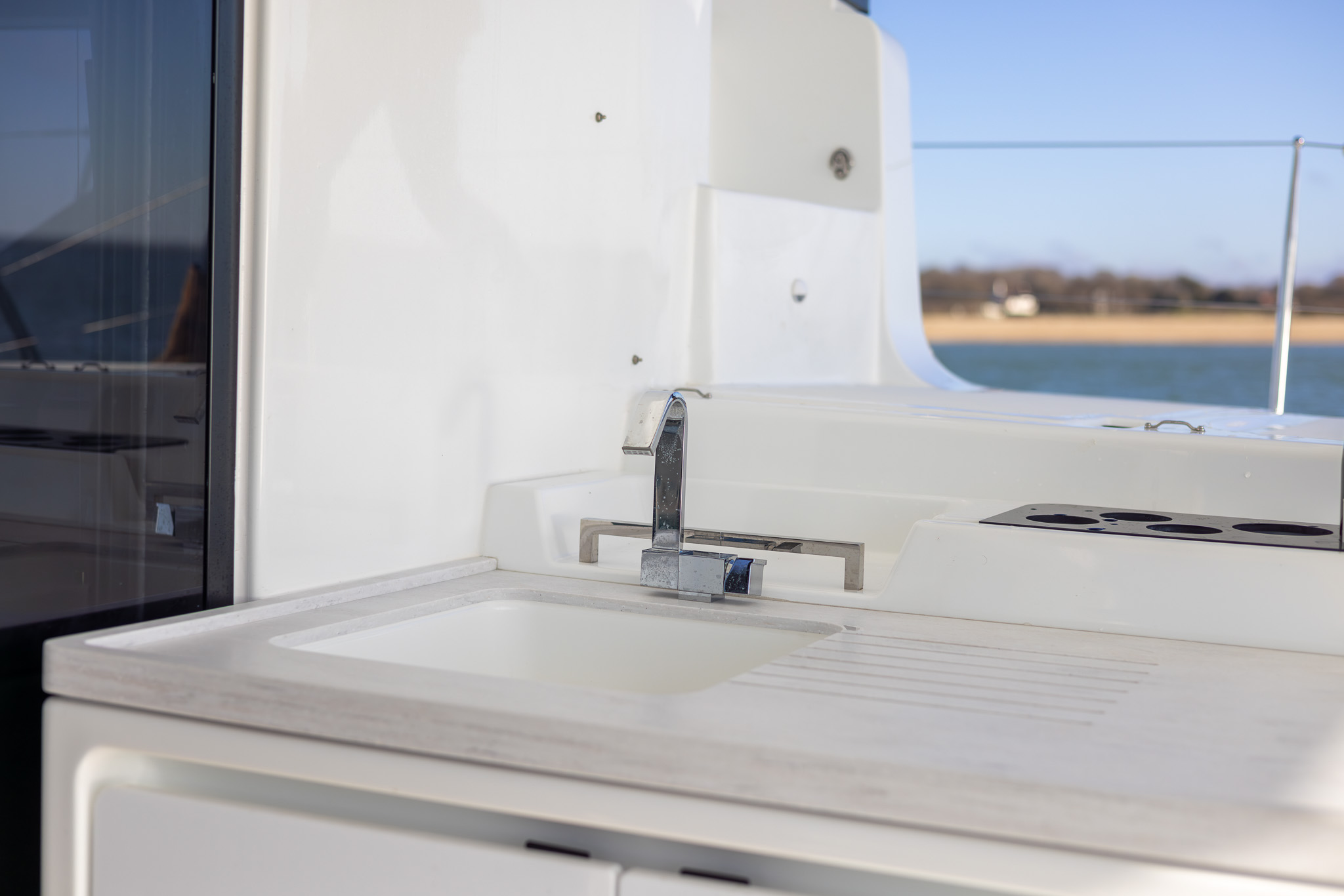 Swivelling gas BBQ at starboard transom with matching storage module to port