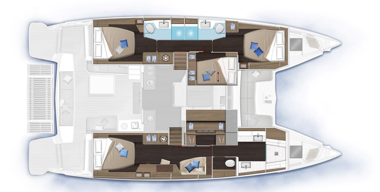 This example spec features a fully-equipped Owner's suite in the starboard hull, with a luxurious cabin, heads, and dressing room. The port hull accommodates three double cabins, with a spacious saloon and galley centrally located, complemented by a large aft cockpit.