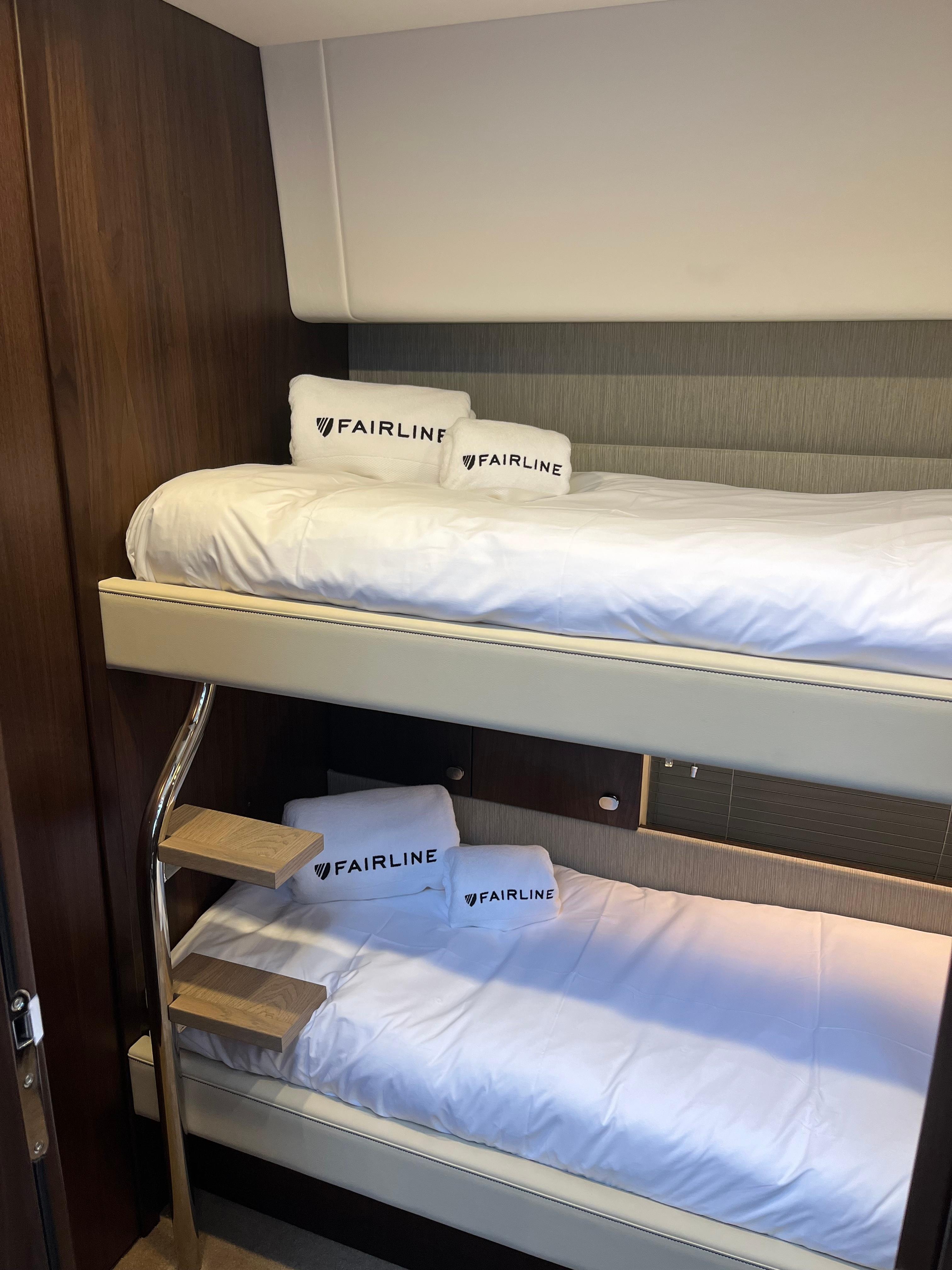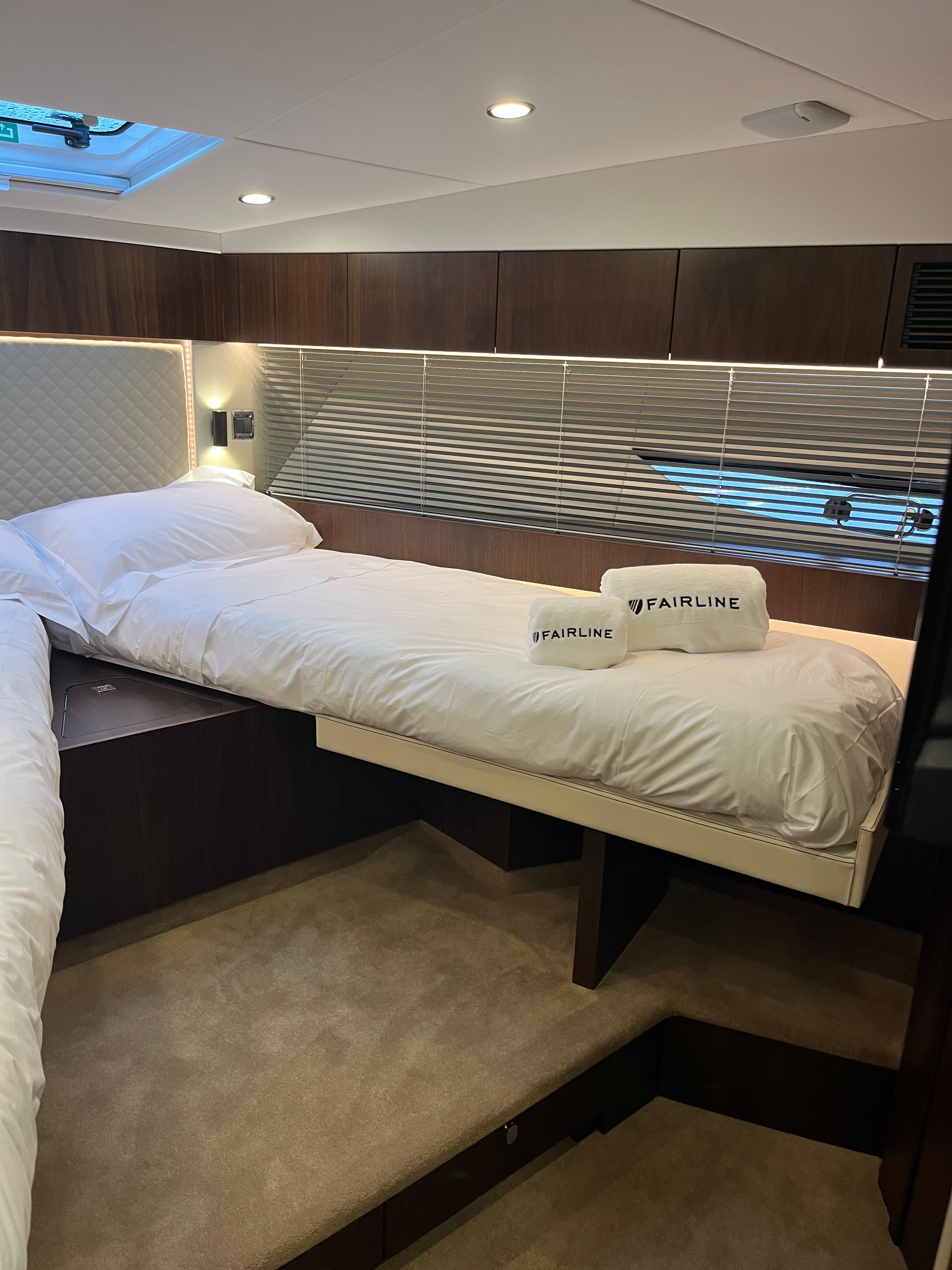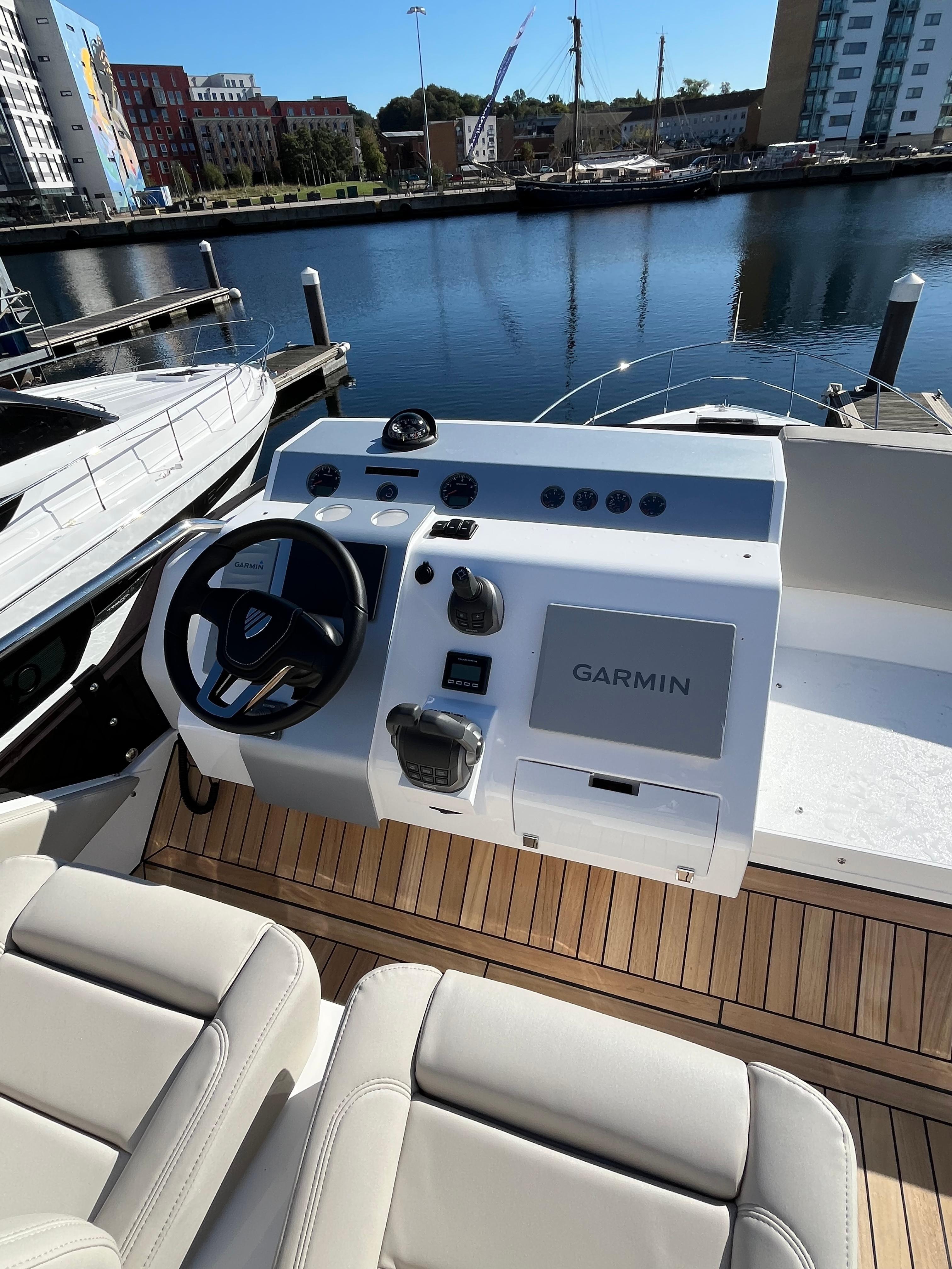 New Fairline Squadron 50 from 2024 / 2025 model with immediate delivery, VAT not paid (net sale possible) and full warranty. This MY is equipped with the Volvo Penta D8-IPS700 diesel engines, each with 550hp, as well as a bow thruster making maneuvering a breeze. With a cruising speed of around 23kn, the engines run at 2,300 rpm and a combined consumption of approximately 130l/h, the maximum speed is an impressive 32kn at 2,900 rpm.