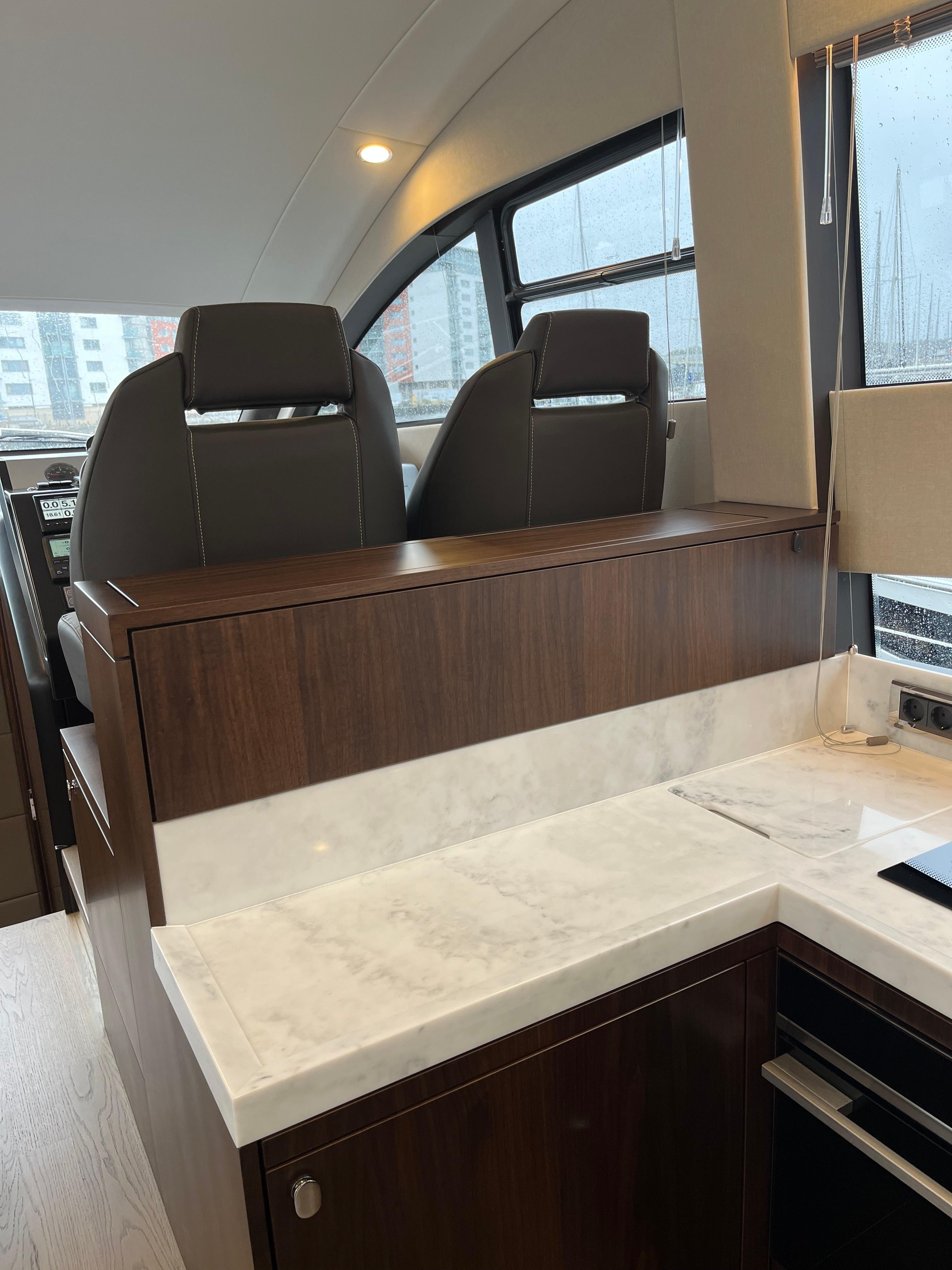 On deck level towards the cockpit there is a bright and spacious saloon with a fully-equipped kitchen to starboard side, allowing for easy serving when seated outside. Opposite the helm station there is a separate seating area and electrically-operated windows to facilitate natural ventilation