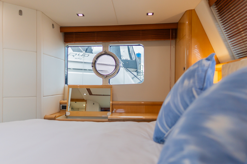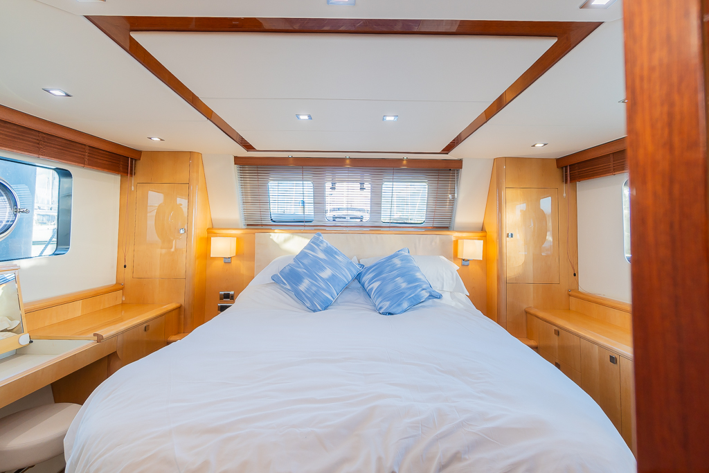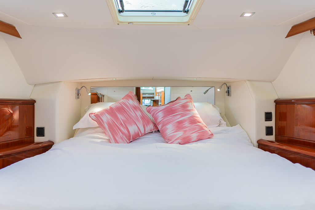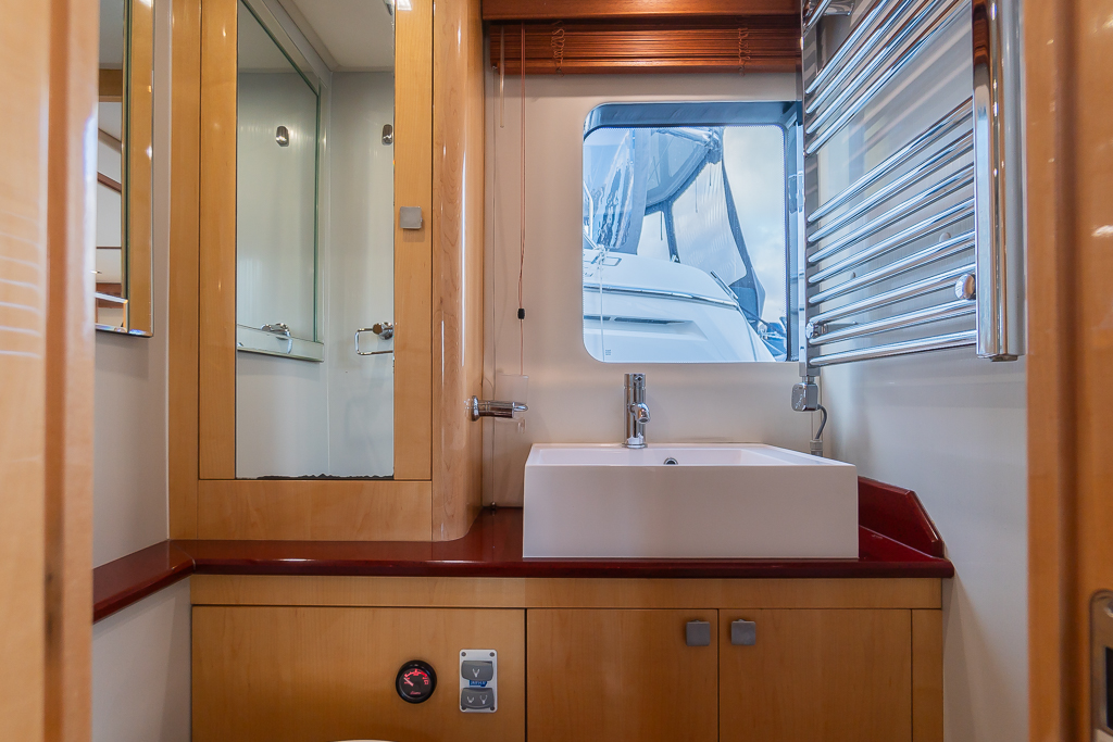 Master cabin aft with spacious island walk-around double berth, storage under berth, dressing table with mirror, hanging storage, down-lights, reading lights, opening portholes and hatches. Master cabin ensuite with Jabsco electric vacu-flush toilet, storage with mirror, sink and towel radiator. Separate master ensuite shower compartment.