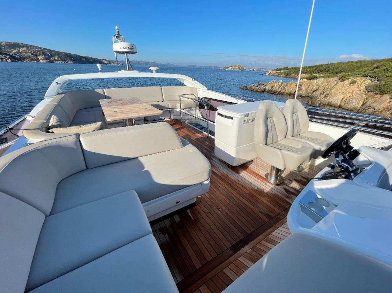 Teak-laid transom platform, cockpit deck, flybridge stairway and steps to side deck Self-stowing 25kg/55lb Delta anchor with 100 m of chain Reversible electric anchor winch with foredeck and helm position controls Foredeck seating and sunbathing area Stainless steel cleats, fairleads and handrails Dual station remote control searchlight Freshwater deck/anchor wash Storage lockers for fenders and ropes LED deck level lightingCockpit