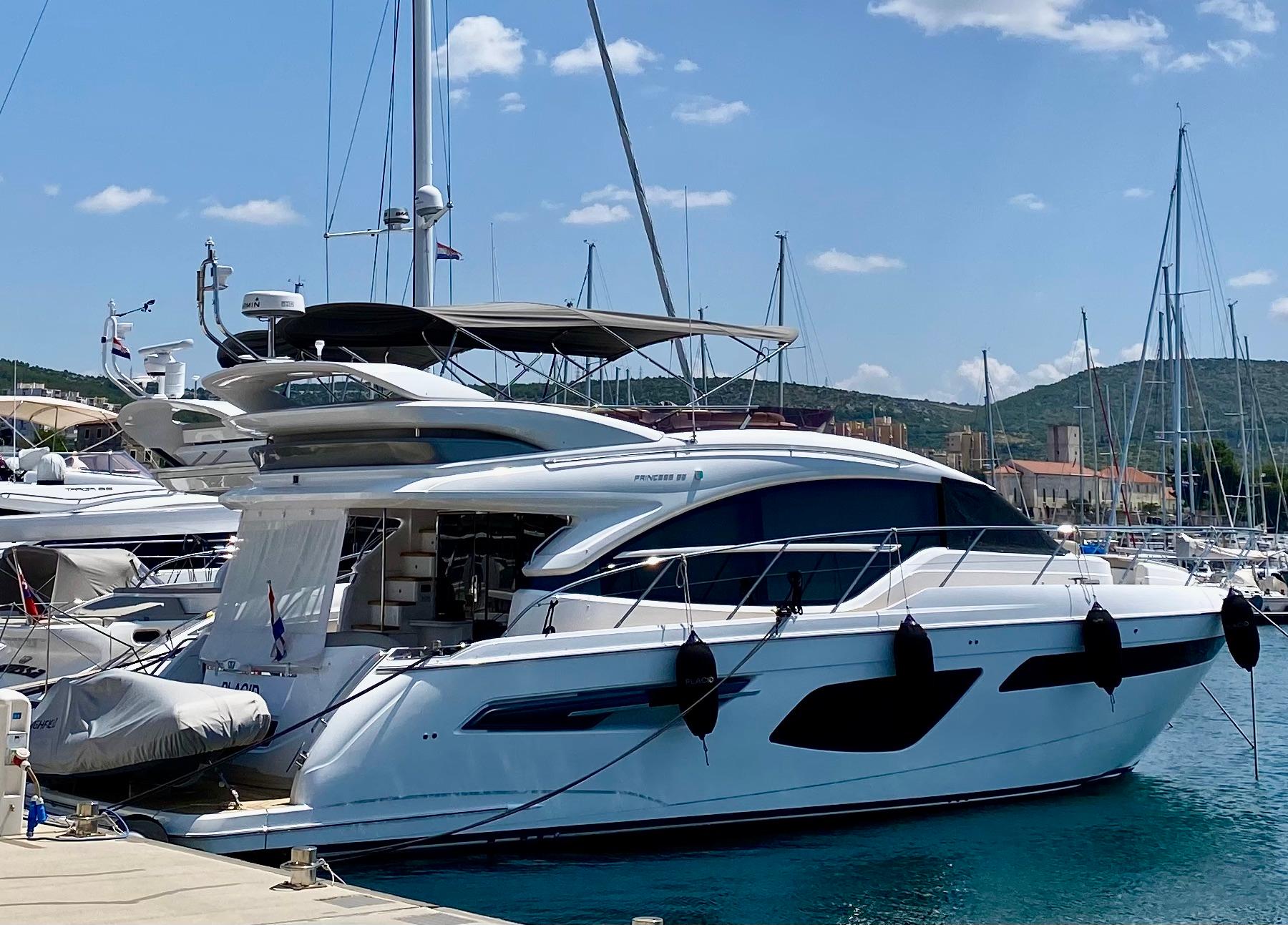 The offered Princess F55 is immediately available at a very competitive price! Fully equipped in excellent condition with all desired options. Stunning interior in light Oak with Timber Flooring in Galley and Saloon. Full Teak Deck, Seakeeper NG9 Gyro Stabilization, 3x Joystick Control, Hydraulic Bathing Platform, Air Conditioning and 17,5 kW Onan Generator. Launched in 2019 and approx. 733 engine hours only. In 2025 new high-speed Antifouling, Propspeed, new Service and Engine Batteries as well as 2,5 kW Inverter for all sockets and Remote for aft Platform, Watermaker Evo 200 l/h, Highfield CL 340 Hypelon + Honda 20HP