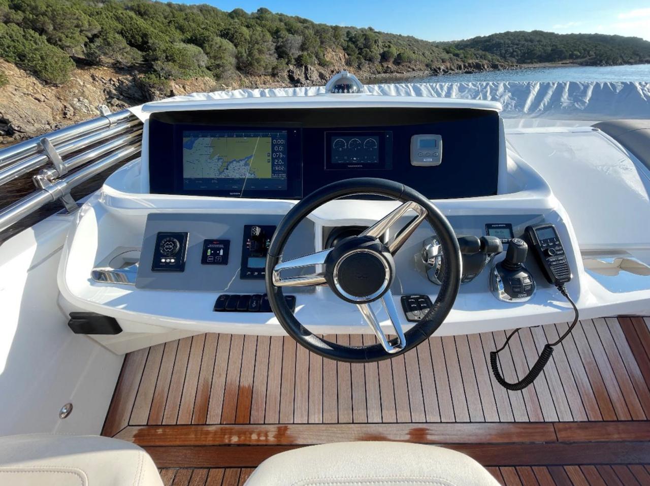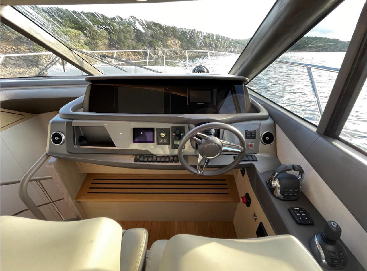 Twin helm seats with fore and aft adjustment for helmsman Electric opening window Full engine instrumentation including fuel gauges, exhaust temperature and engine warning system and rudder position indicator Navigation system including VHF/RT, speed and distance log, echo sounder with alarm, autopilot and high-speed magnetic compass Controls for joystick, bow thrusters, windscreen wipers, bilge pump and trim tab with indicators 24v and 240v electrical control panel Black mesh sunscreens USB connection point Red night lightingBeschreibung auf Deutsch