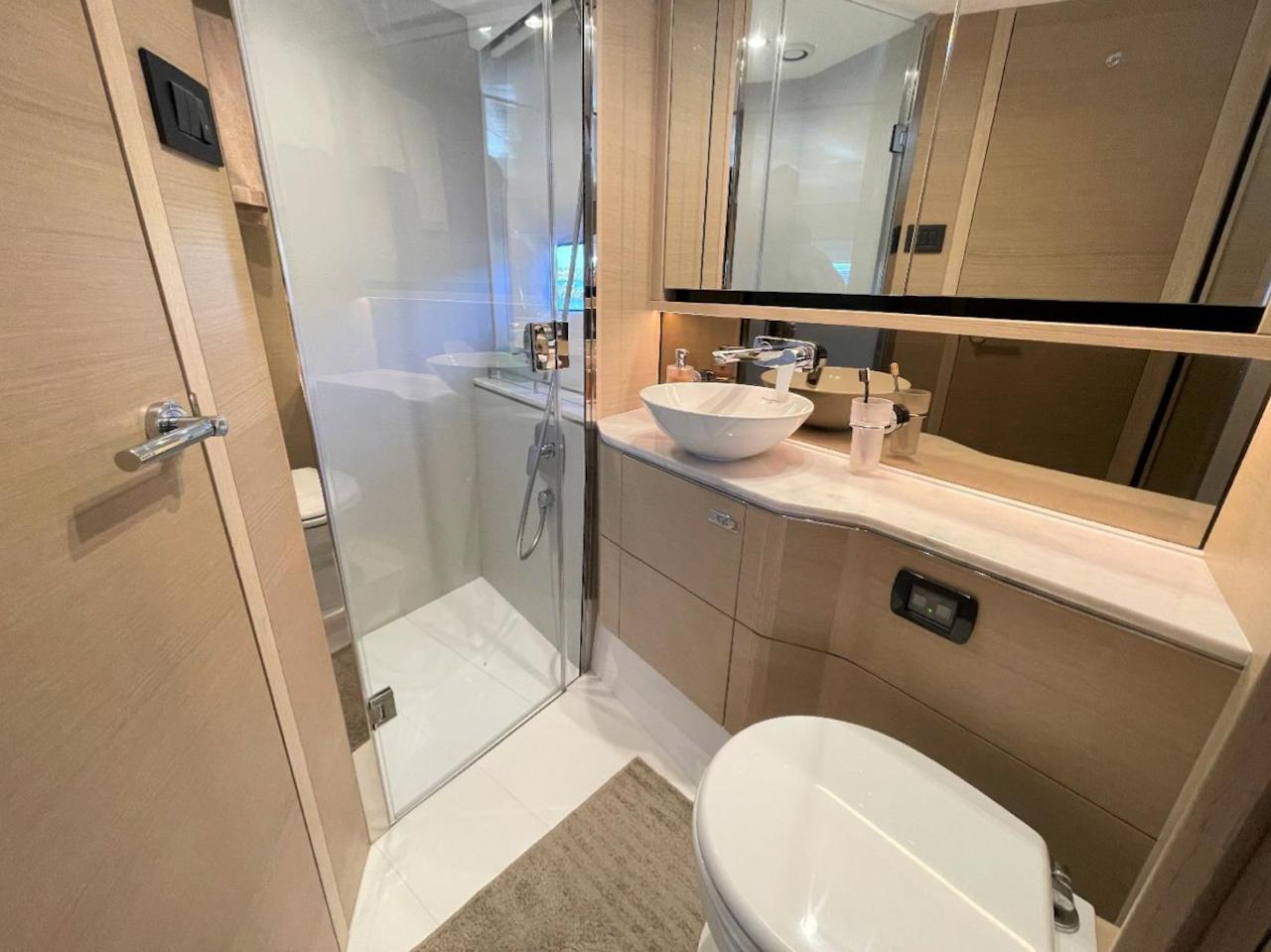 From the moment you step aboard her teak decking, luxurious space is a constant companion. Her 17.80m2 flybridge enjoys a convertible sunbed, twin helm seats, a wetbar and ergonomic dining areas. Vast panoramic saloon windows and signature wrap around front screens offer uninterrupted vistas from the main deck whilst expansive hull windows generously flood her accommodation areas with light. This oasis of calm can then be propelled to a top speed approaching 33 knots, and all with nimble composure. Magnificent performance and uncompromising comfort in equal measure.