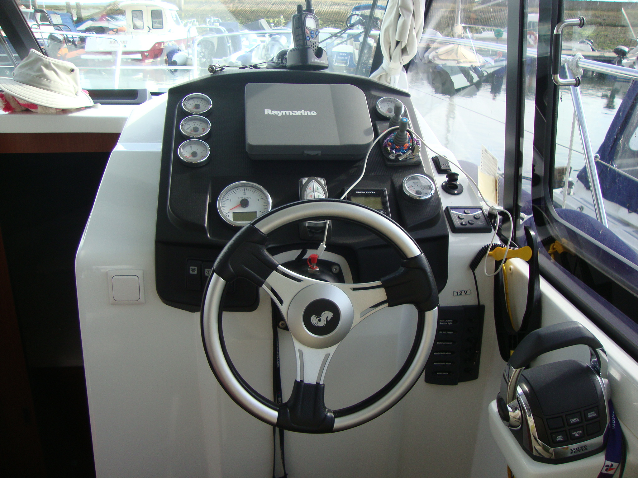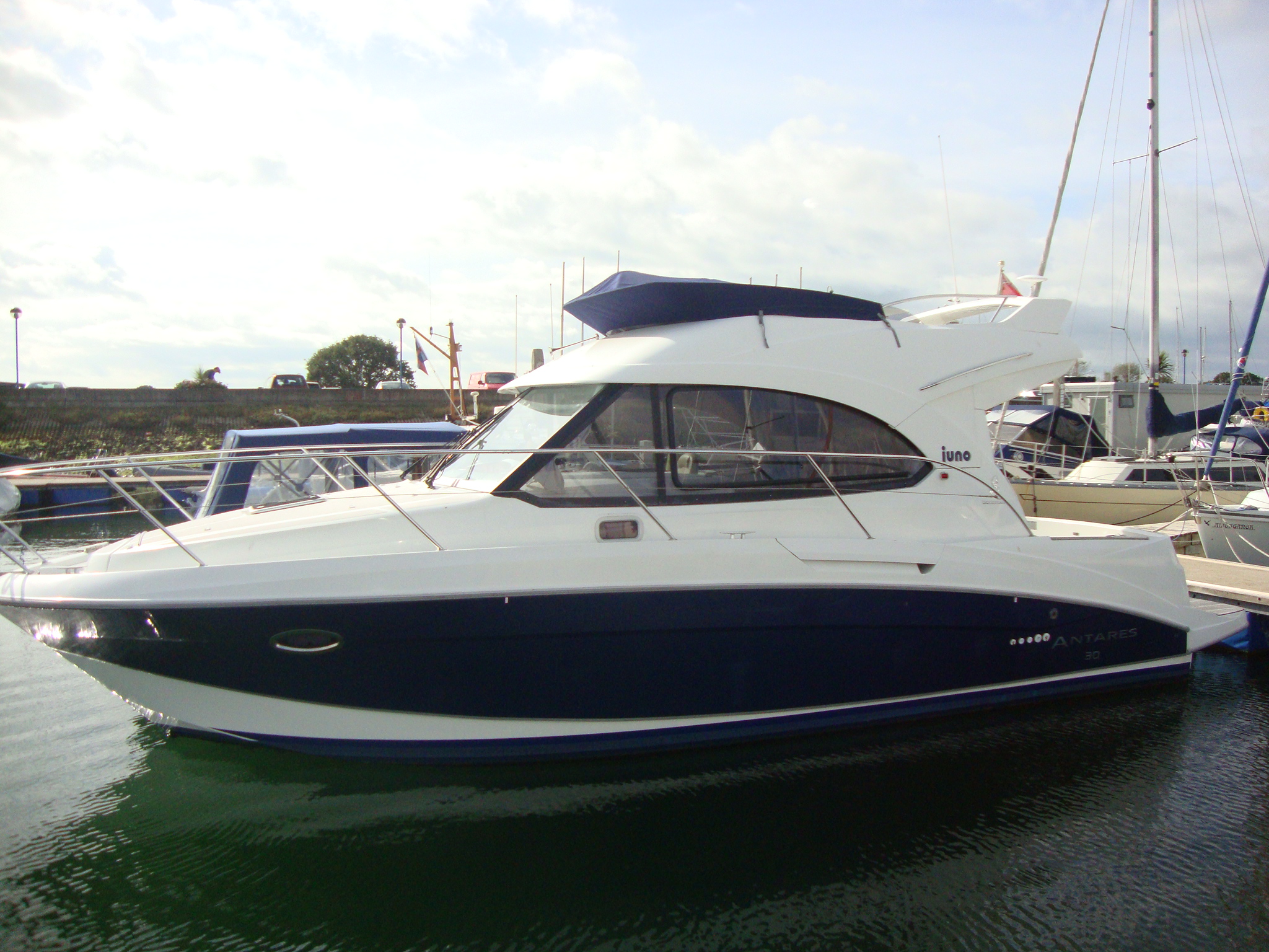 Beneteau Antares 30 built in France in 2011. Pocket flybridge cruiser with Volvo D6 370 shaft drive engine and blue hull. Sleeps six in two cabins plus the saloon. Electric windlass, bow and stern thrusters and Raymarine plotter.