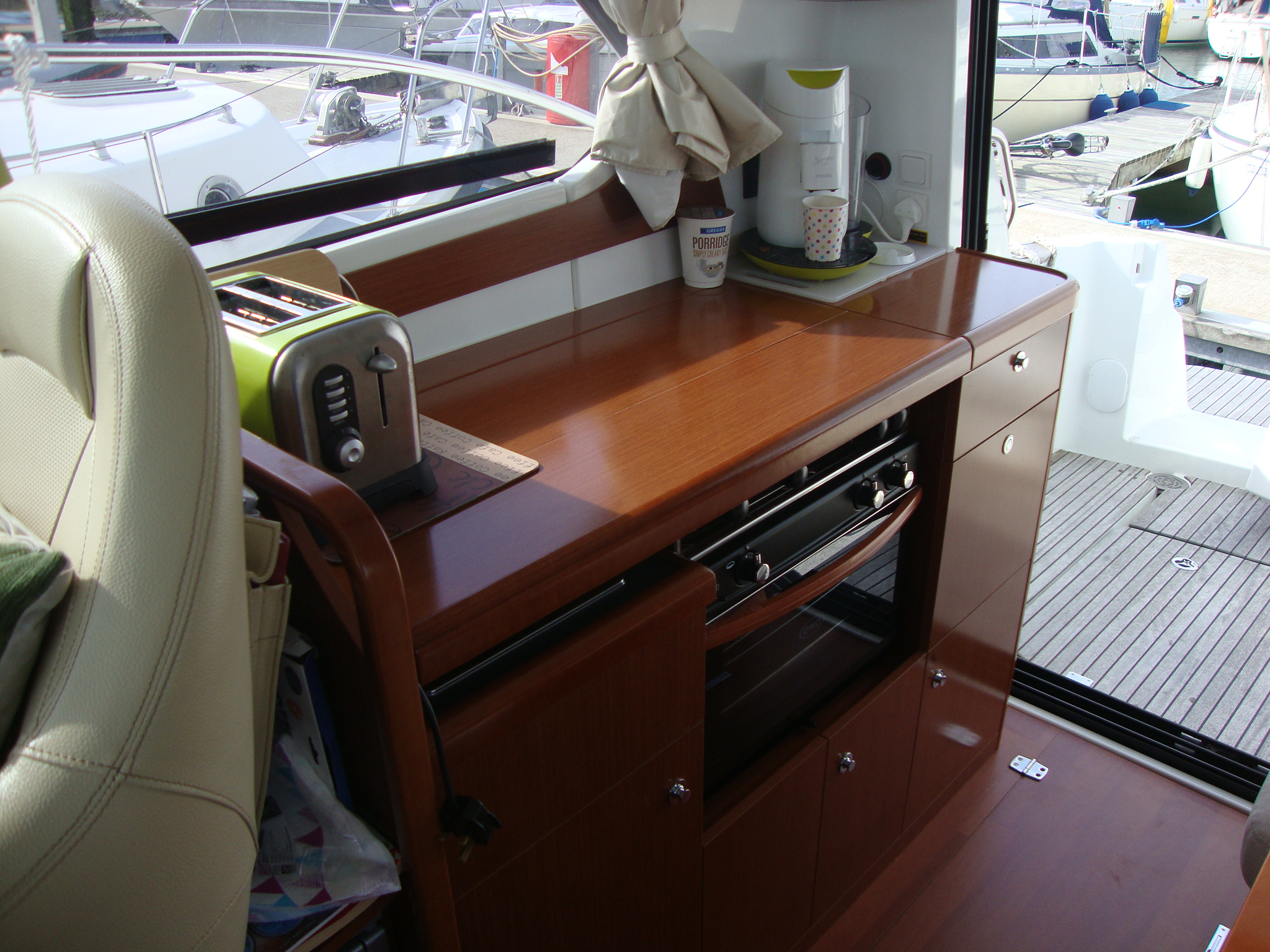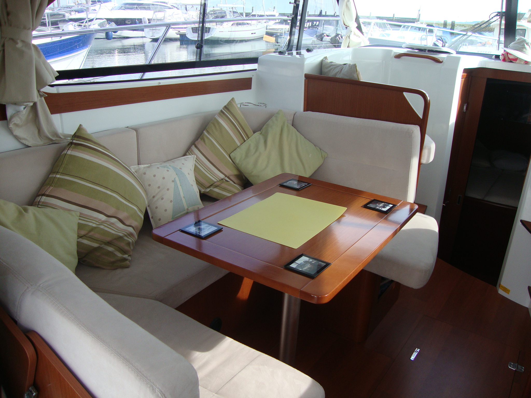 U-shaped dinette to port(converts to a double berth) storage lockers, table and co-pilot seat in front.