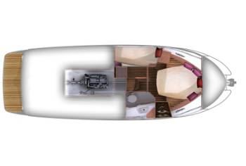 Forward cabin with double centre line berth, hanging locker, storage lockers under berth and cabin access through sliding door.