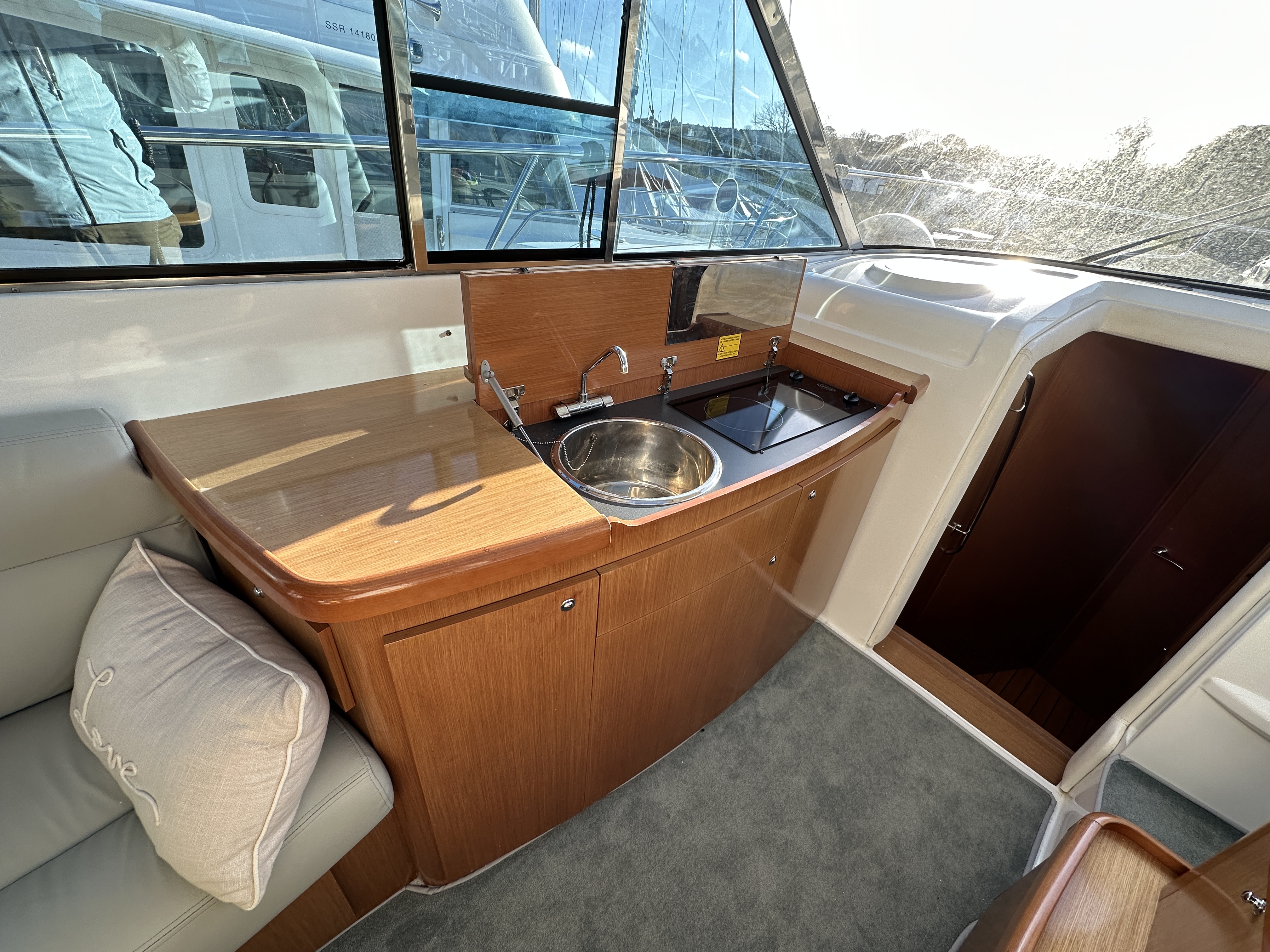 electric sunroof, double helm seat with a u shaped seating arrangement for dinning. The Galley is also in this
