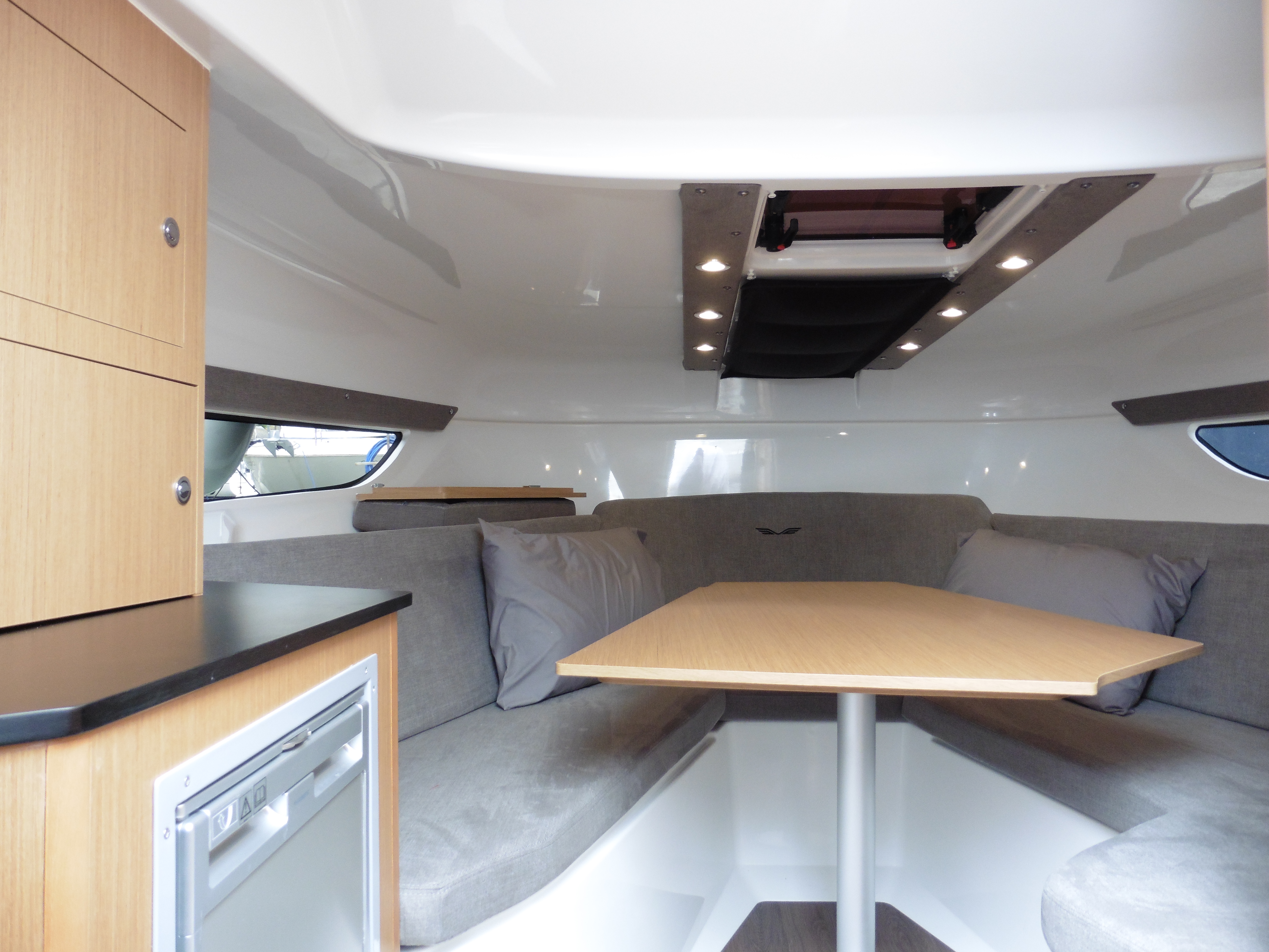 White GRP deck and topsides with black trim panels