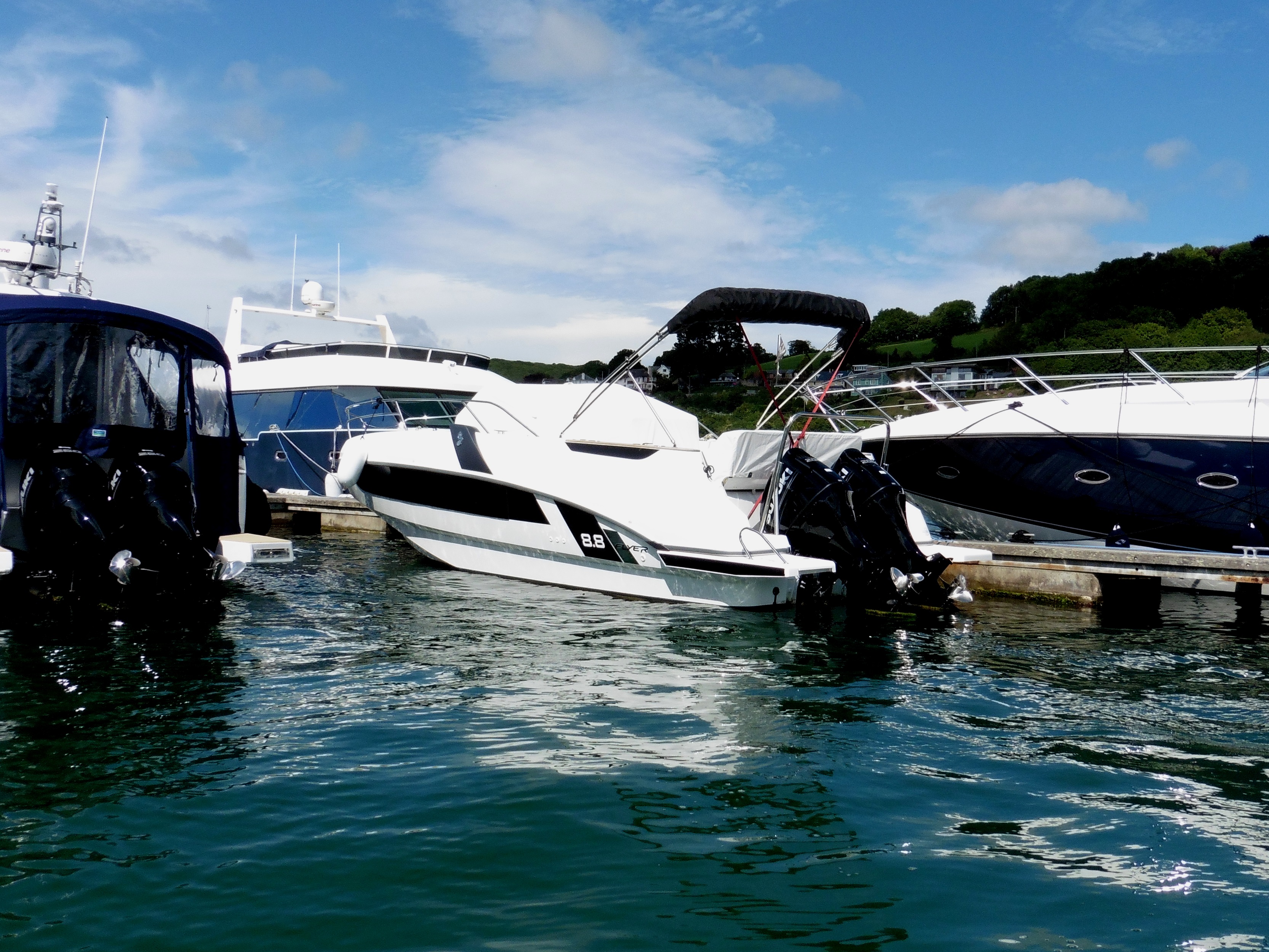 The Flyer 8.8 is as shining example in the versatile dayboat world, a well thought out cockpit with plenty of seating is complimented by the cockpit bimini. The accommodation provides berths for 4 as well as a galley and full heads. Upgraded trims give extras such as automatic trim system, 220V circuit, electric windlass and high quality exterior upholstery. In her second ownership she has had all annual maintenance carried out and limited use means the engines are yet to break the 50 hour mark.