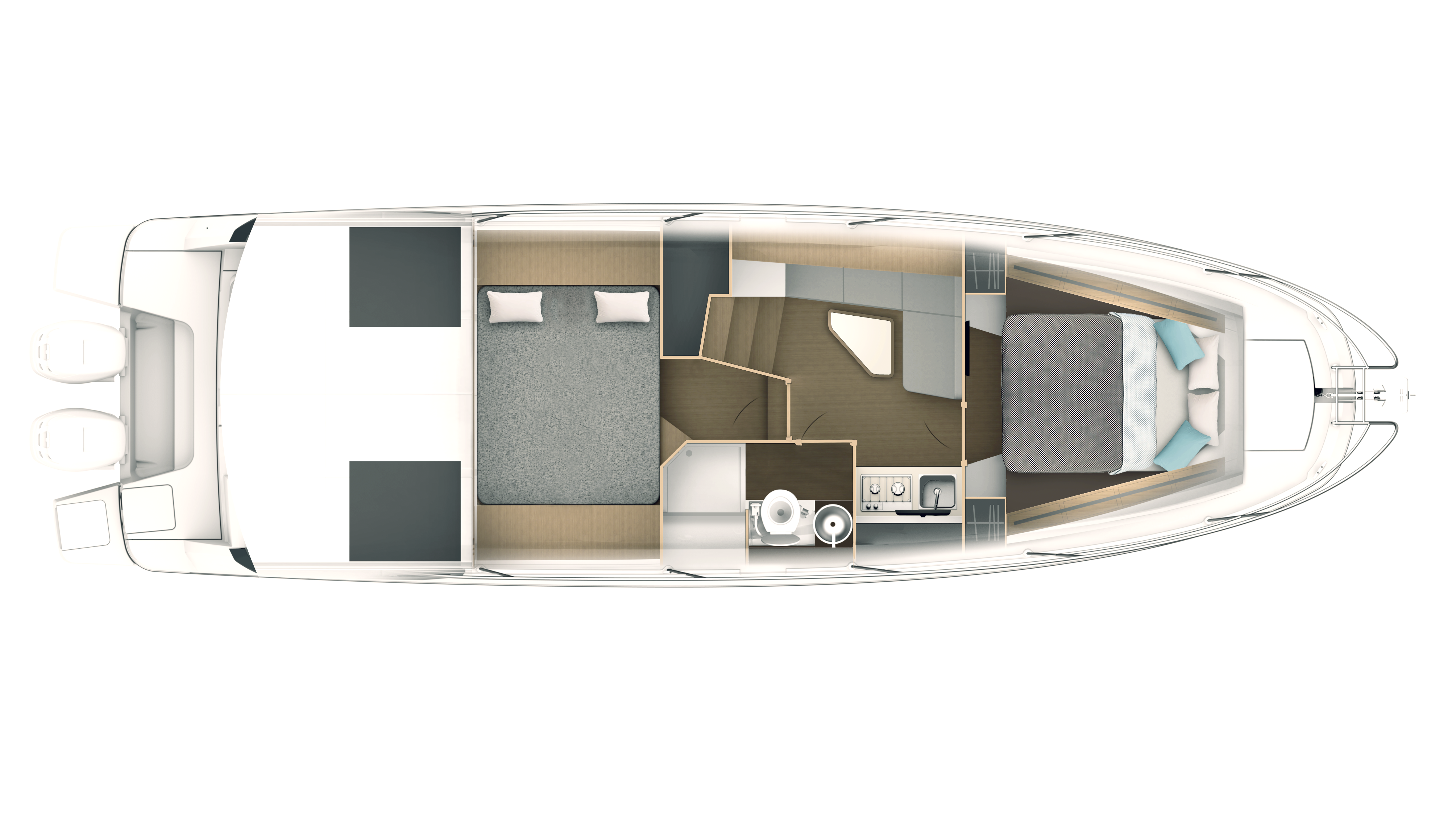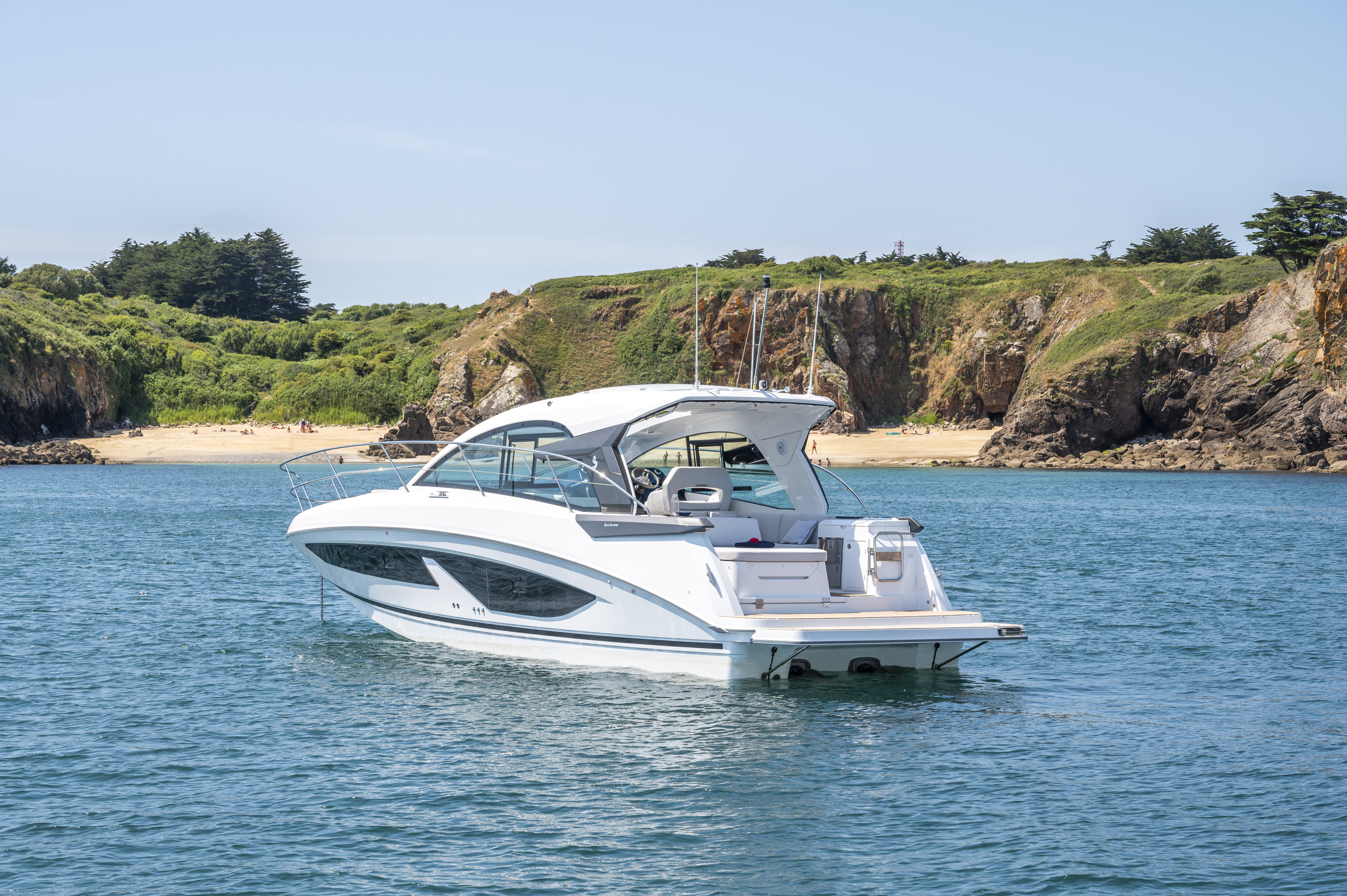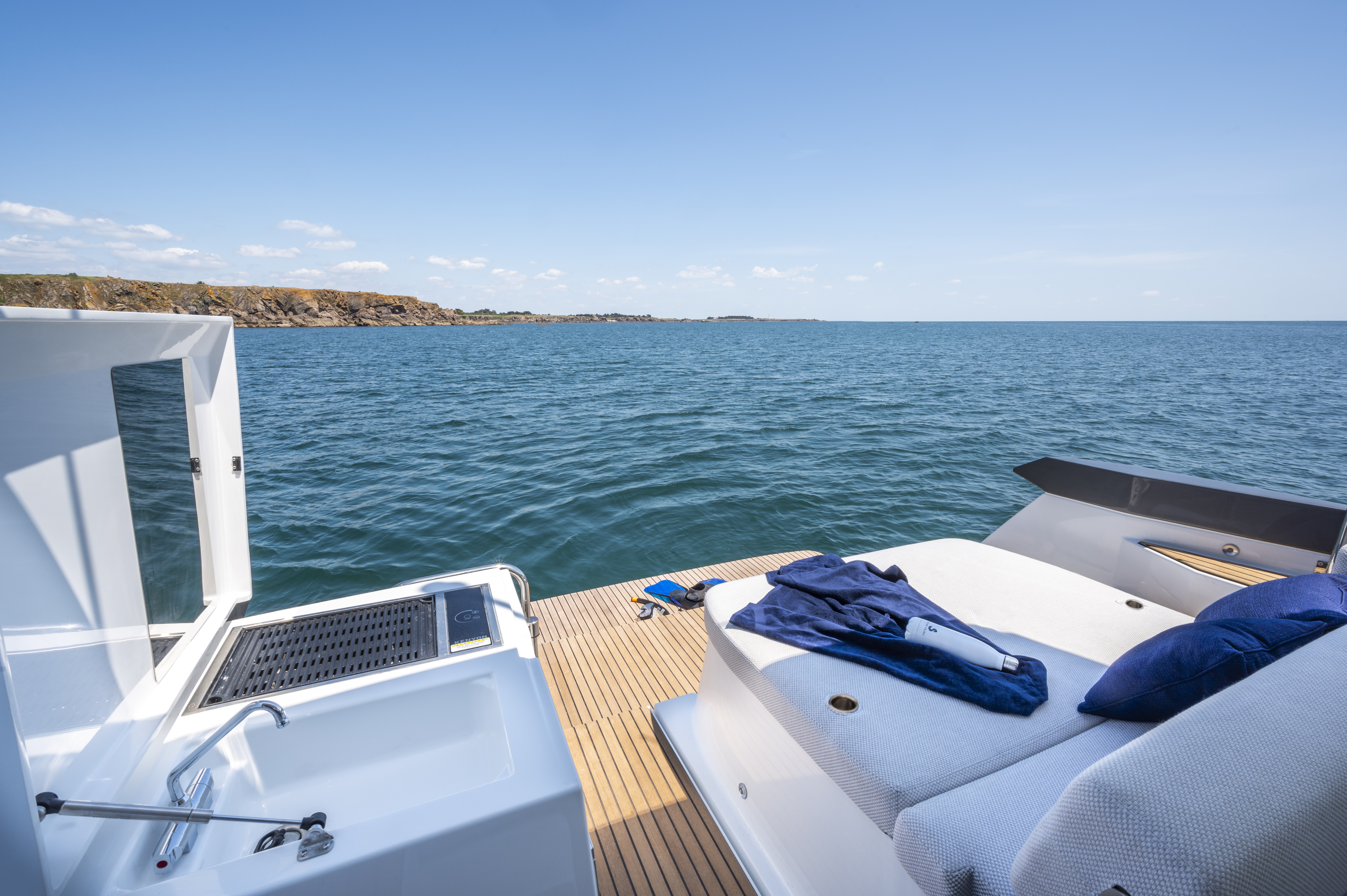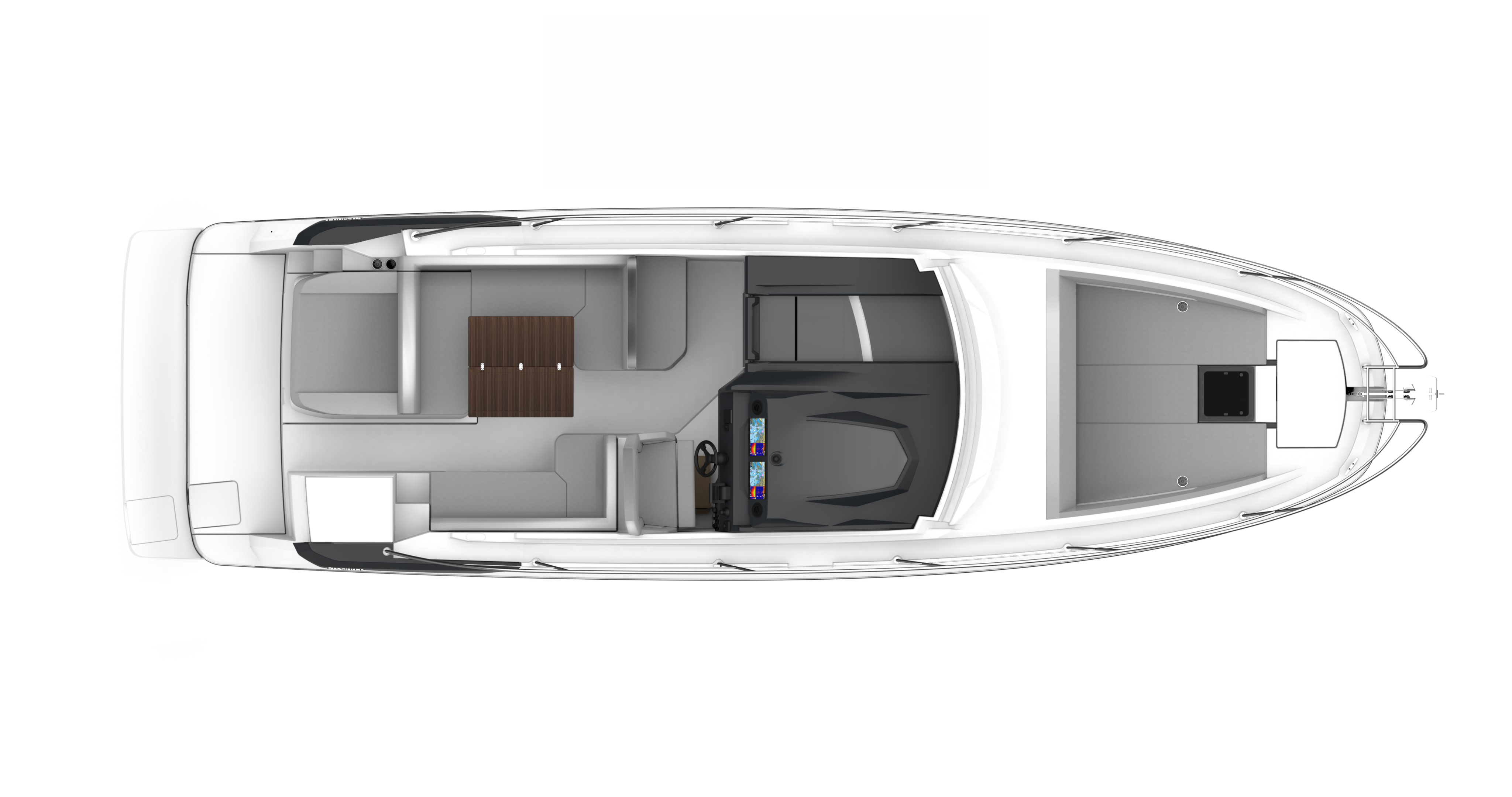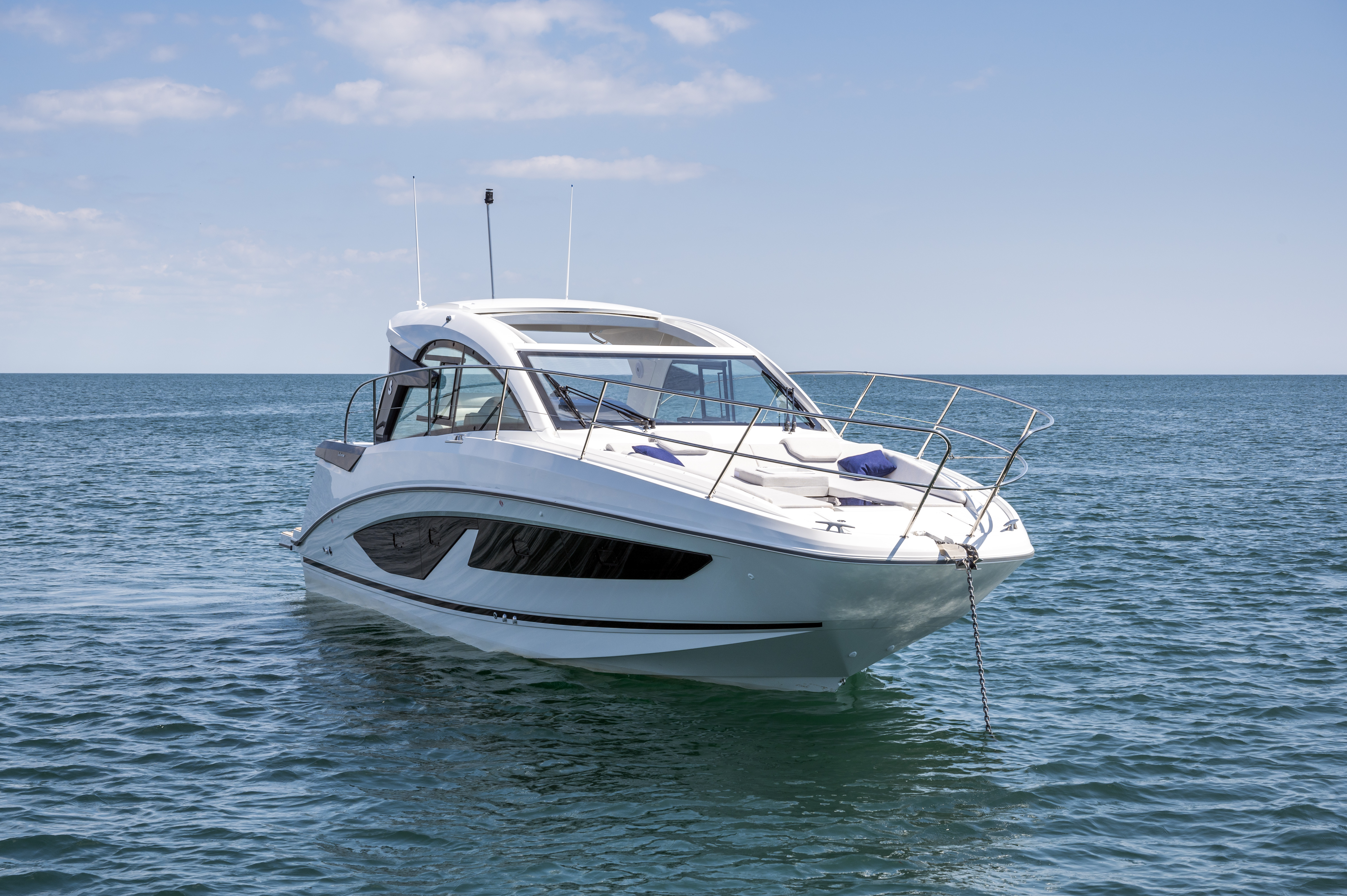 The Gran Turismo 36 maintains the DNA of her range, with the addition of some innovative touches. A large built-in sun mattress on the foredeck provides a safe and very pleasant place to relax when the boat is underway. With an optional sun awning, it will quickly be adopted by anyone addicted to afternoon naps.