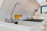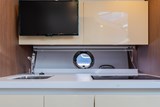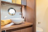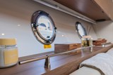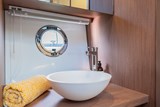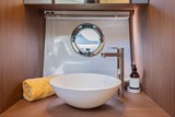 Basin with mixer tap, mirror, storage cupboards and opening porthole