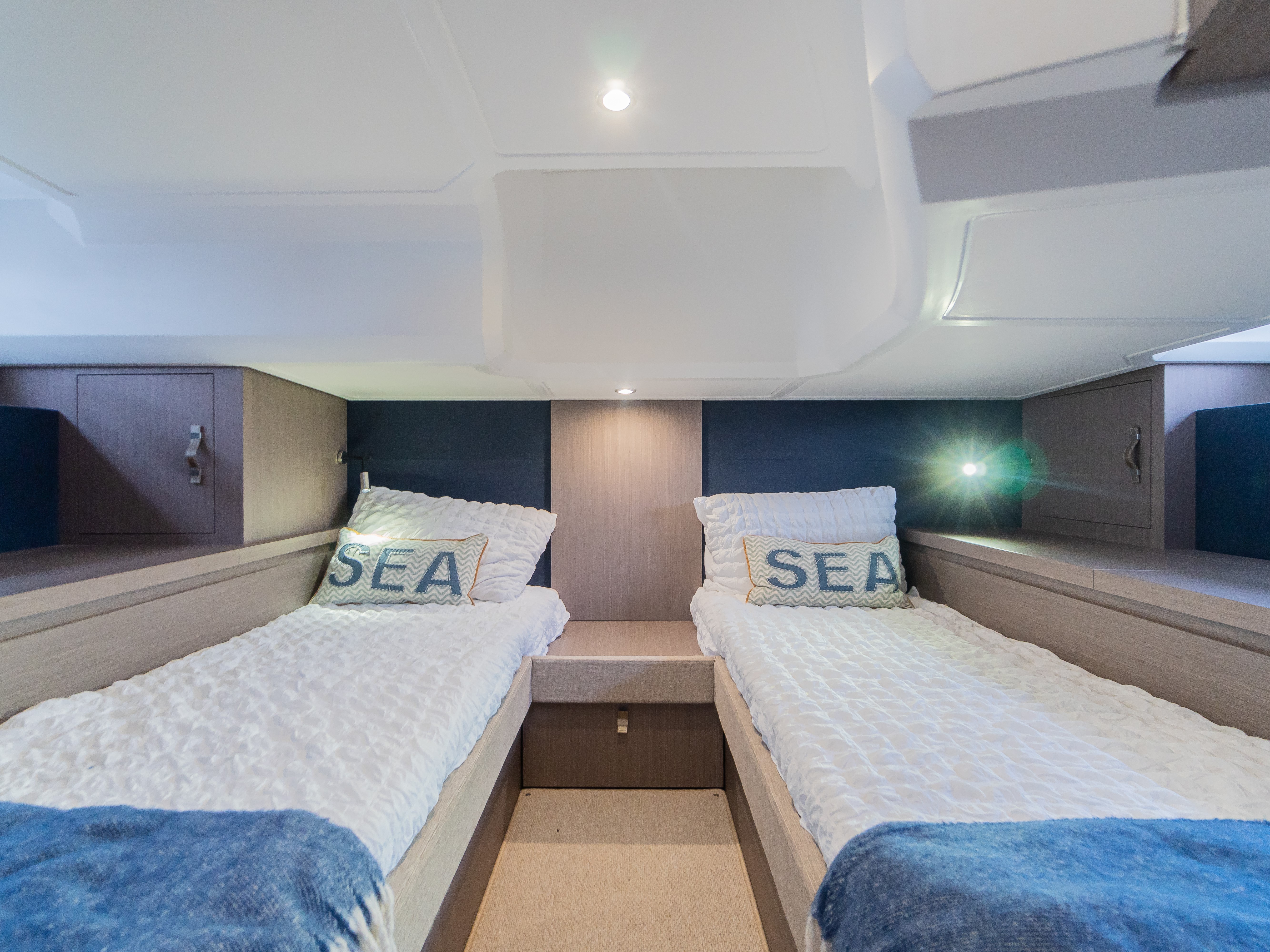 2 single berths which converts to one large double berth (0.7m x 1.95m, 2'4" x 6'5" or 1.4m x 1.95m, 4'7" x 6'5")