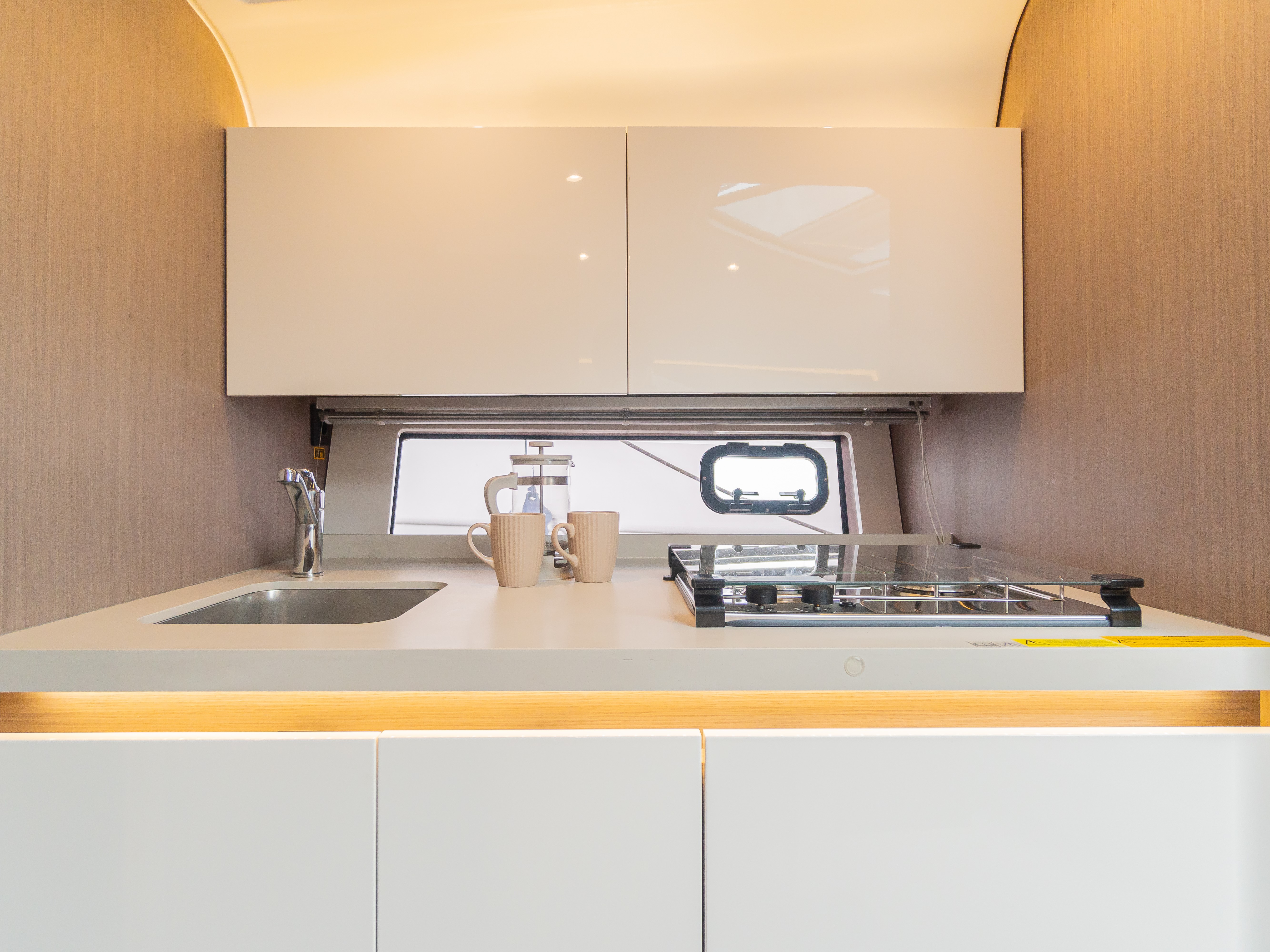 Stainless steel sink with mixer tap, 2 hob gas plate, microwave oven, 80l fridge
