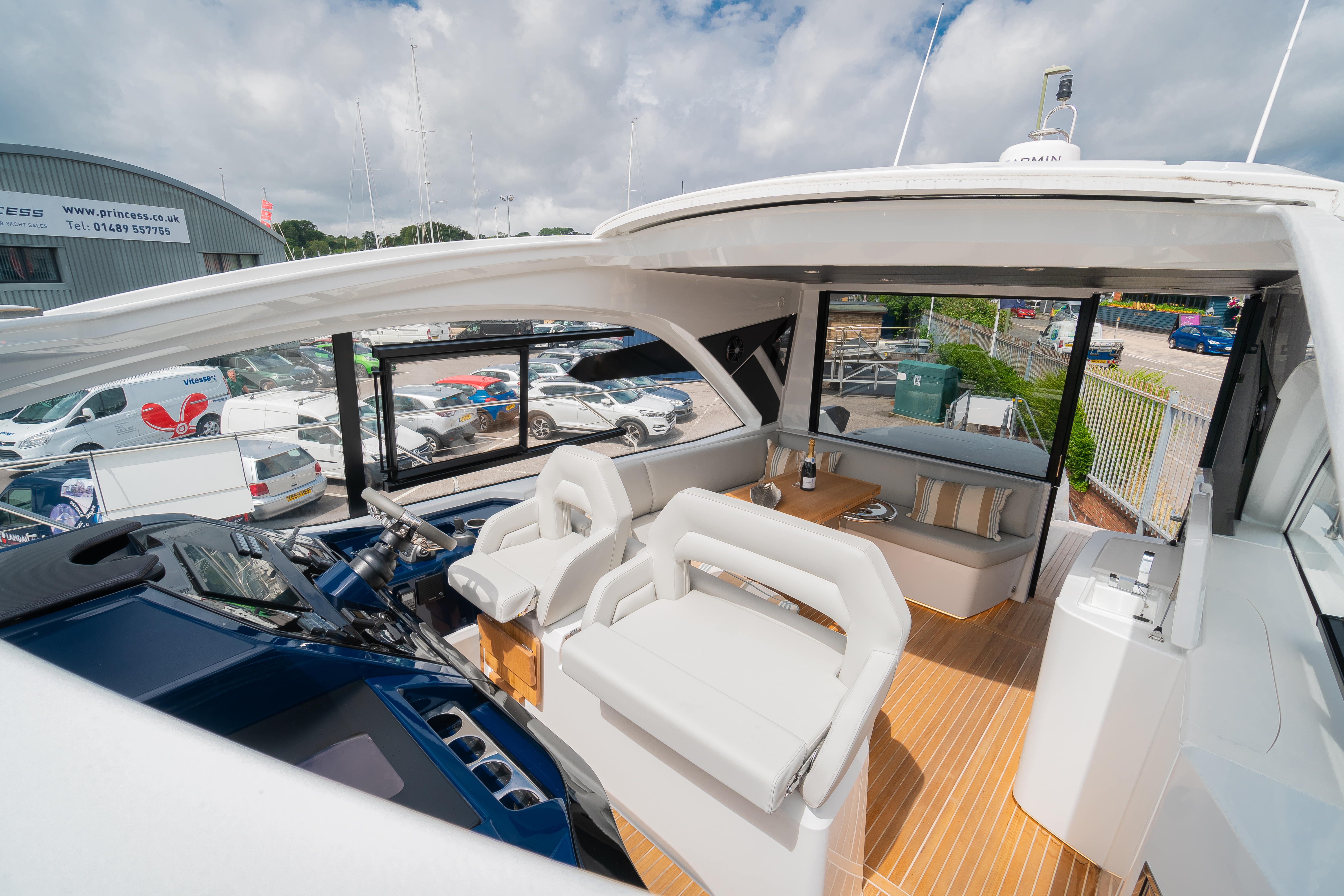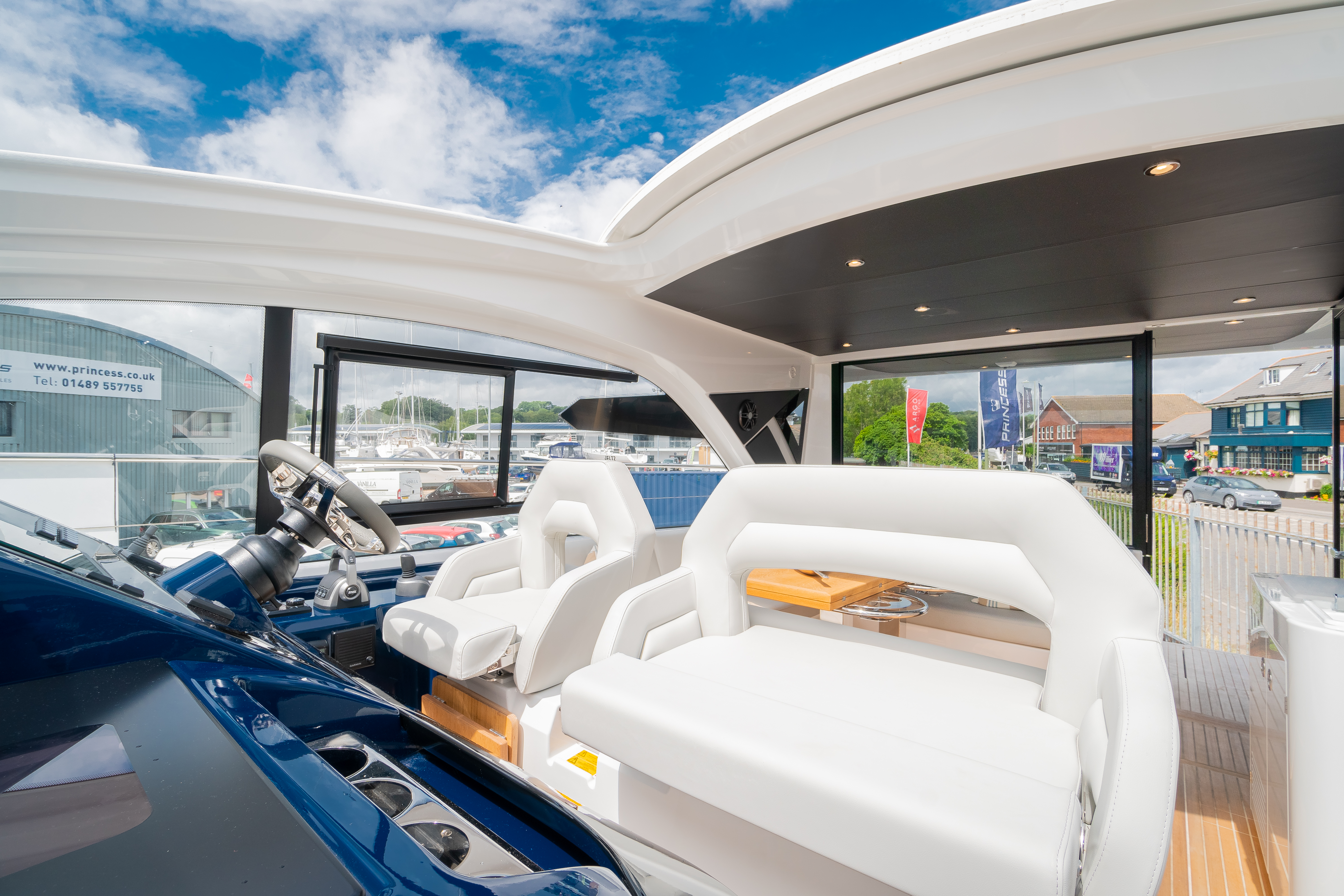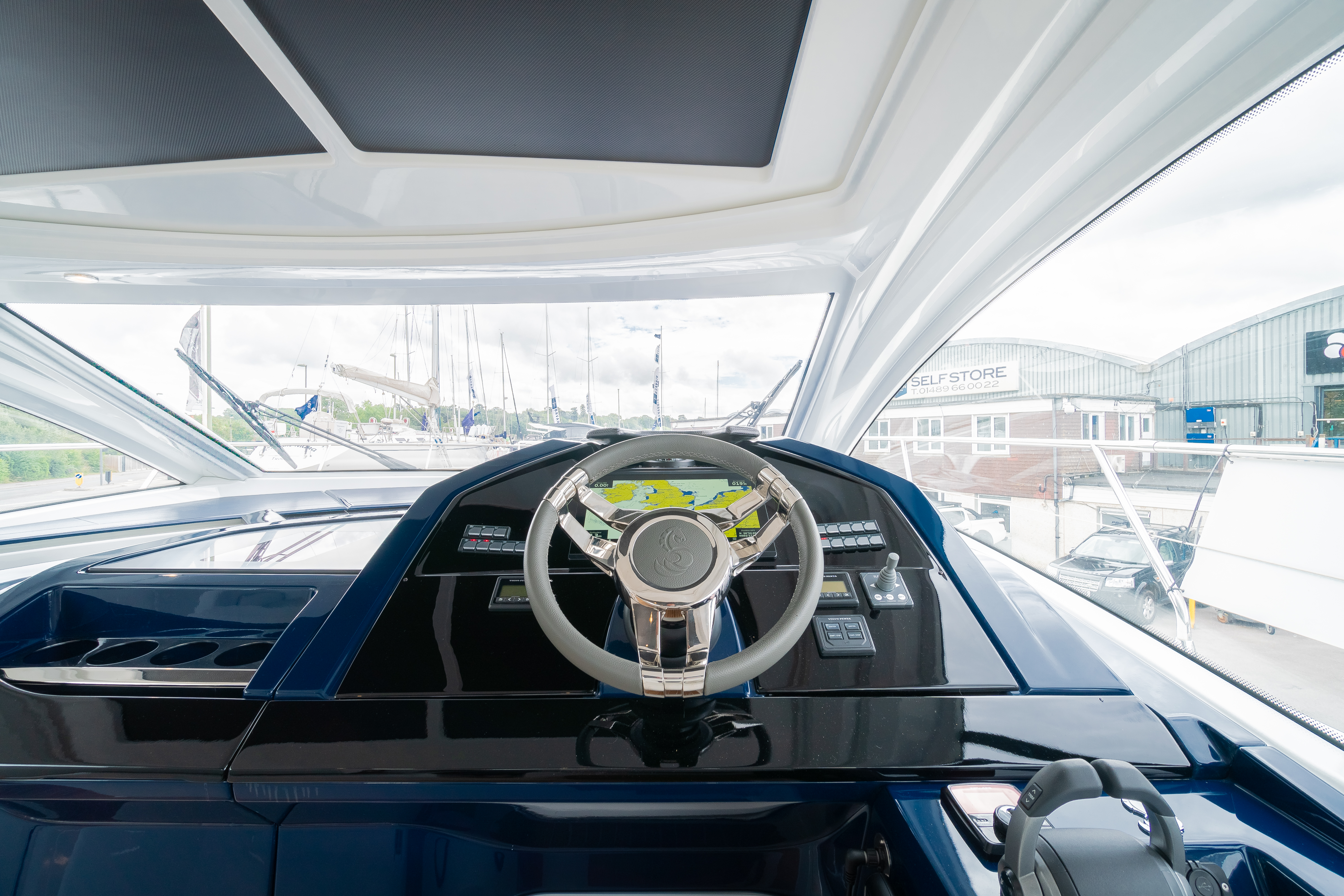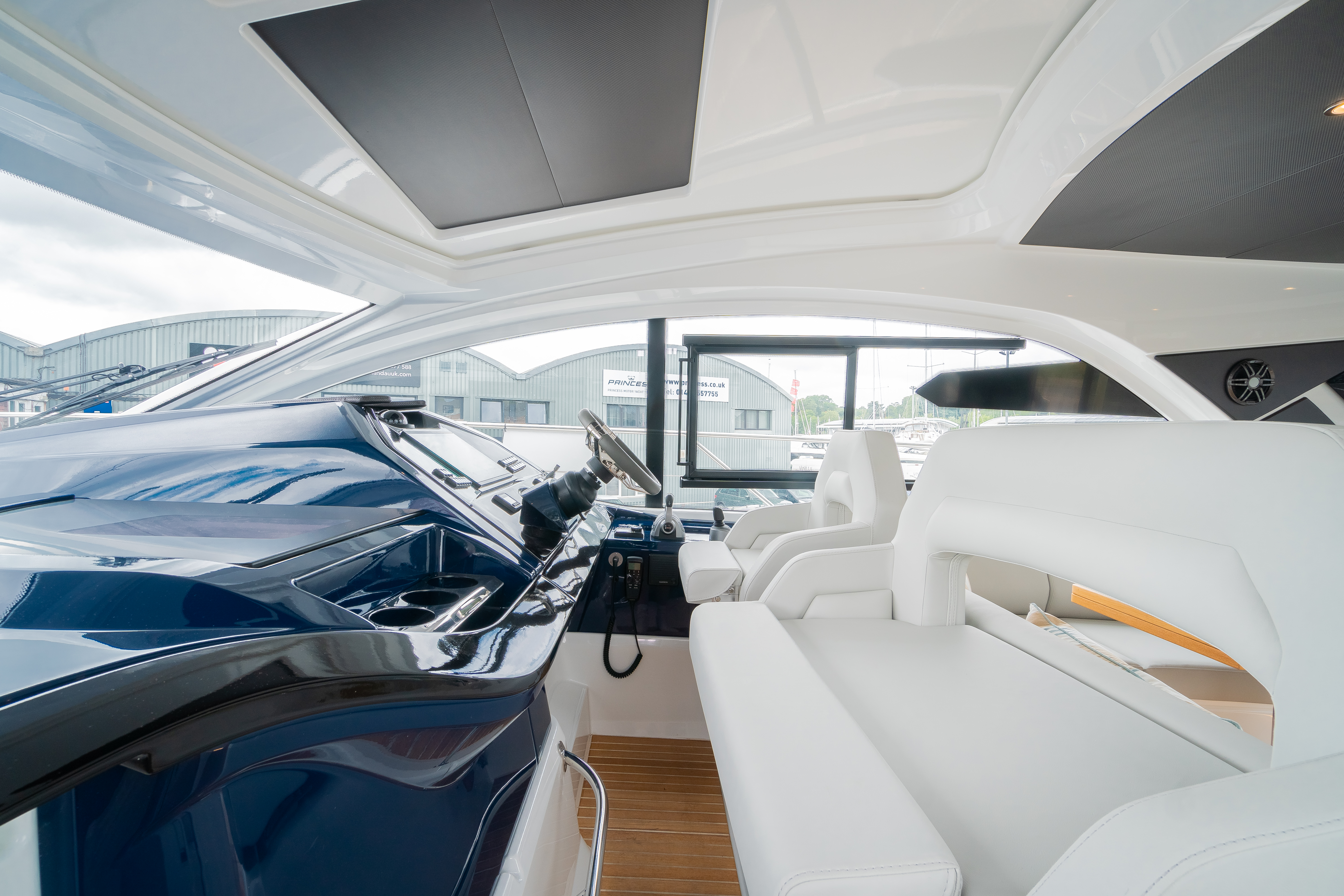 This particular example is powered by twin Volvo Penta D6-380hp diesel engines, low hours, with joystick control on outdrives. Comes with a comprehensive inventory including a Fischer Panda 5000i Neo generator (5kVA/4kW), air conditioning, hi/lo hydraulic platform, ice maker, Electronics pack, Comfort pack, Sports Chic pack, Foredeck pack, cockpit covers, cockpit enclosure and much more.