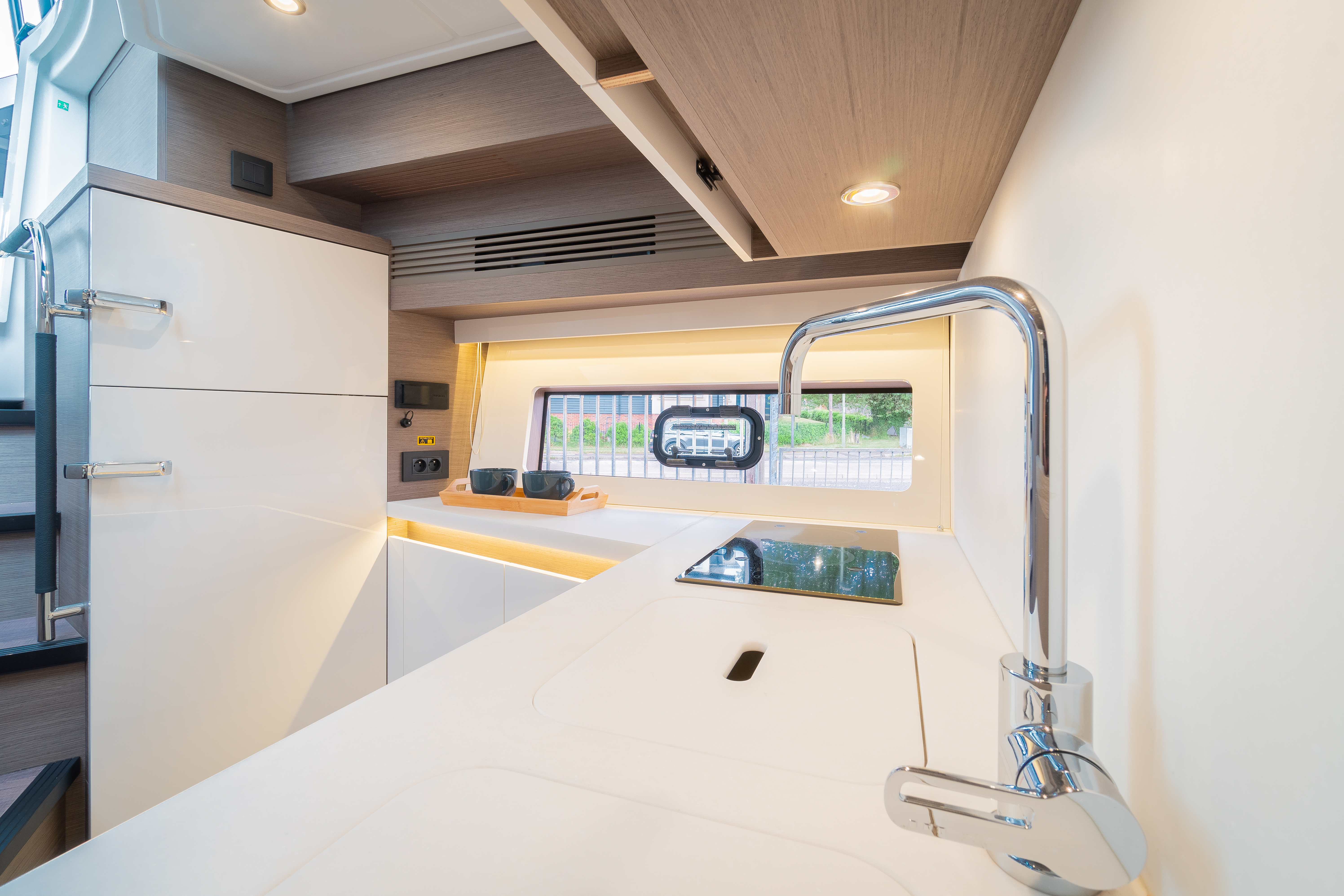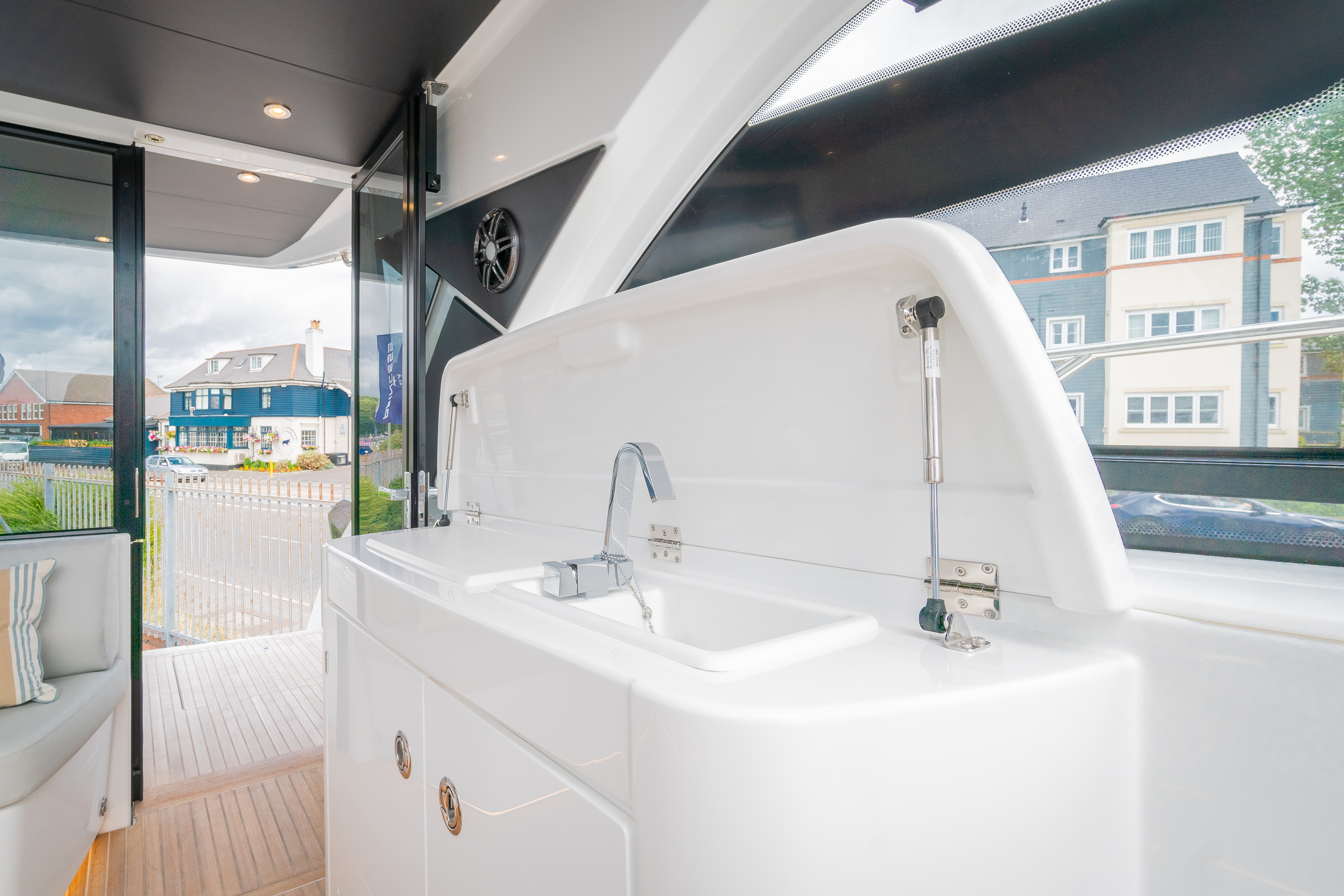 Cockpit galley with sink, foldaway tap, stowage & bin