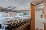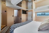 Full beam master cabin amidships with large island double berth mounted on cylinder lifts with stowage compartments, mattress with slatted base and padded headboard. Two bedside tables with drawers, hanging wardrobe and top loading storage cupboards. 220v socket, two panoramic windows, opening portholes with blinds and TV. Access to the Owners Cabin via steps from the Galley.