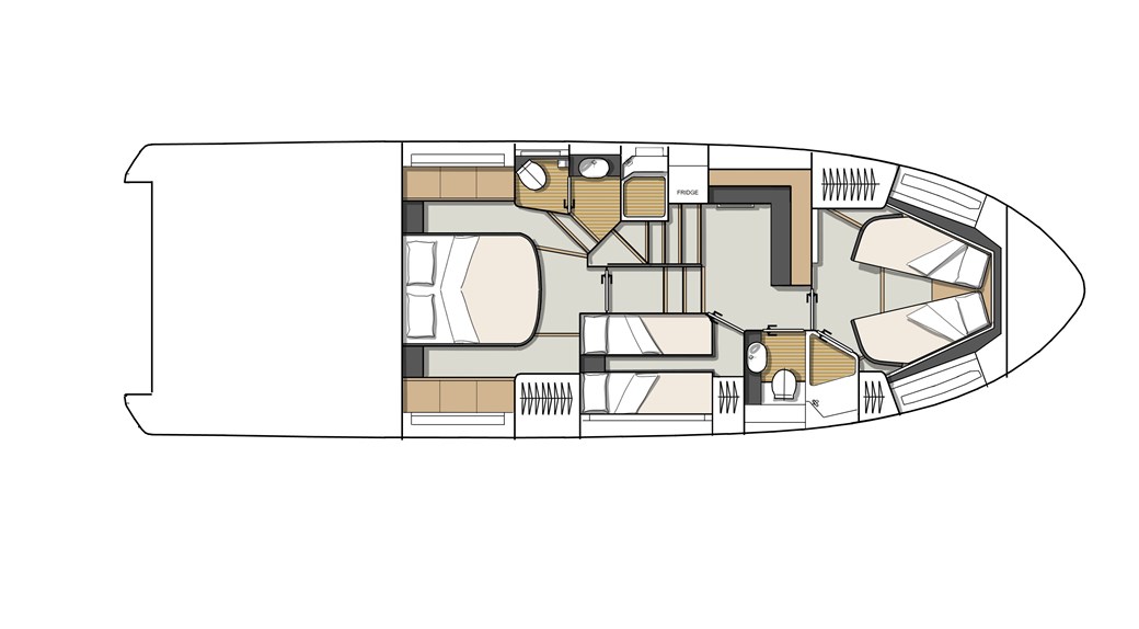 Double berth or scissor berth converting to two singles. Two panoramic windows with blinds, opening portholes and overhead hatch with blind. Hanging locker to port and a cupboard to starboard. TV, 220v socket & two USB's. Ensuite access to Day heads.