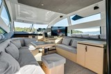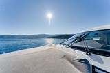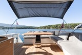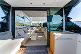 L-shaped seating with teak table with high/low function converting into a sunbed with cushion infill. Liferaft storage under seating and access to engine room. Cupboard enclosing a Vitrifrigo ice maker with worktop above, storage locker, IPS control to starboard with Volvo display, bow thruster, bathing platform control and handheld gangway control. Access to the port and starboard side decks and bathing platform. Cockpit shower with hot & cold water mixer tap. Opacmare passerelle, electric opening garage for tender and launching system and access to the engine space. Worktop with Kenyon electric grill. Hydraulic bathing platform with stainless steel bathing ladder and stainless steel backlit name.