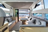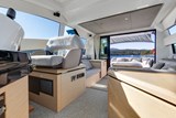 Large windows allowing plenty of light to flood the saloon with two large electric opening side windows. A two seater sofa to starboard, cupboard, Vitrifrigo fridge, large TV and sound system. L-shaped seating to port extending into the cockpit, folding wooden high/low table with leather insert, stool, four stage mirror tinted sliding cockpit doors and curtain.