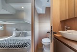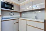 Two stainless steel sinks with hot & cold mixer tap. Work top in light grey Corian with a Kenyon two burner ceramic hob, Whirlpool grill, oven & microwave. Electrolux drawer dishwasher, large fridge/freezer, cutlery drawer, bin, storage cupboards, corner cupboard, two 220v sockets, Siemens 7kg washing machine & tumble dryer, opening porthole with blind. Access to Saloon/Wheelhouse, Owners Cabin, VIP Cabin, Day Heads and Guest Cabin.