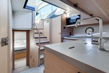 Brushed Alpi Oak interior joinery with brown oak laminated floor with grey carpet in the cabins, galley and saloon
