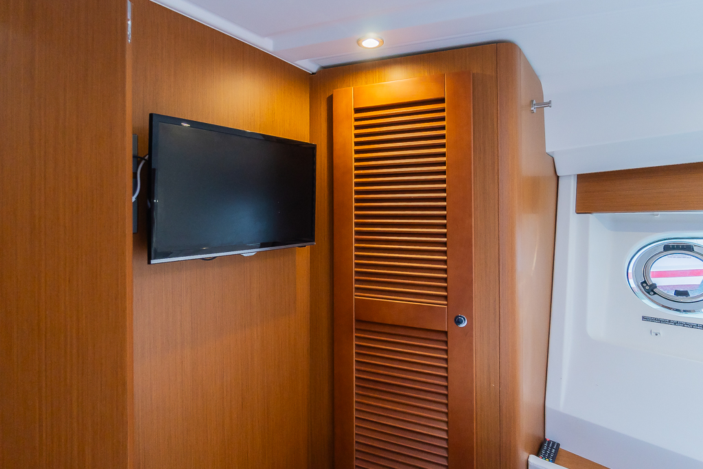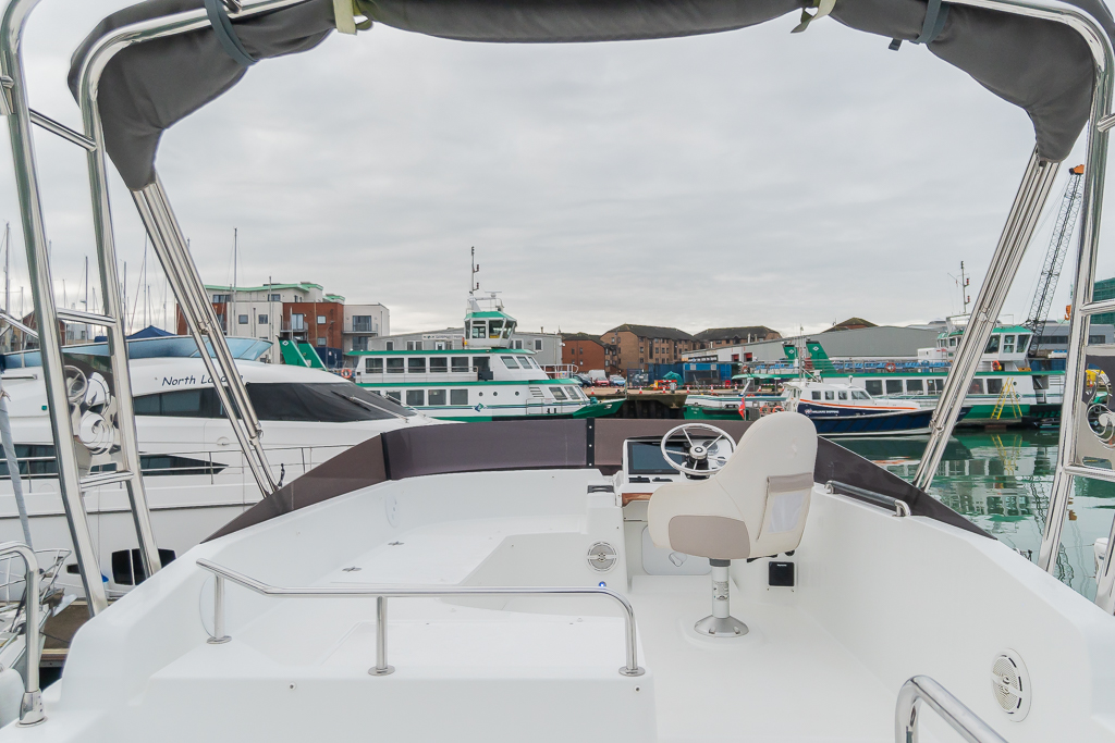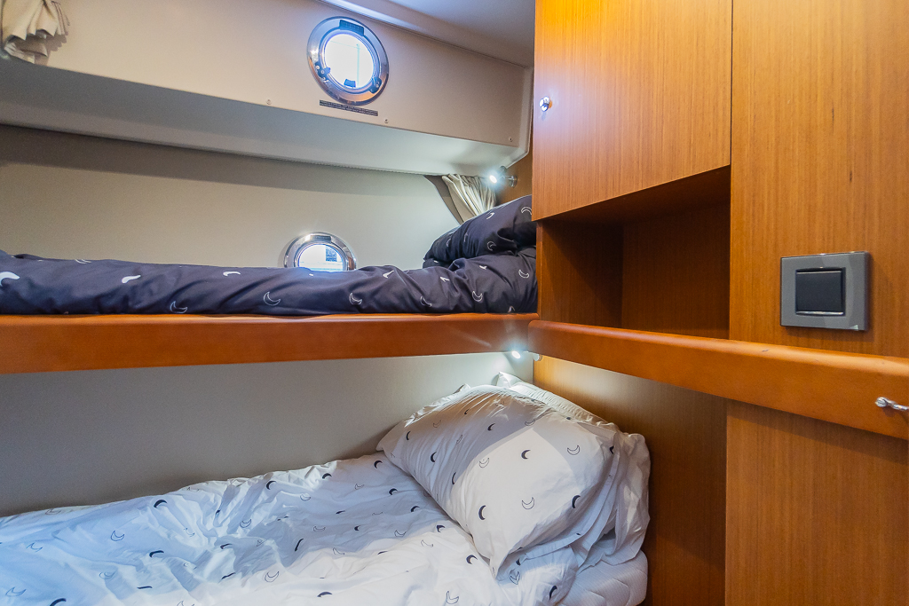 Built on a semi-planing flared hull, the Swift Trawler 35 has a Cummins 425 hp engine and the flybridge emphasises the boat’s harmonious profile and distinctive long distance cruising temperament. Broad walkways, lots of hand rails and high pushpits – higher than regulations require – reveal the importance attached to safety on board. Intended for long cruises, the Swift Trawler 35 offers a spacious interior with ingenious contemporary fittings with the owners cabin located forward and the second cabin with bunk berths to port. The U shaped galley is fitted with a twin sink that converts into a worktop and an extra forward-facing seat, while the saloon sofa converts to a comfortable double berth. Enjoy plenty of visibility from the Swift Trawler 35’s wheelhouse which has a 360° view and is bathed with natural light.