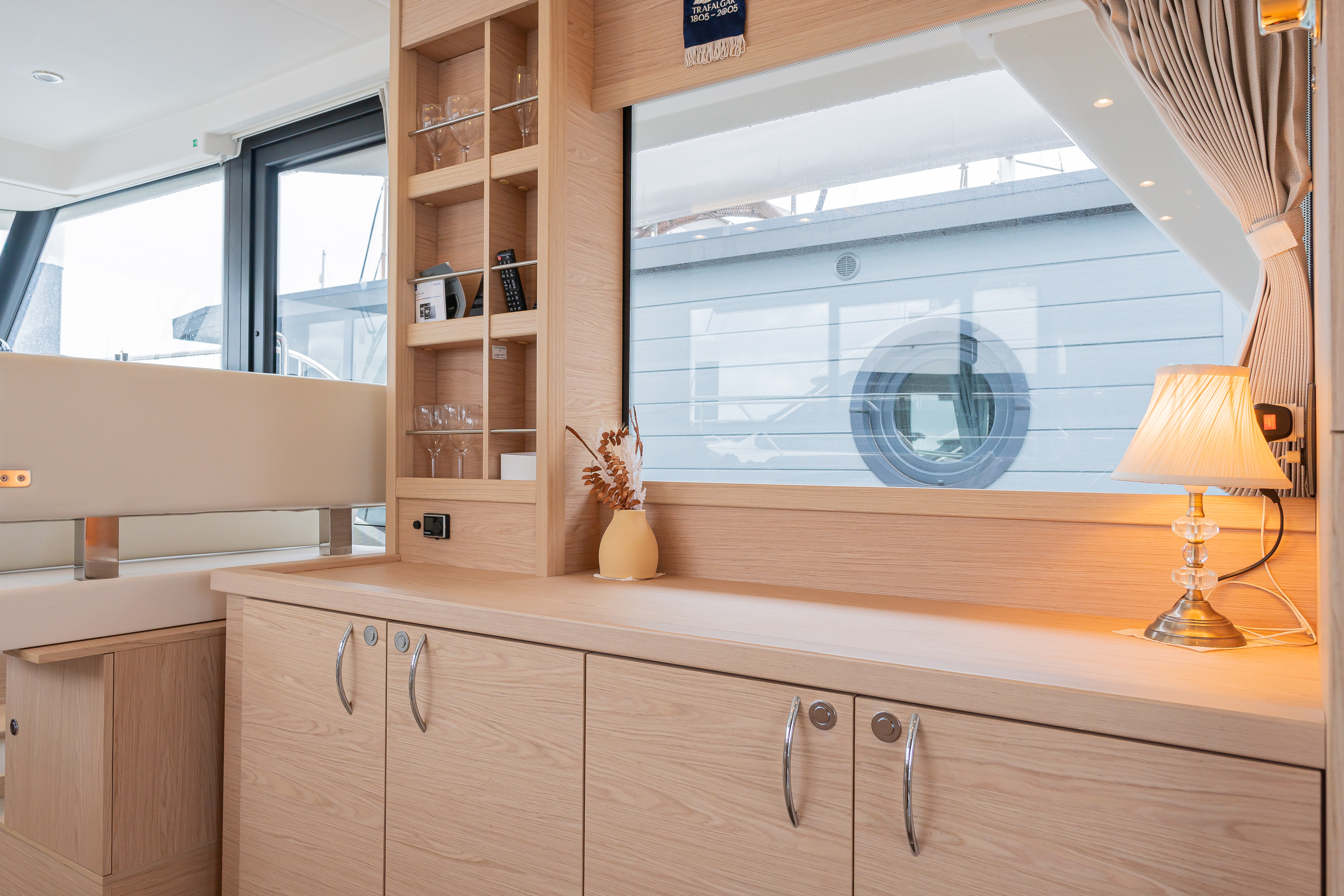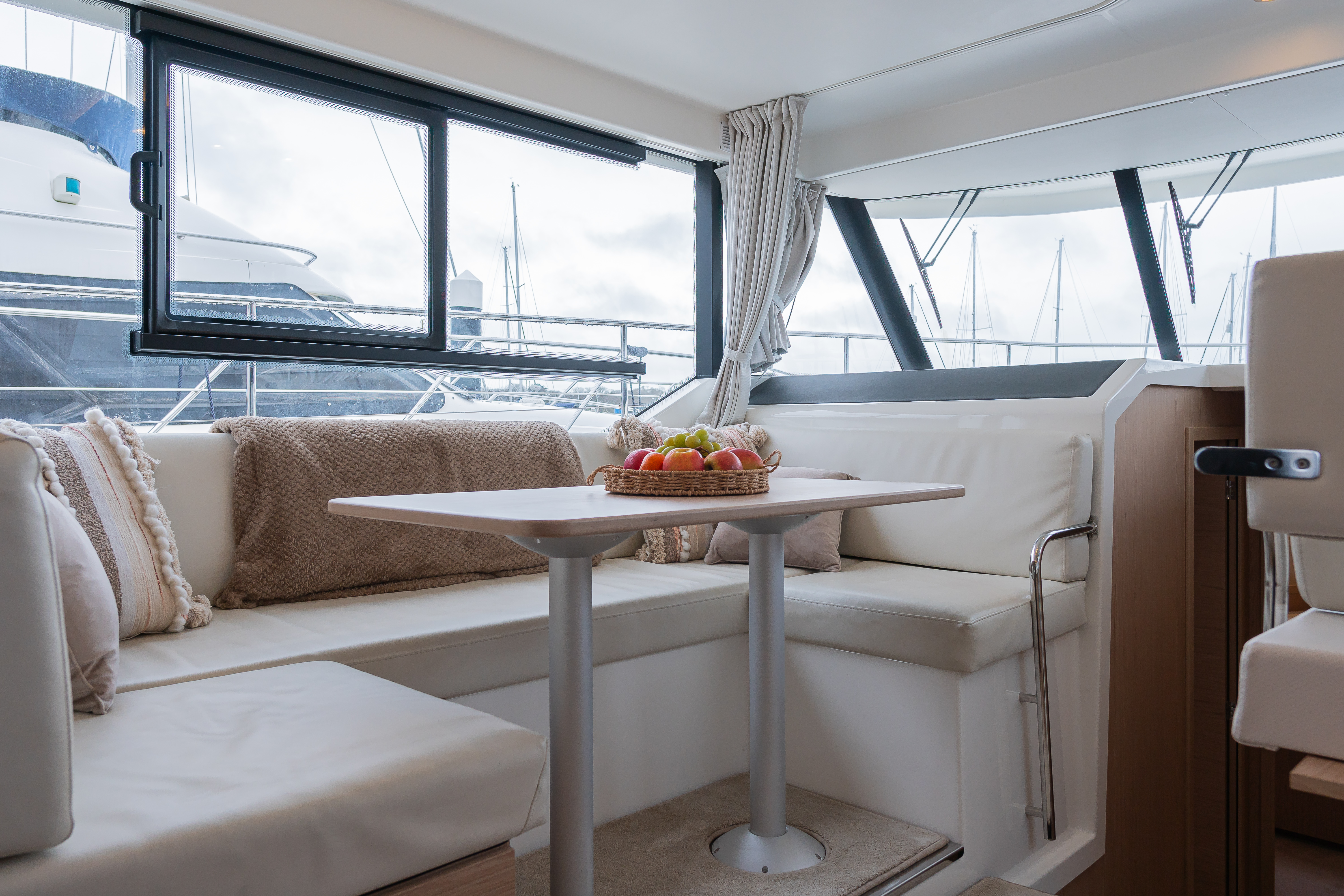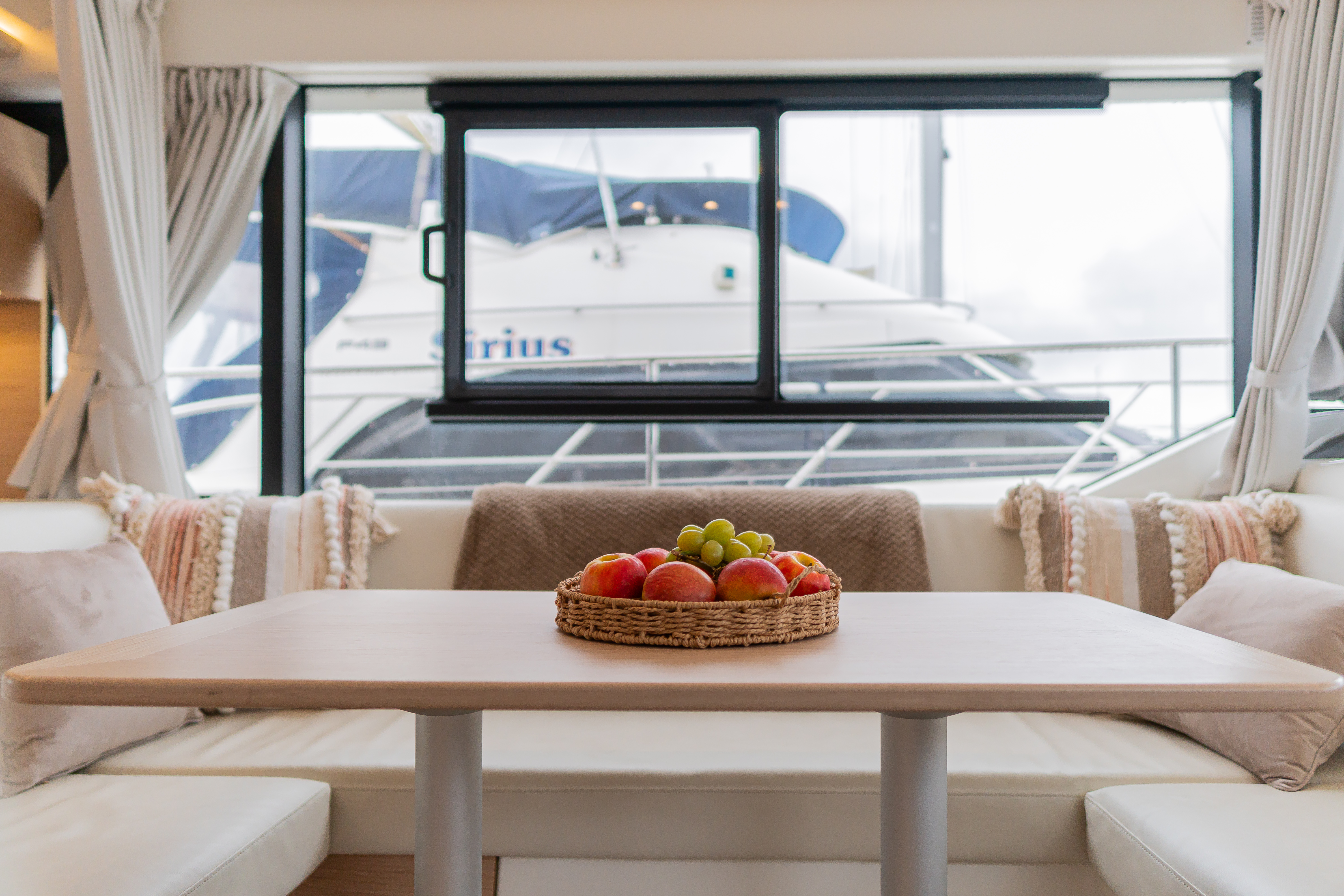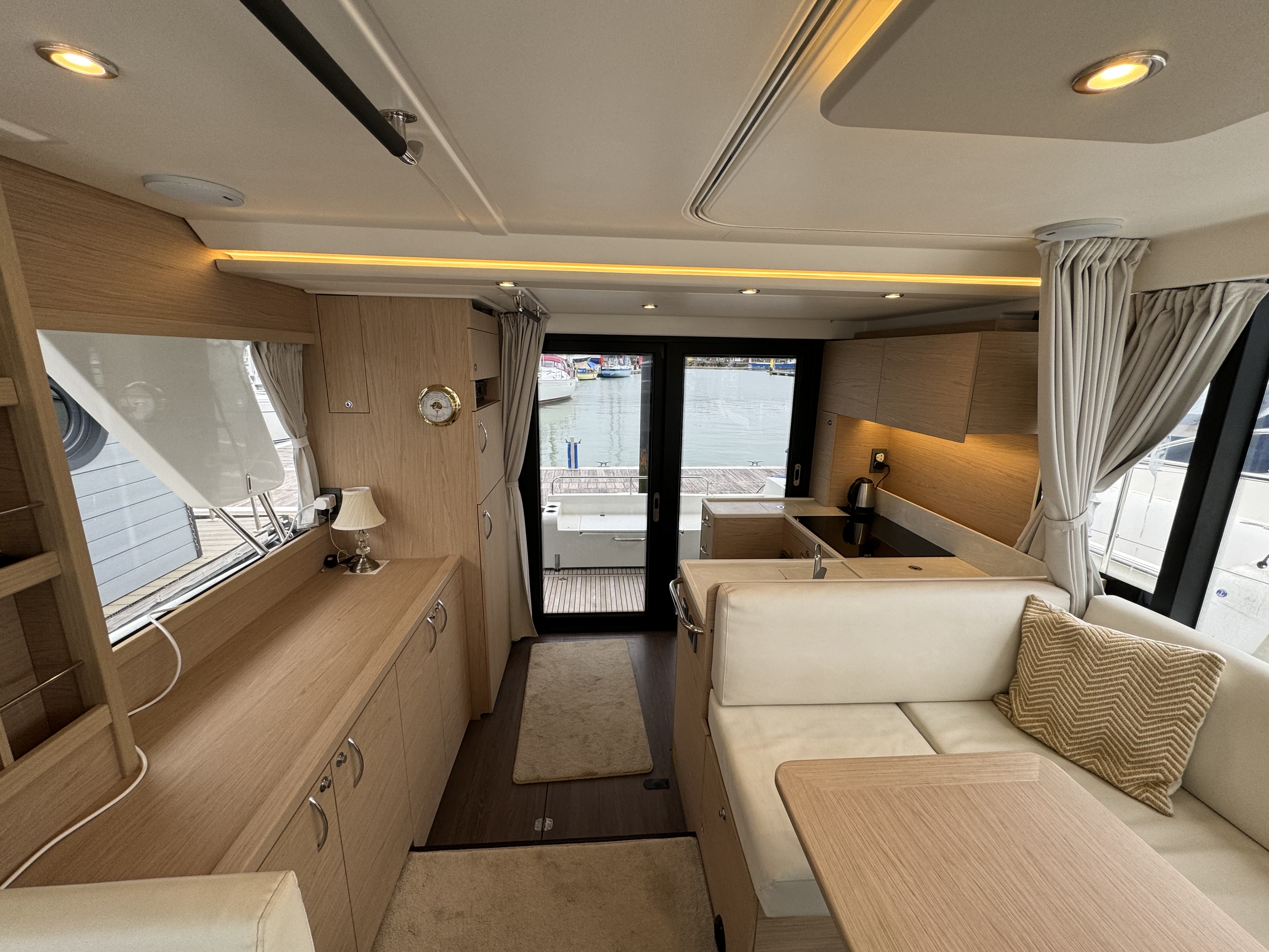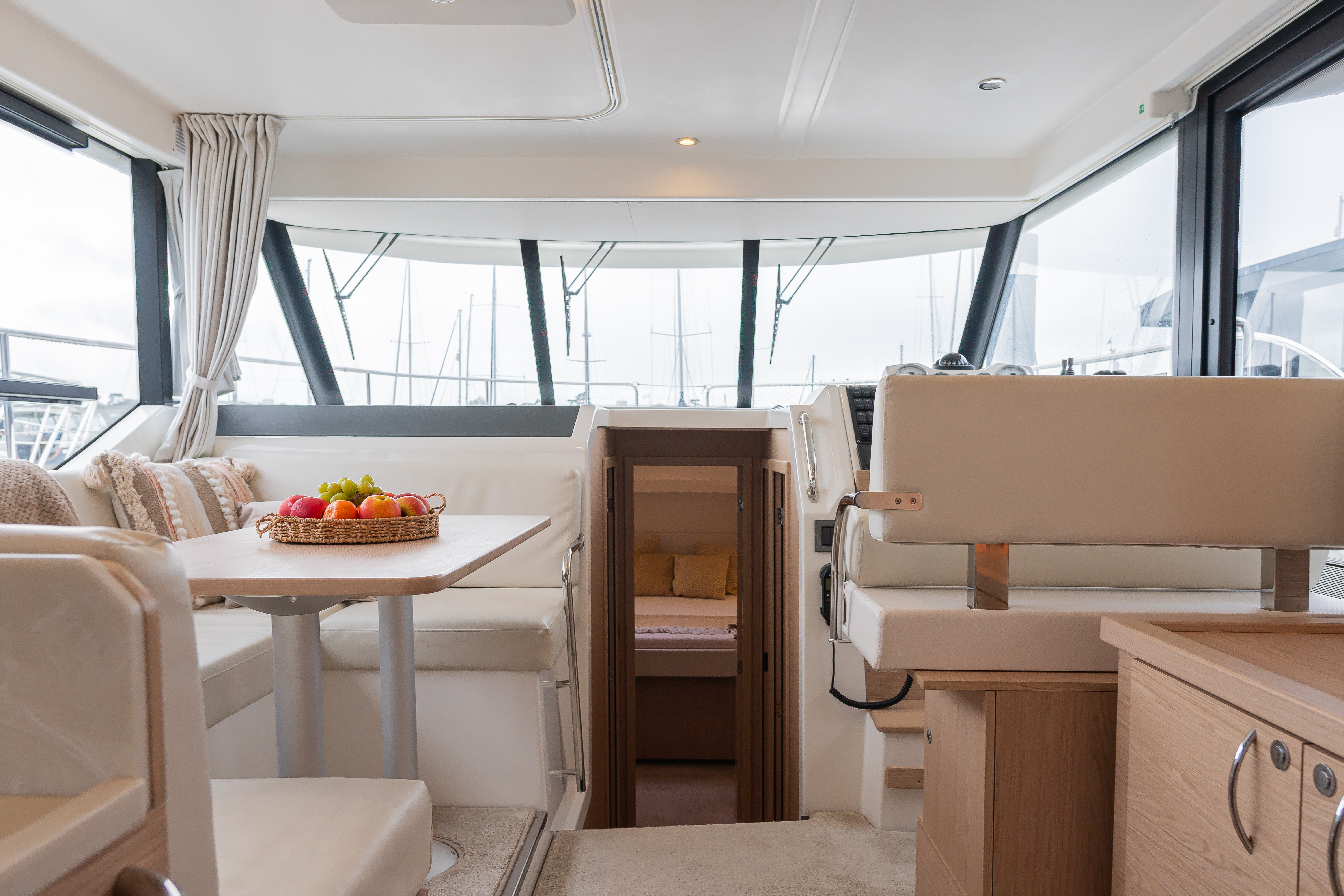 Saloon U-shaped seating convertible to double berth with dividing rail and curtains for berth, roman blinds, wood saloon table with table extension, storage cupboards, one large stowage drawer.