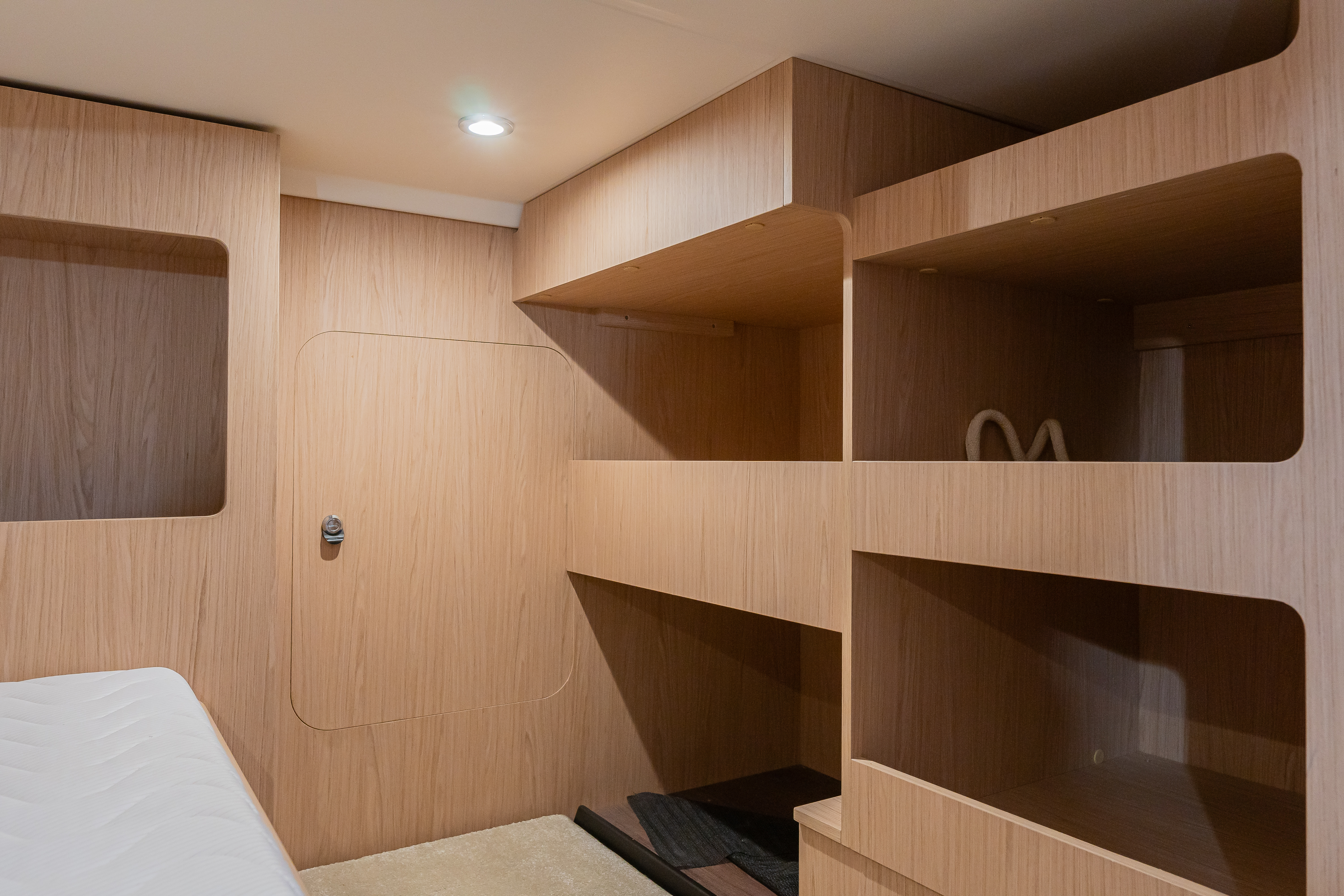 Storeroom/Guest cabin to starboard, single mattress, modular stowage, storage under berth.