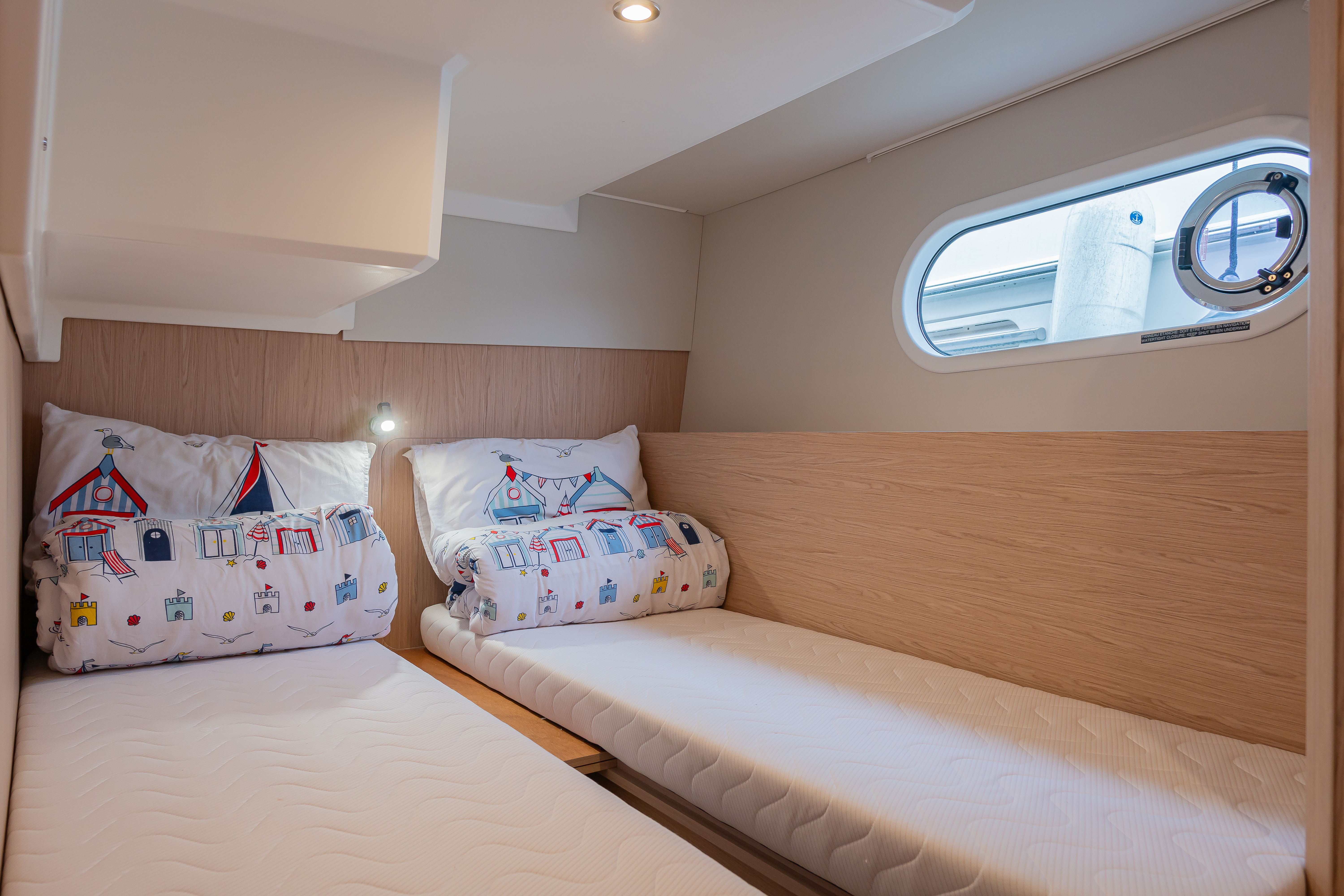 VIP cabin to port with two single beds convertible into double bed, padded headboard, cupboards, storage under berth, cubby hole locker, hull window with opening porthole and curtain.