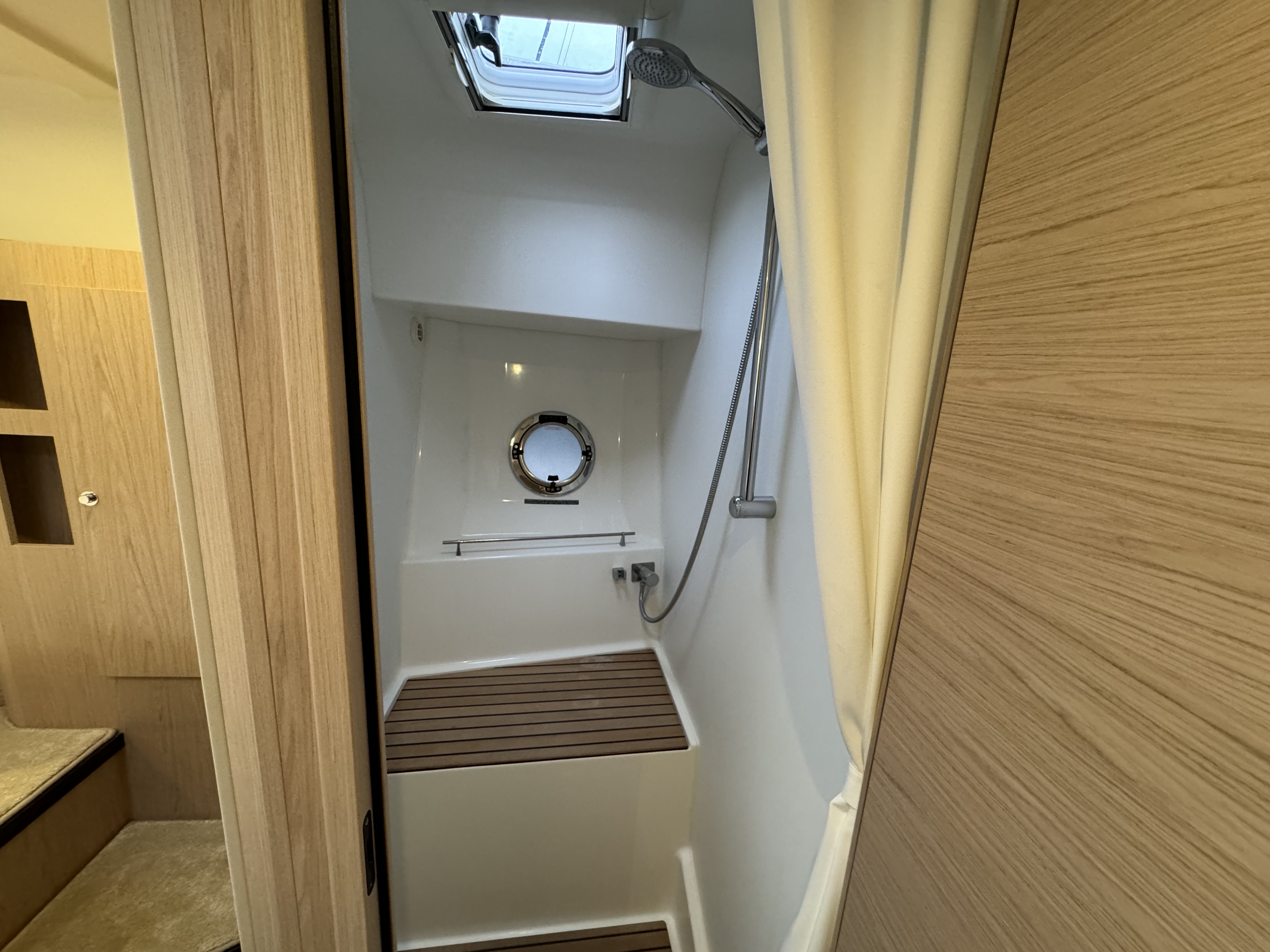 Day heads to starboard with mirror, top and bottom cupboard, opening porthole, electric toilet flushing with fresh and salt water, oval washbasin, mixer tap, shower and towel rail.