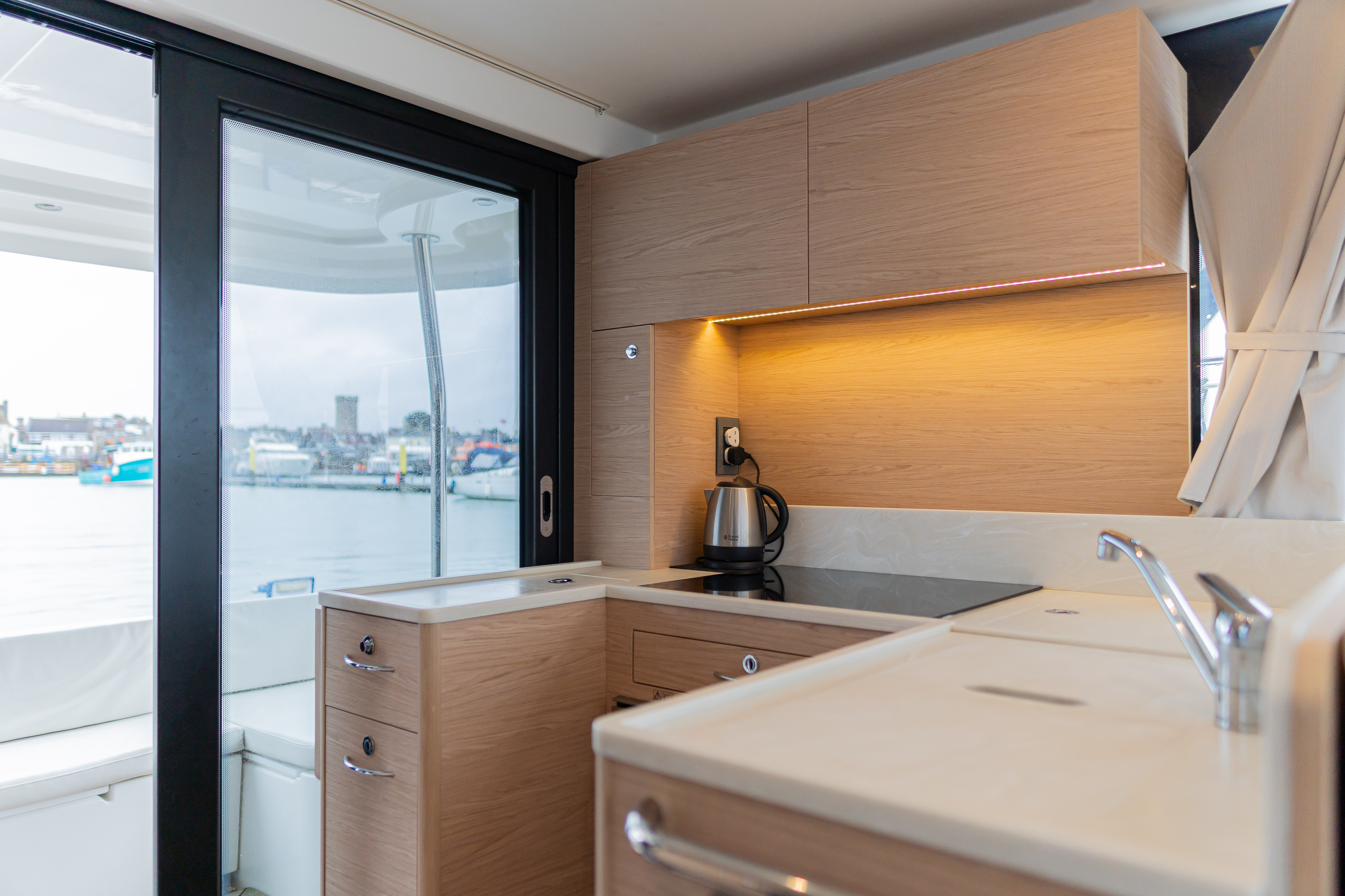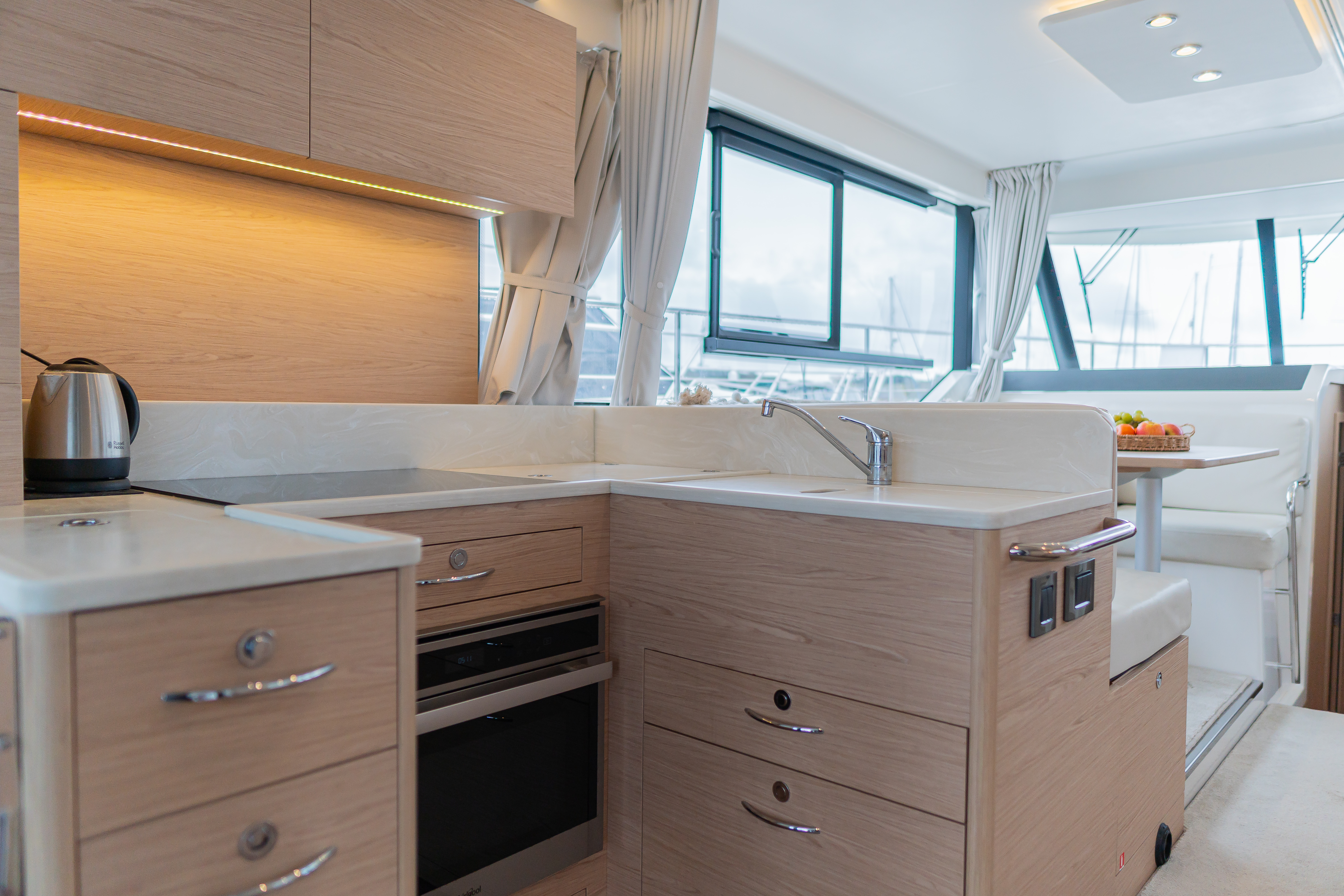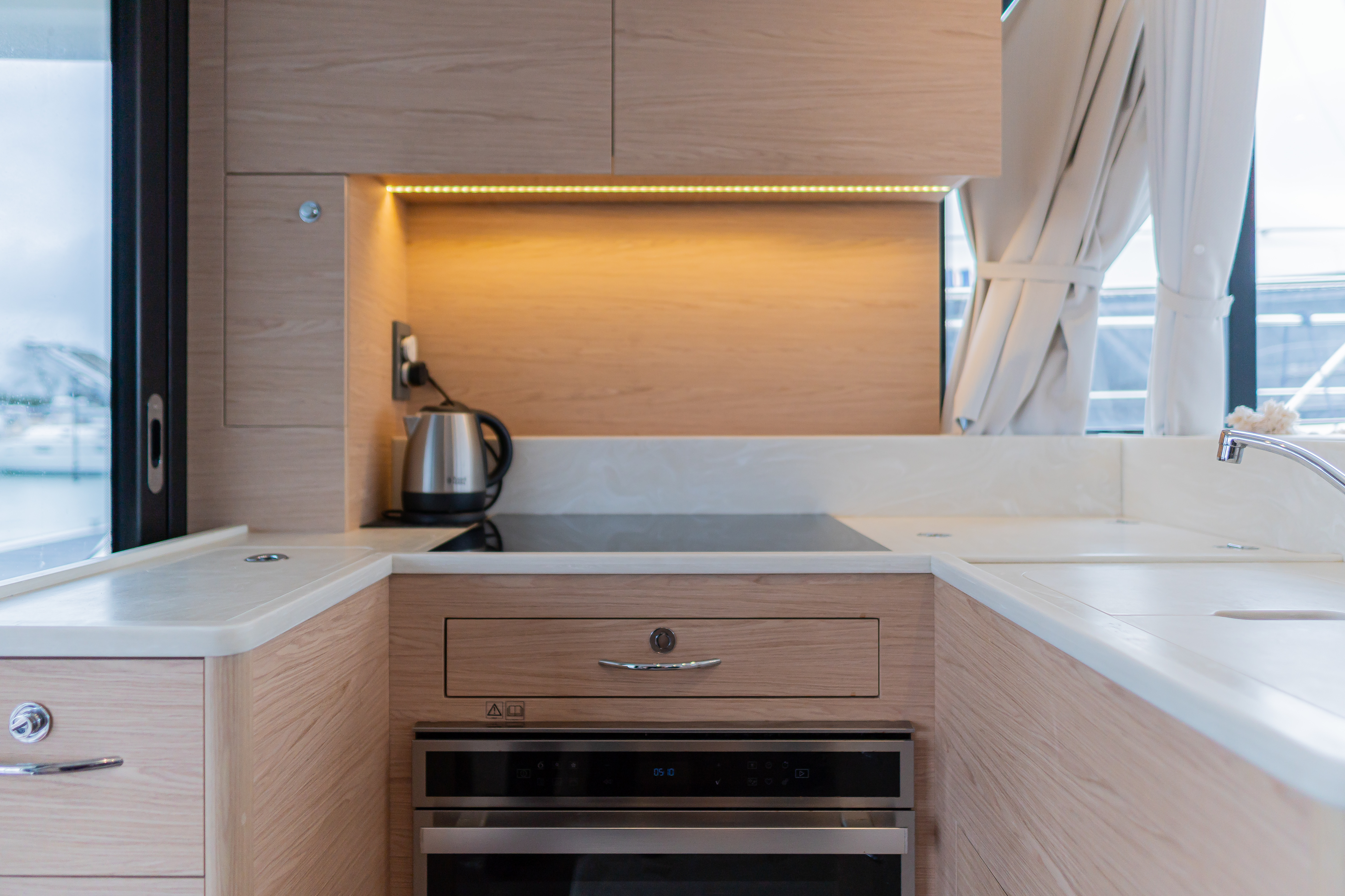 Galley U-shaped facing the cockpit and saloon. Laminated work top with Nimbus Prima Corian edging.