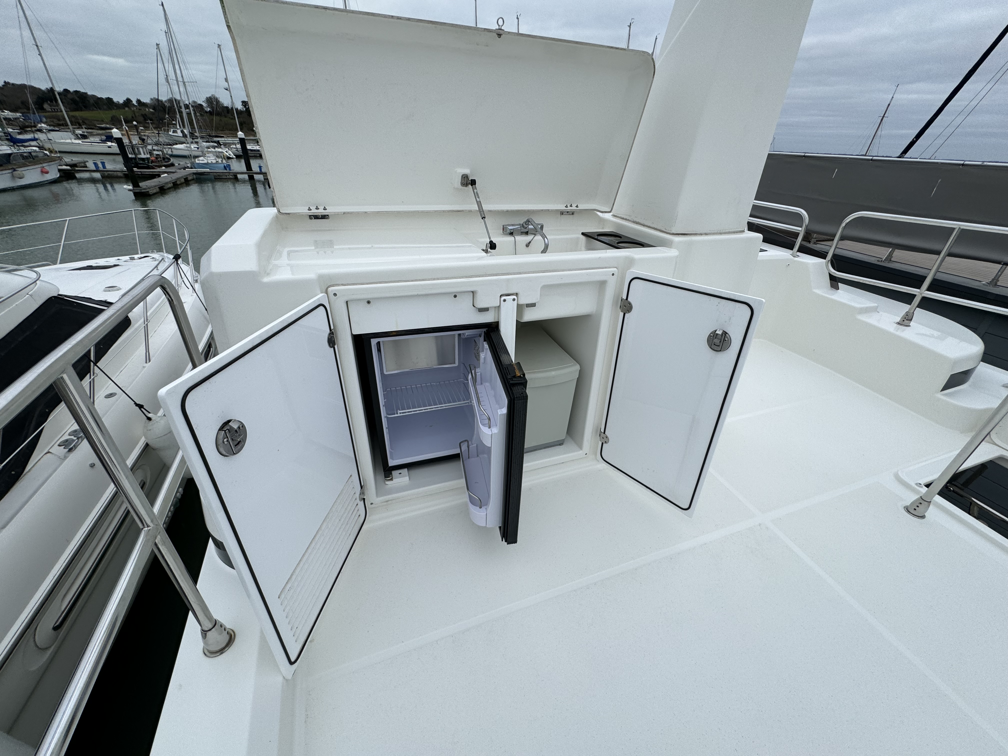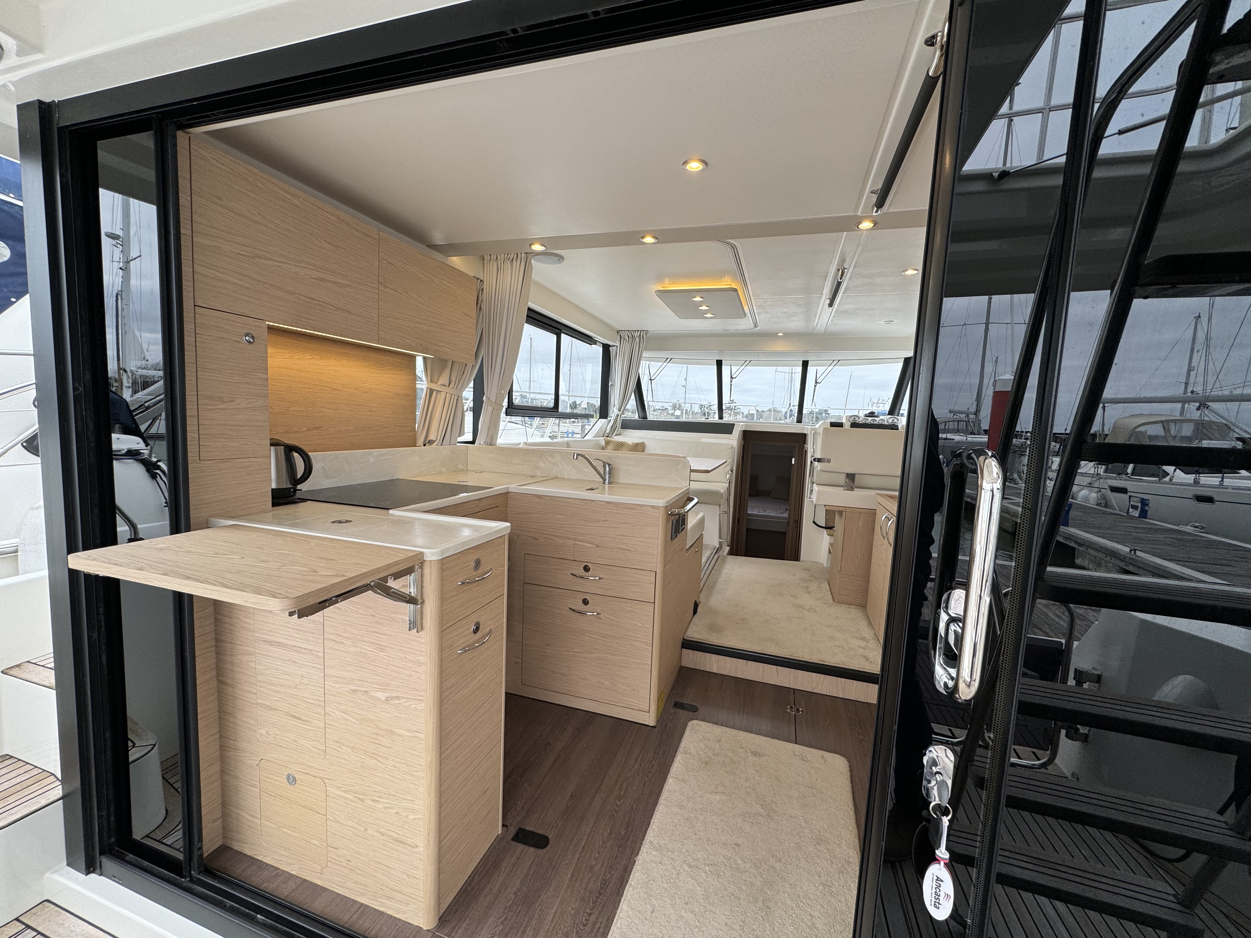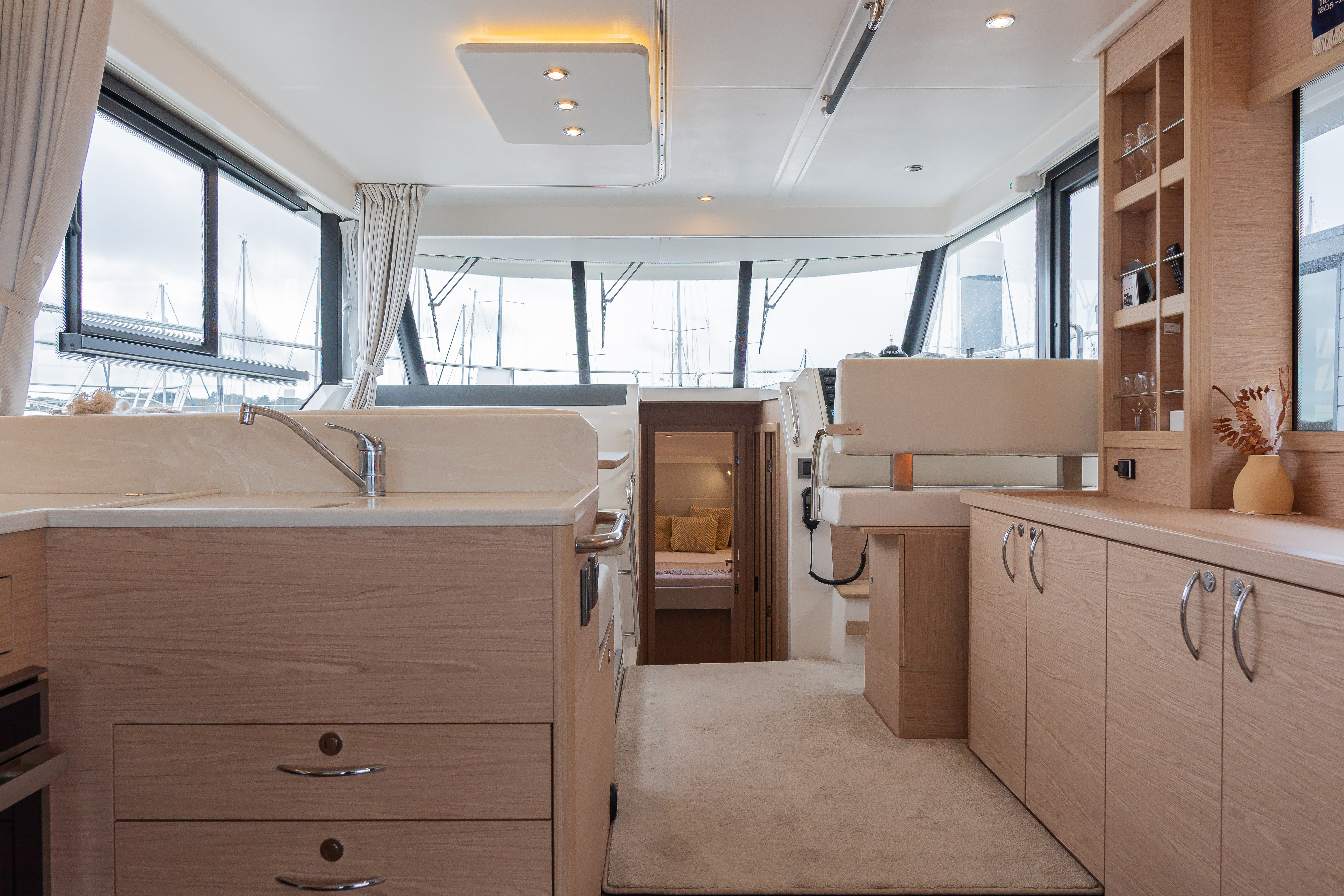 Galley U-shaped facing the cockpit and saloon. Laminated work top with Nimbus Prima Corian edging.