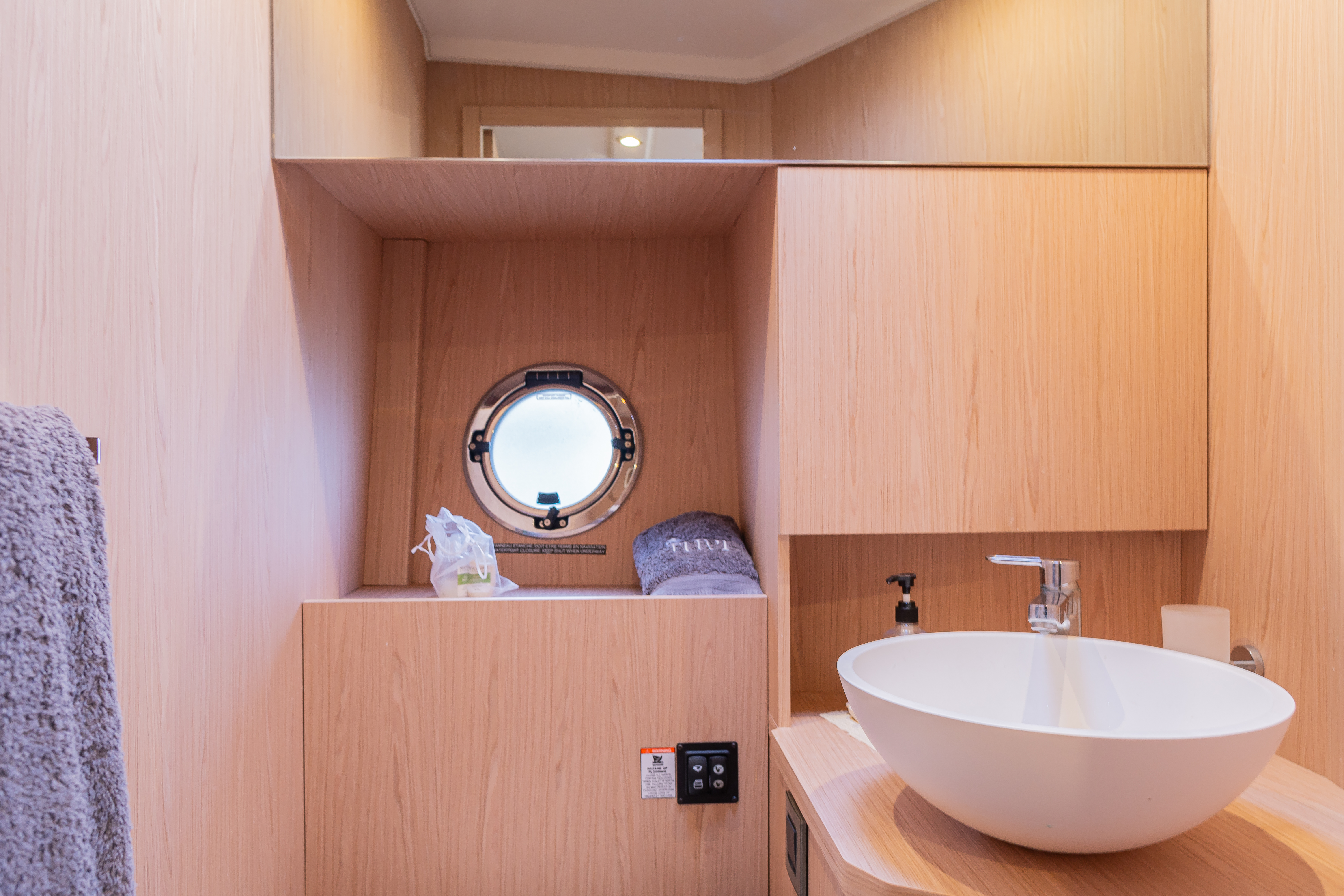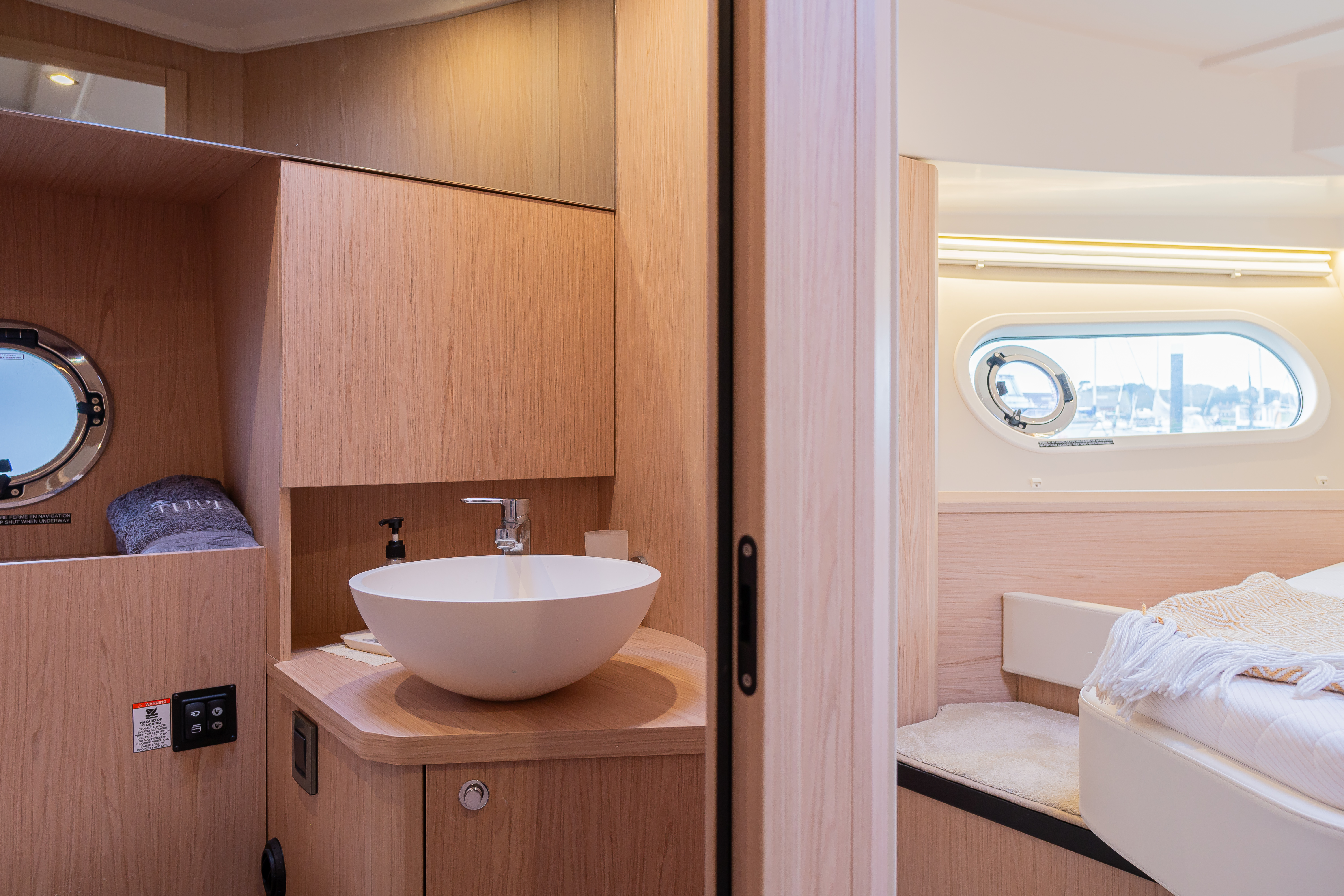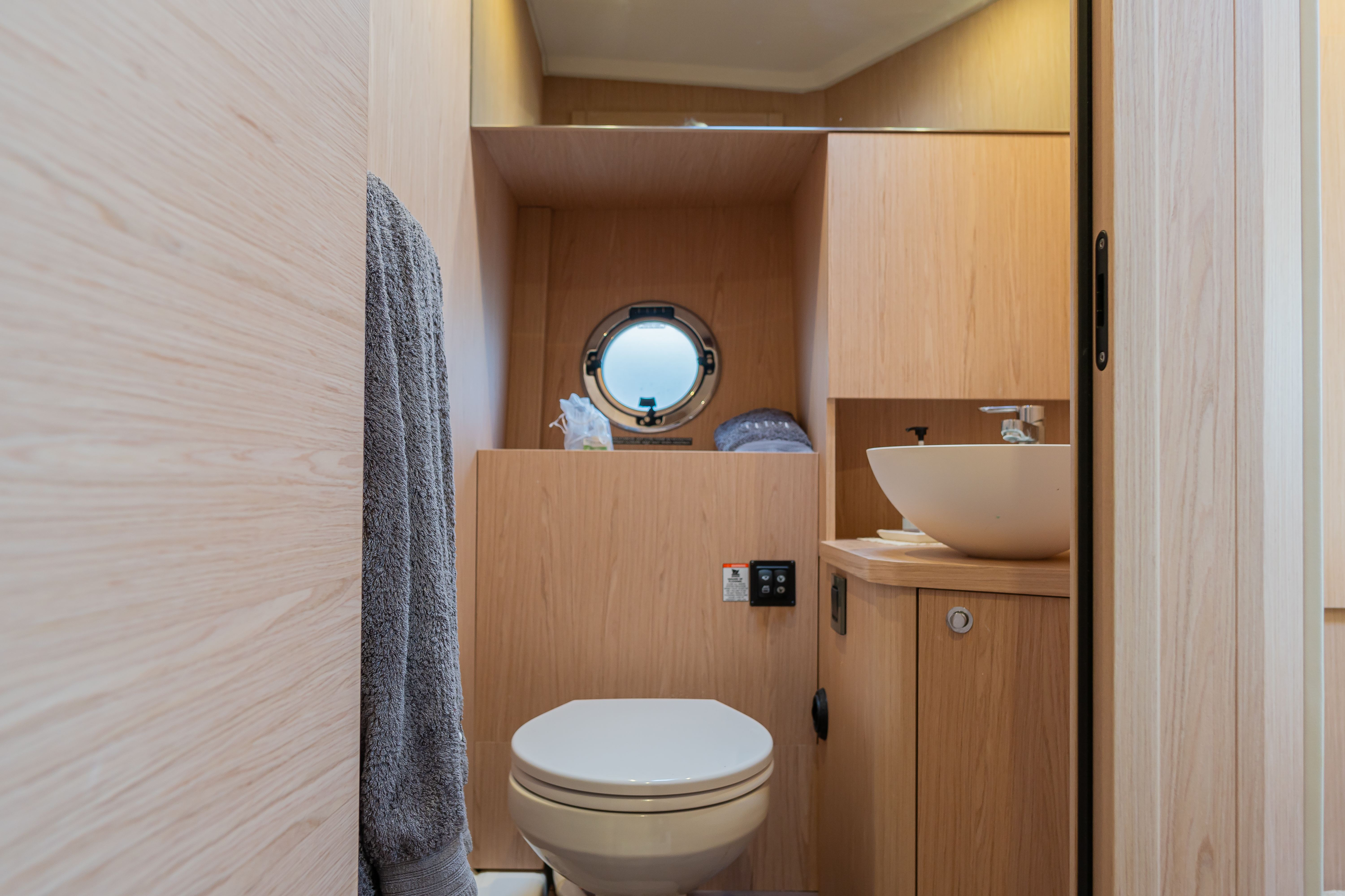 Owners ensuite head to port with mirror, top and bottom cupboard, electric flushing toilet with fresh and salt water, oval washbasin, opening deck hatch with integrated blind, hull porthole, venetian blinds.