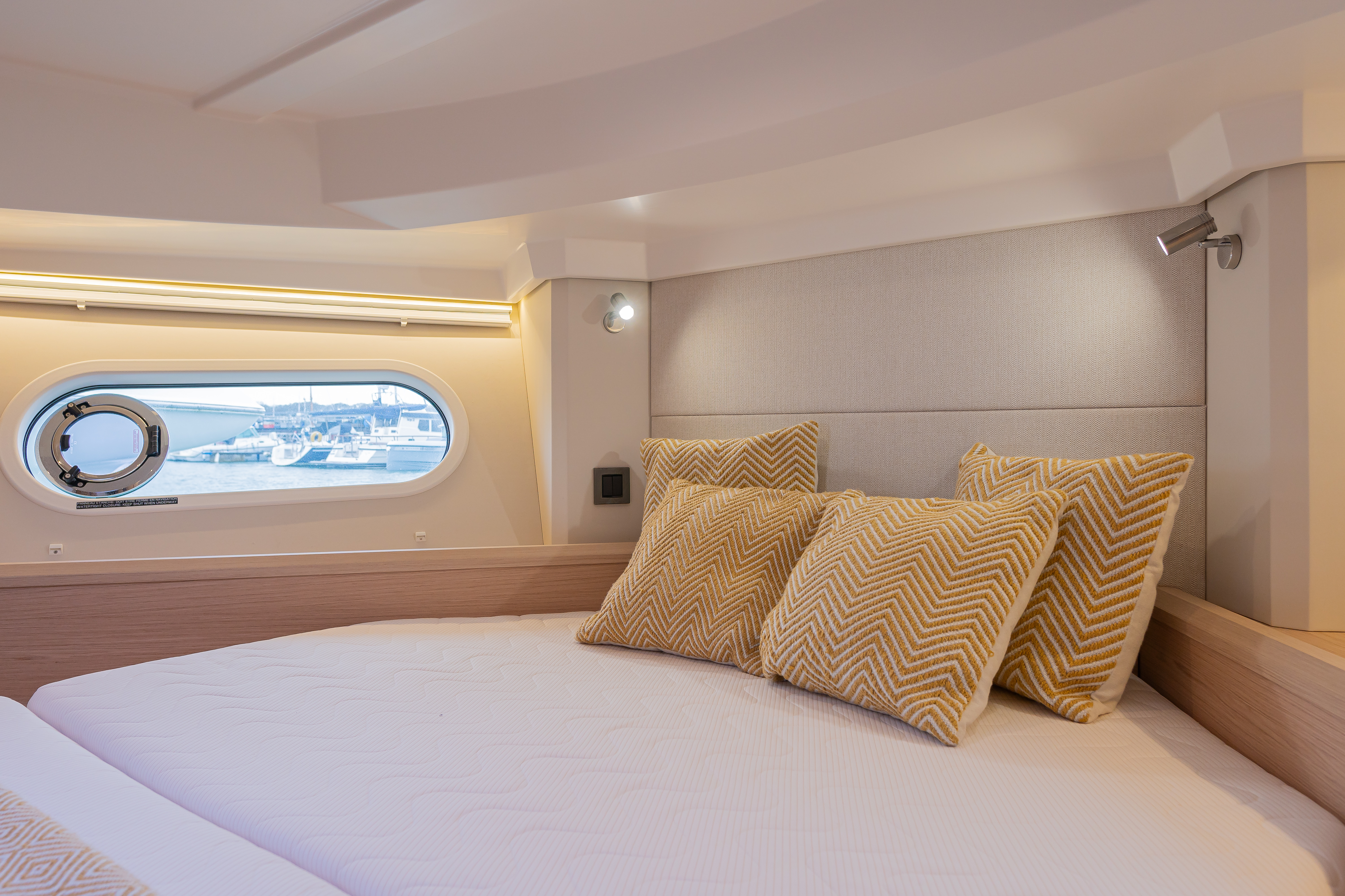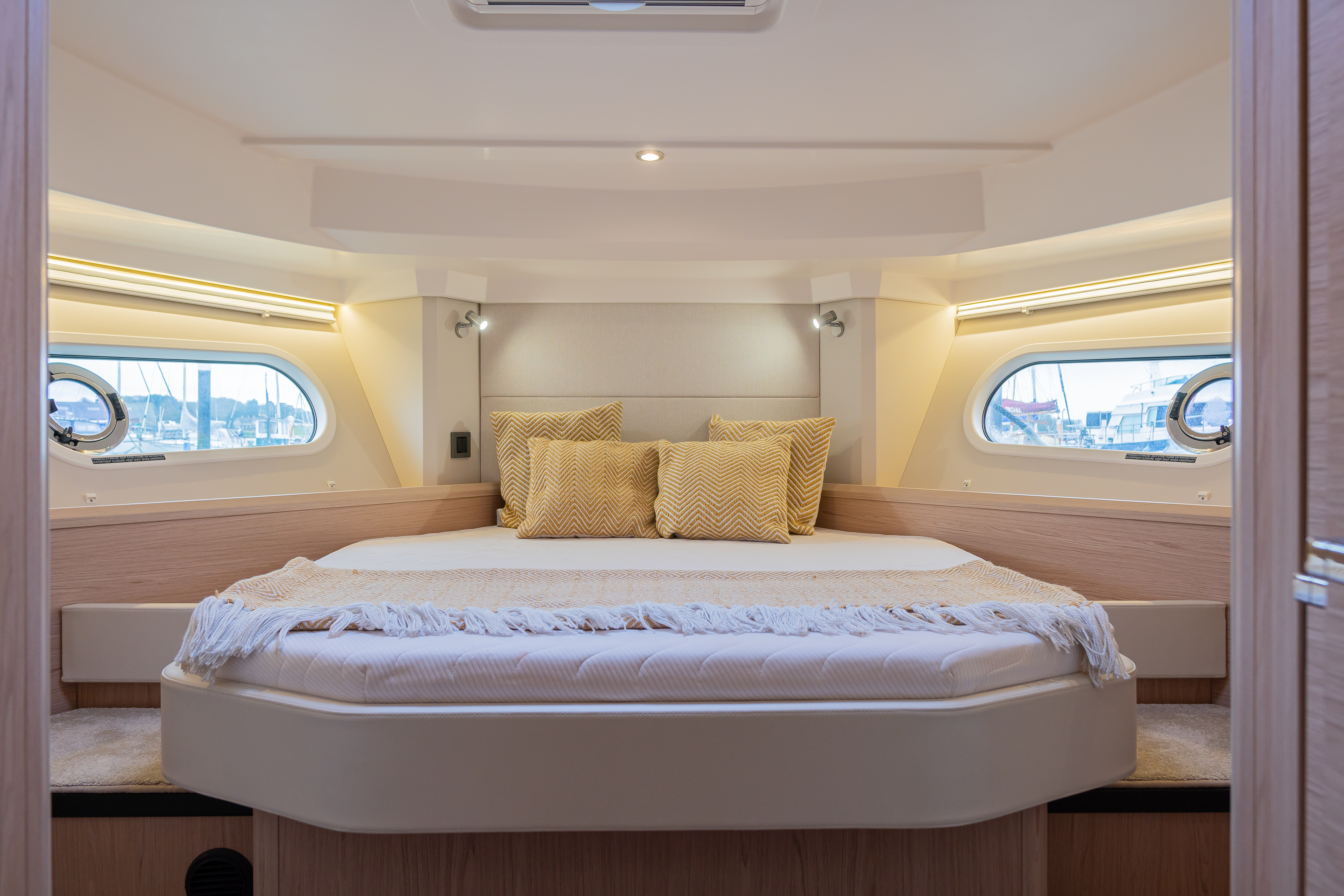 Owners cabin forward with island double berth and padded headboard, with storage underneath and stowage on both sides of berth, mirror, hanging locker with lighting, cupboard with shelves, opening hatch with mosquito screen and blind, two hull windows with opening portholes and venetian blinds.