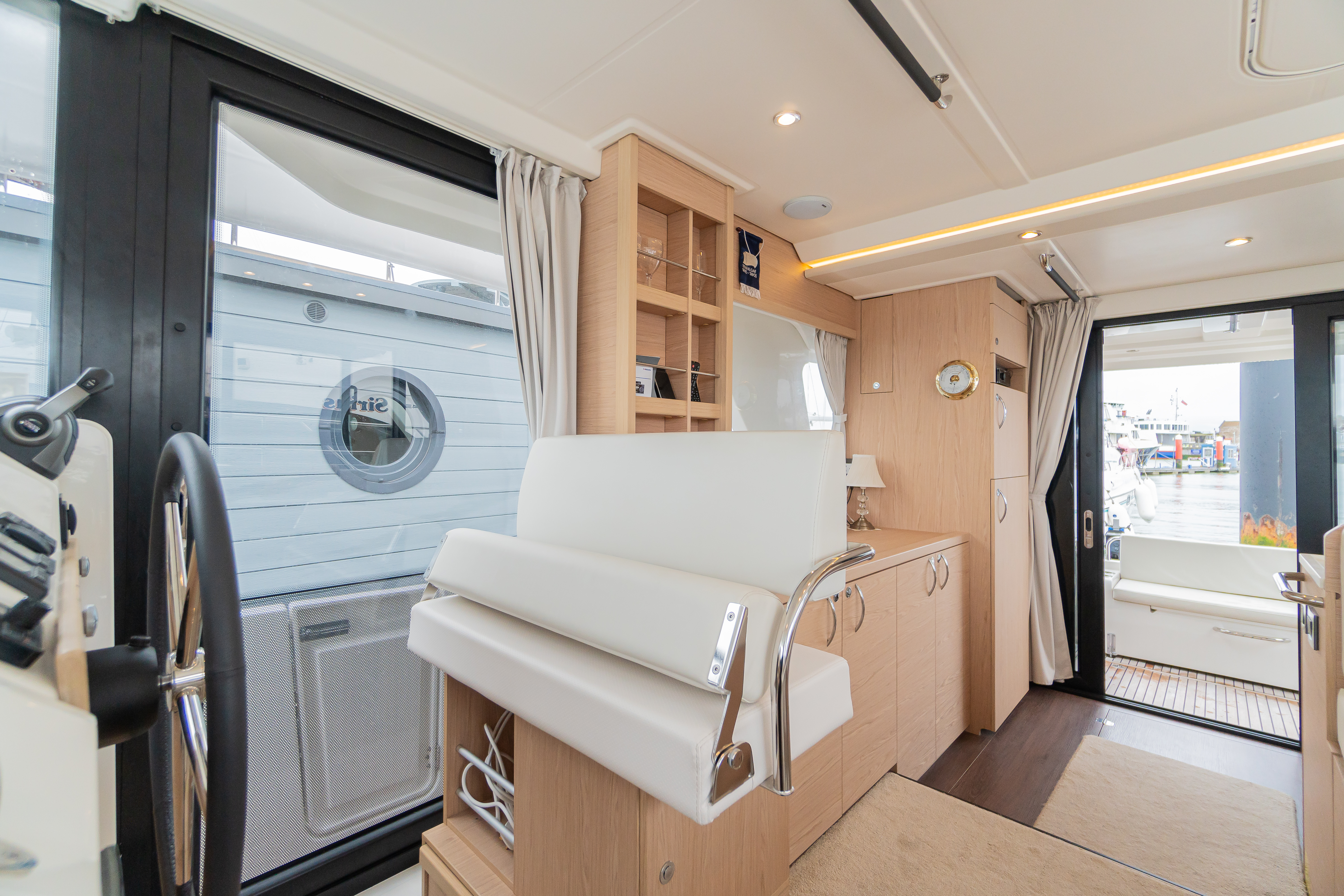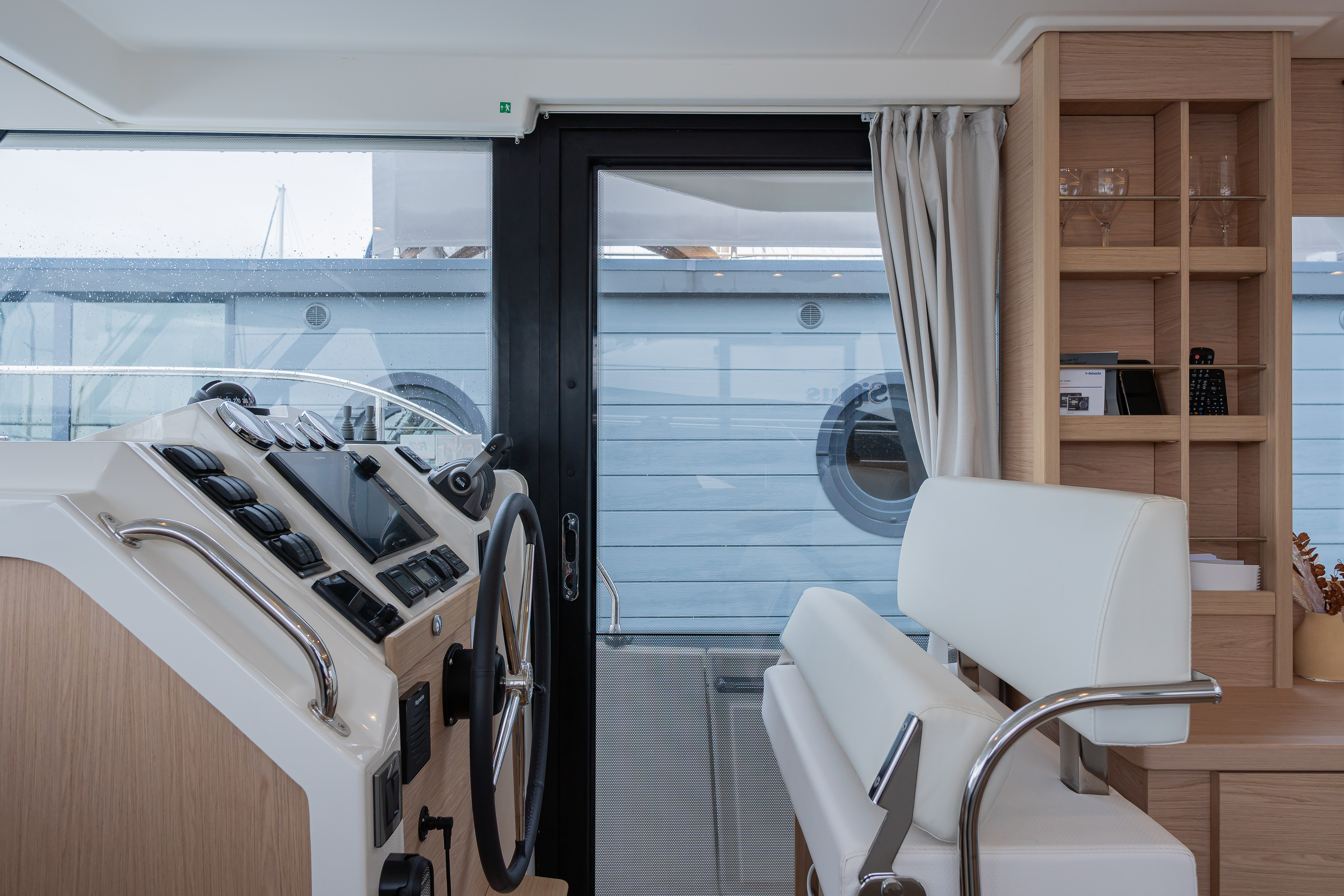 Fixed helm seat with storage and handrails, removable floor step, sliding side door with direct access to catwalk.