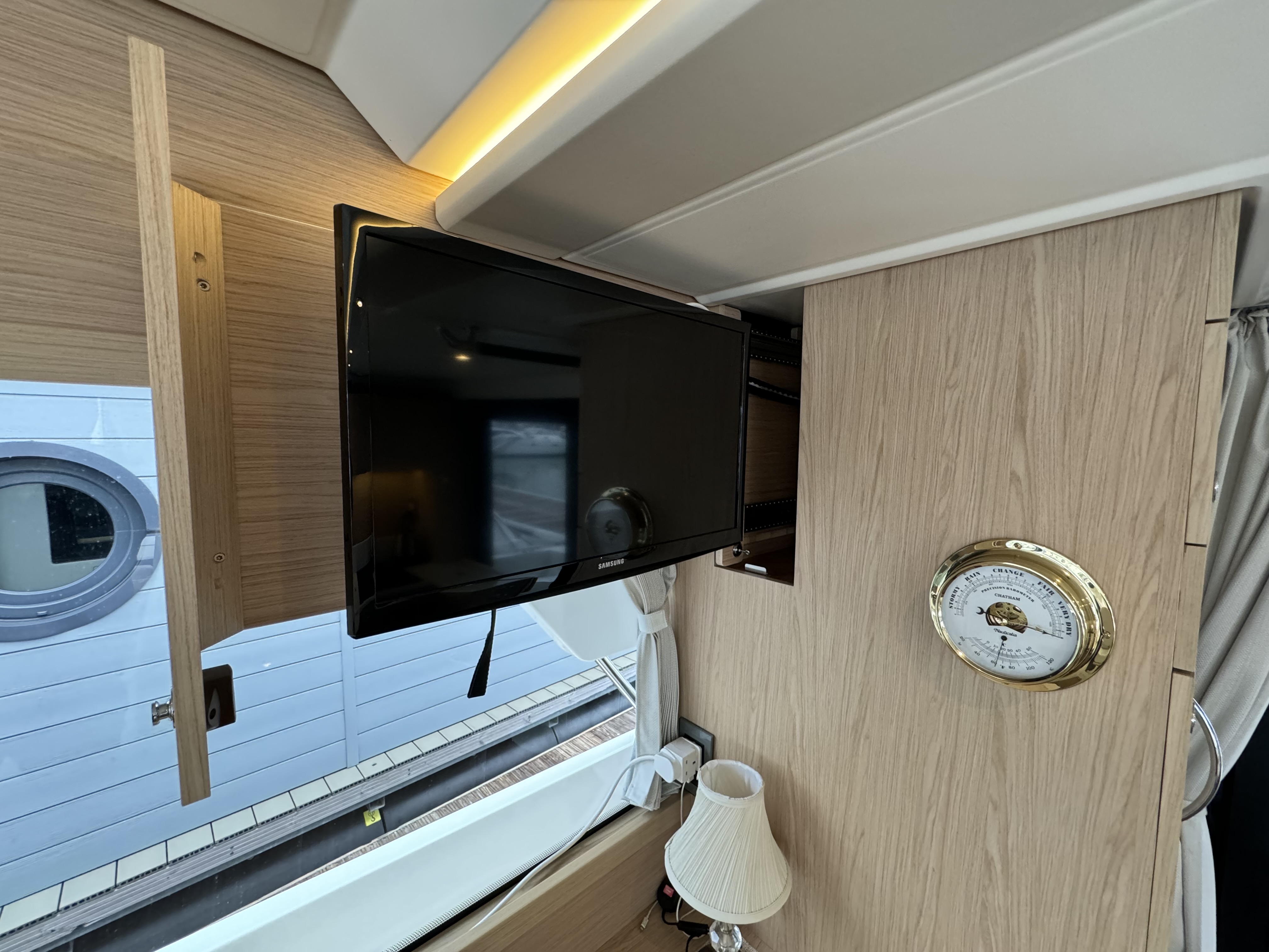 Additional features include rope cutters, galvanic isolators, an in-line water filter, and a stylish Alpi Oak finish. Enjoy the convenience of stern and bow thrusters, TV sound system, electric galley with microwave, heating, and much more.