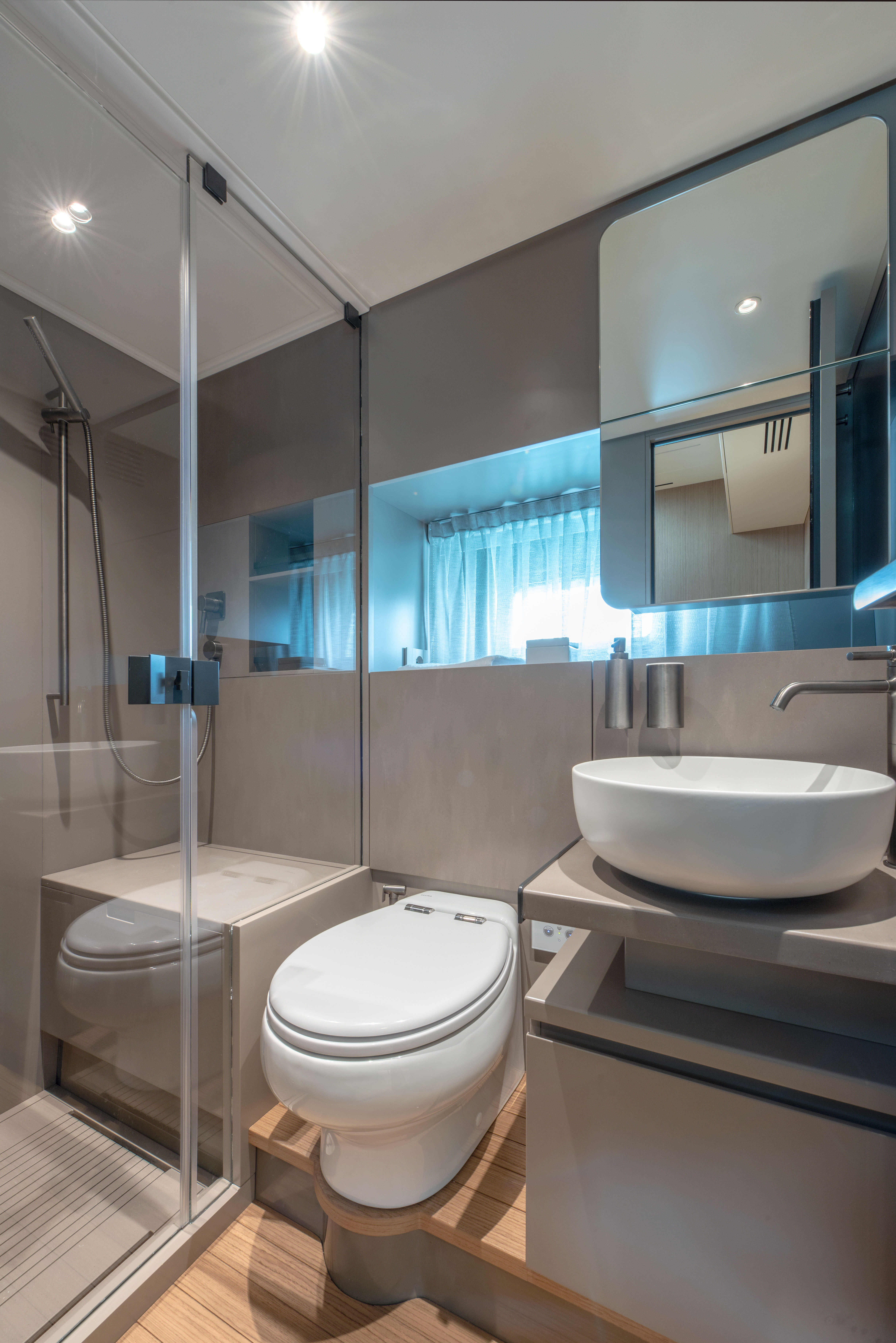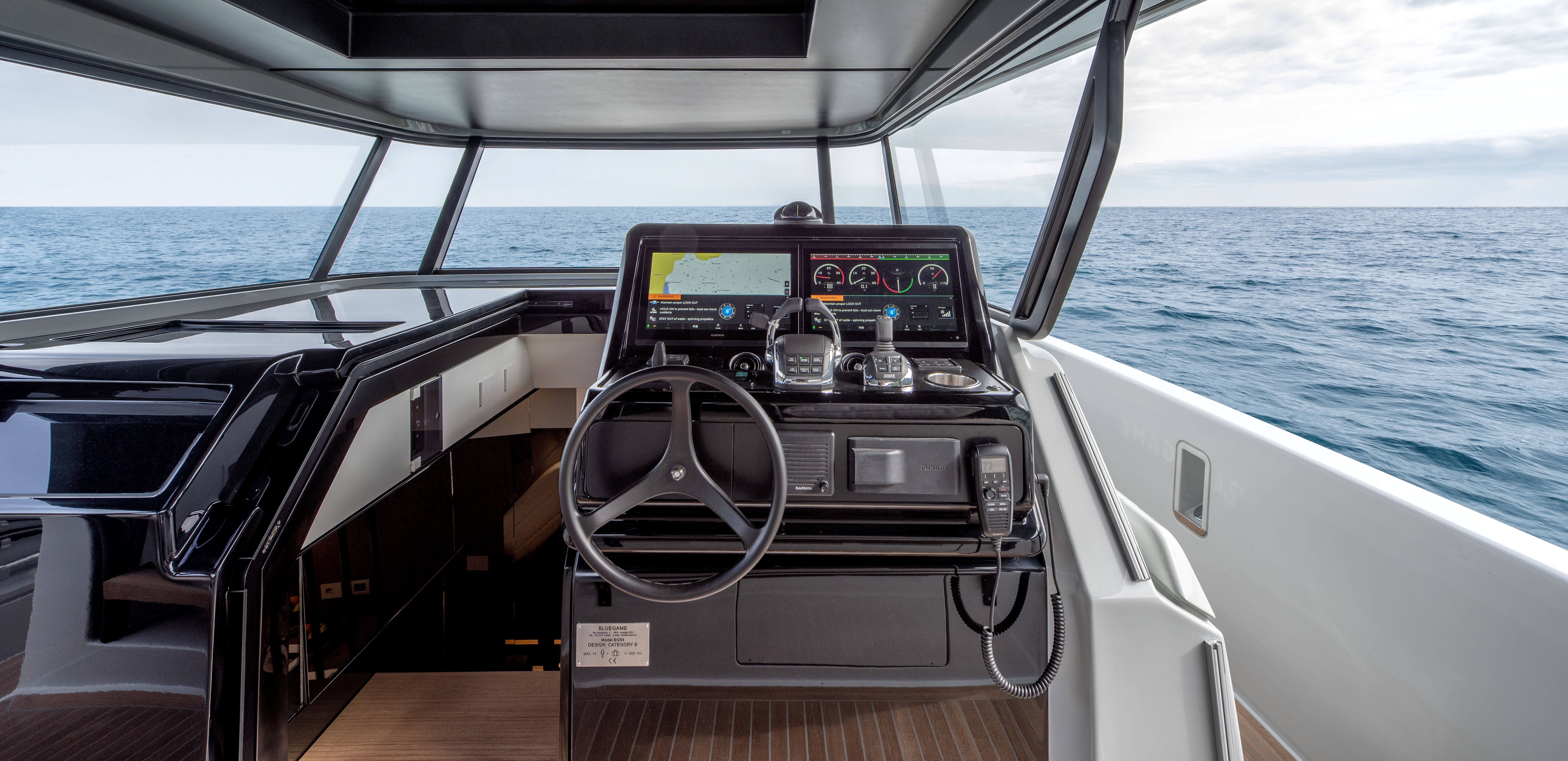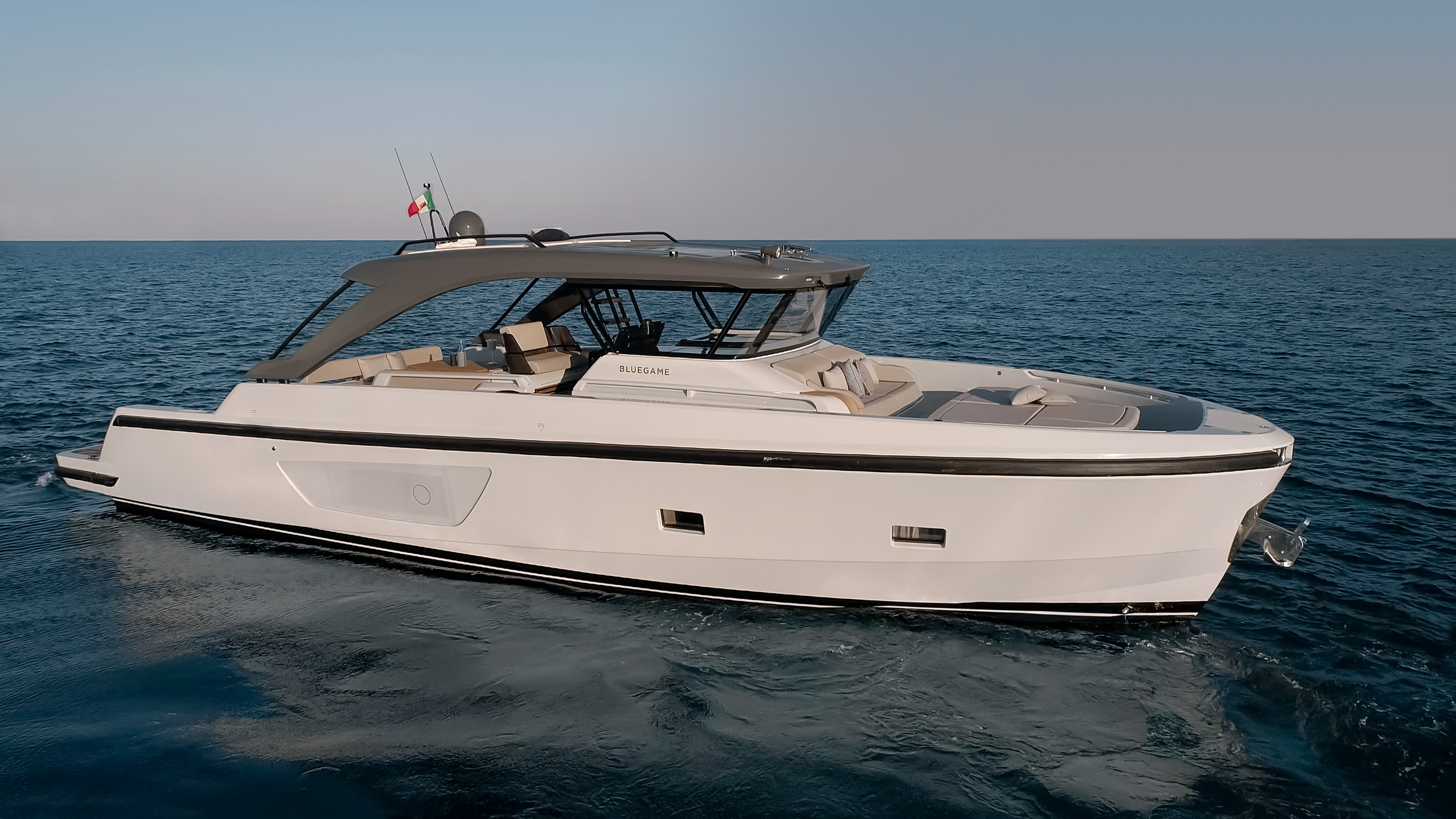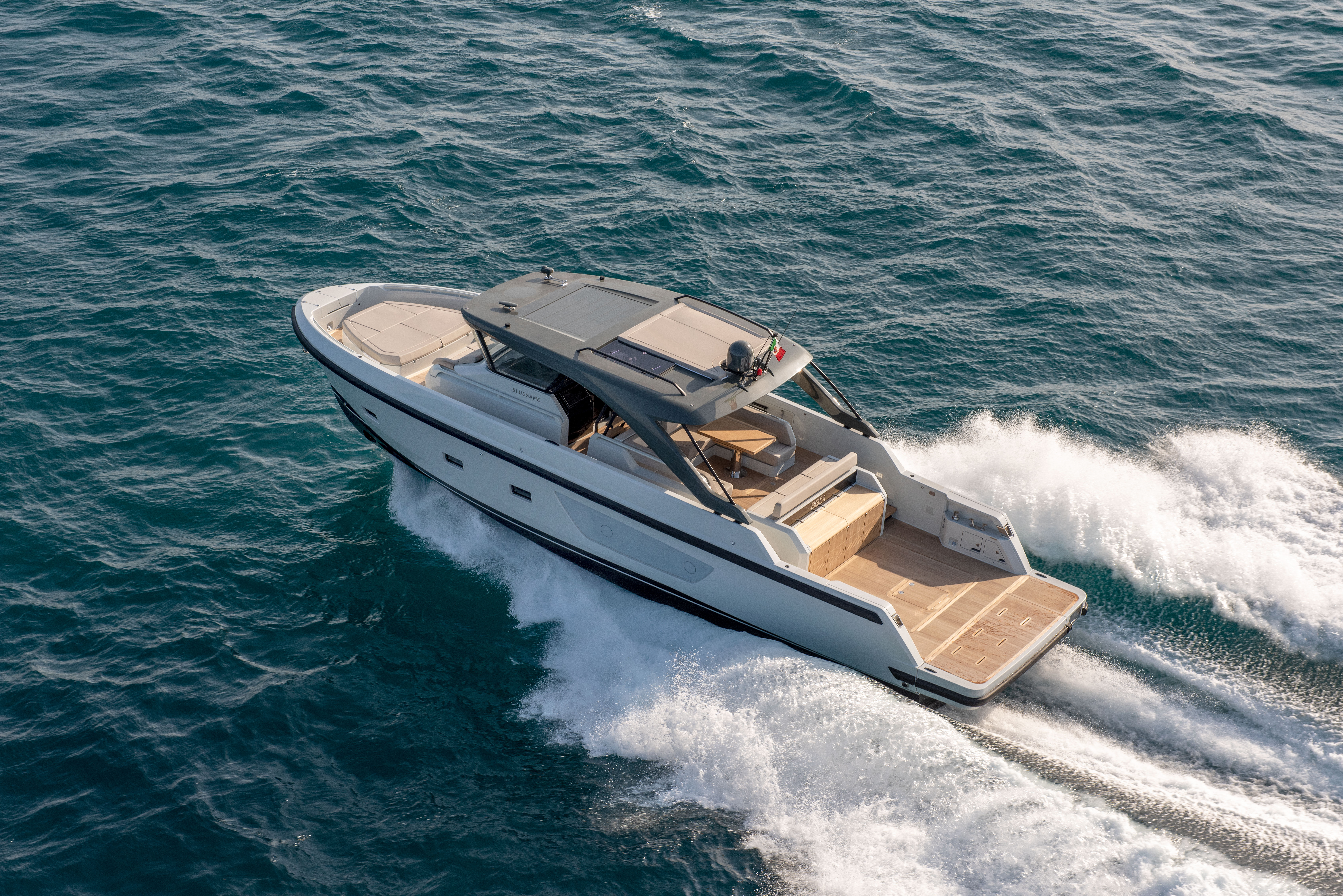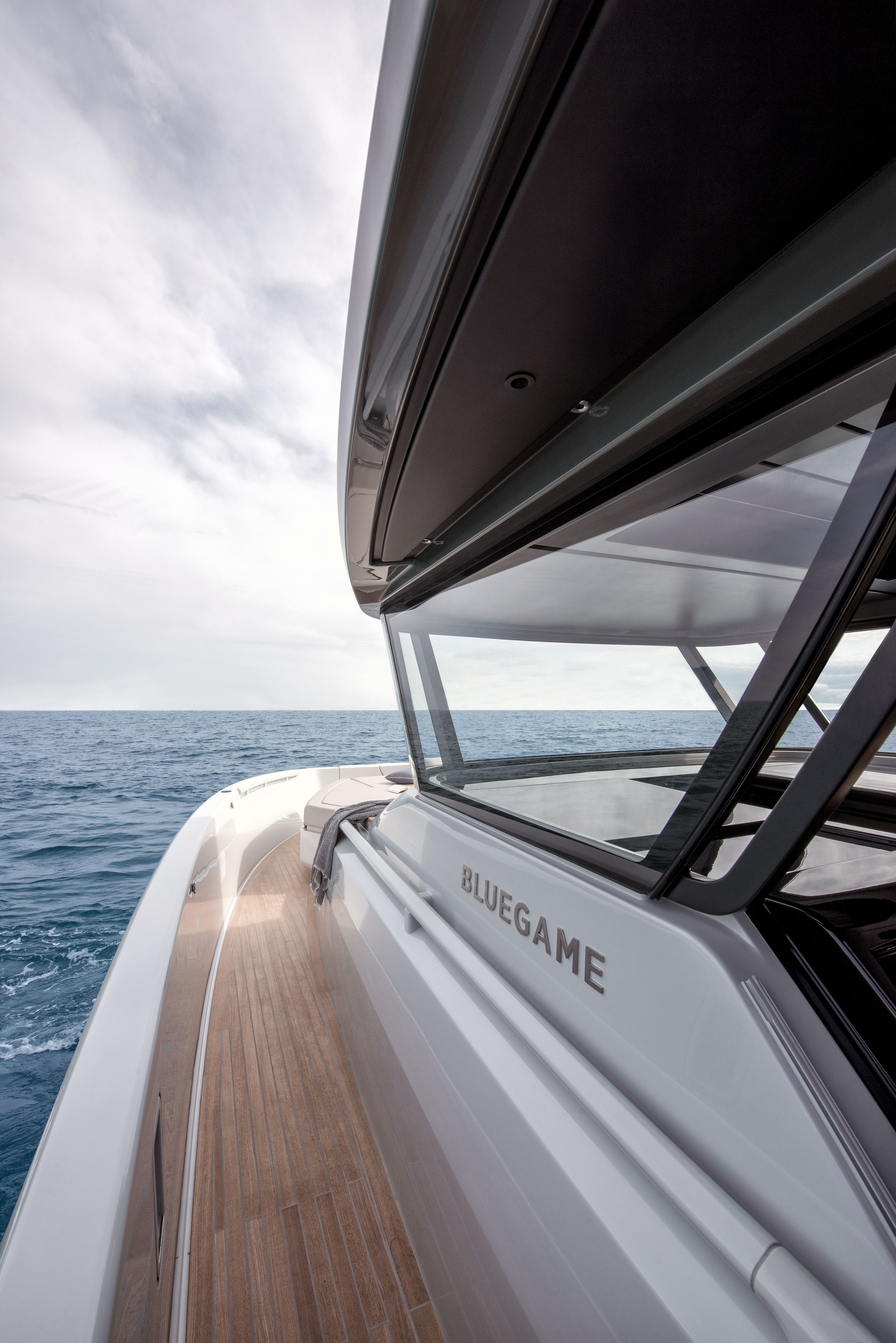 The 360° open cockpit offers breath-taking views, and the hardtop is equipped with an access ladder to an elevated sun pad, while the wheelhouse with a reverse windshield remains unsurpassed for maximum visibility. The refined design of the BG54 is in keeping with the stylistic tradition of Bluegame, and the hull is engineered for safe navigation in any weather conditions.