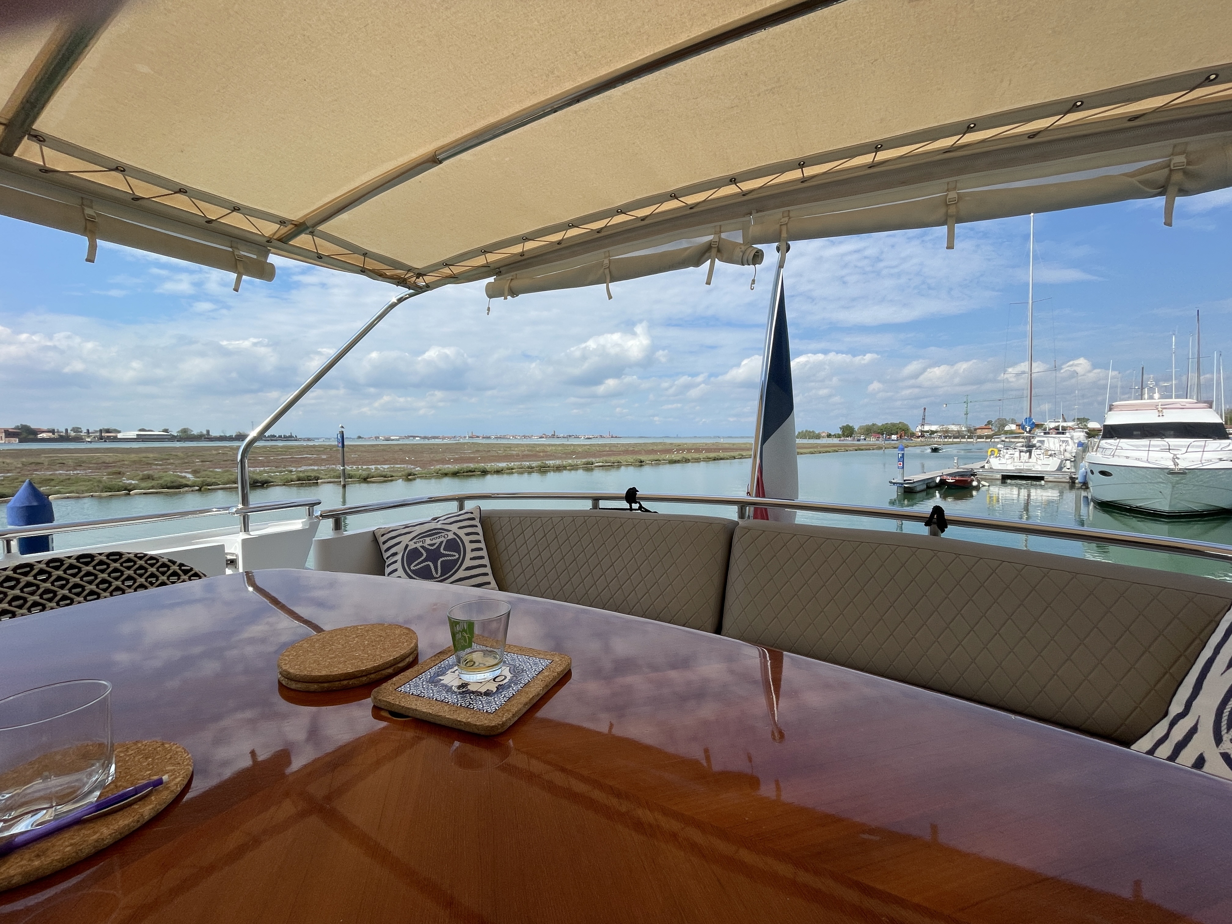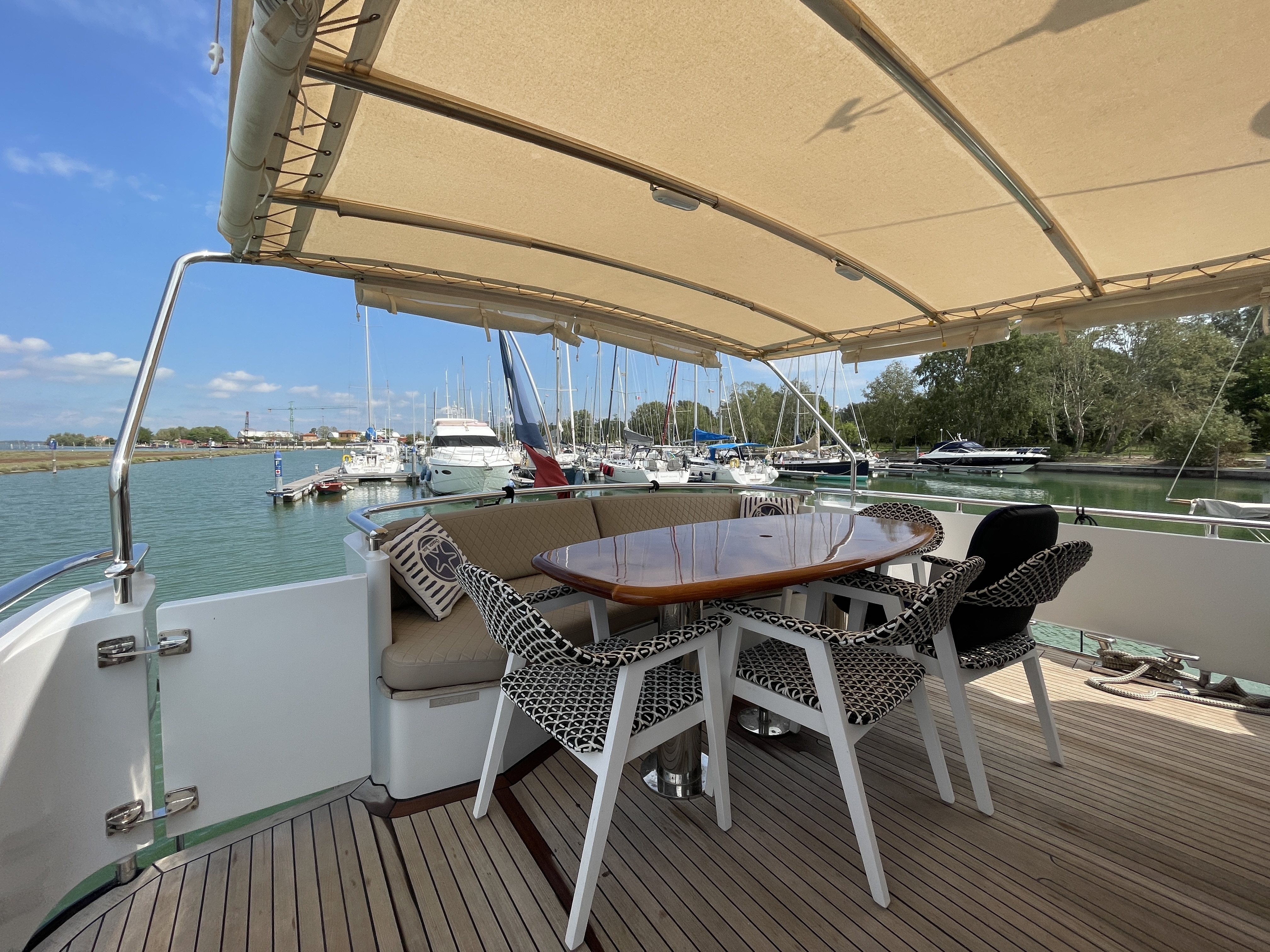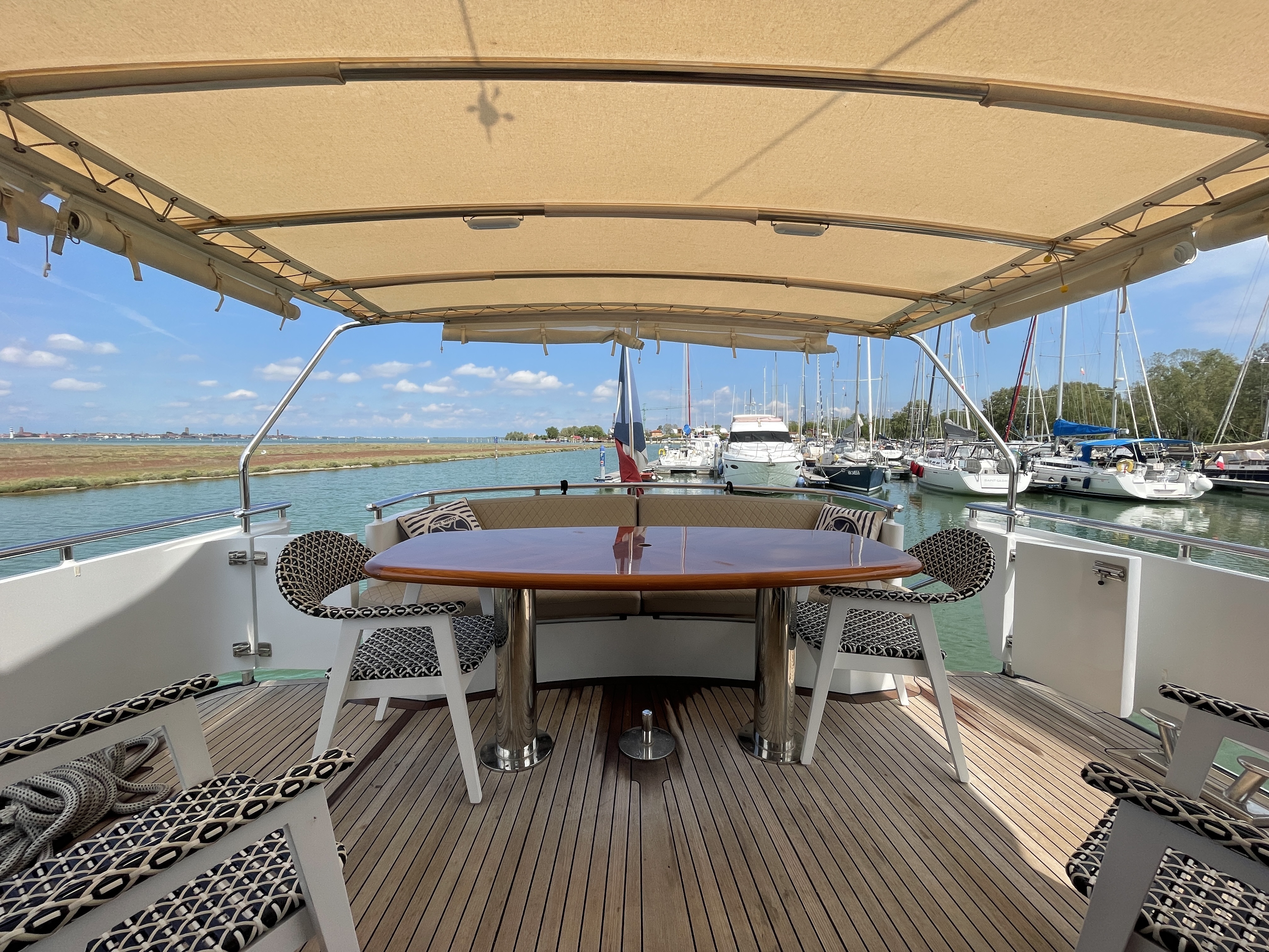 Panneaux de cagnard intégrés dans la rambarde arrière avec 2 passages vers la plateforme de baignade