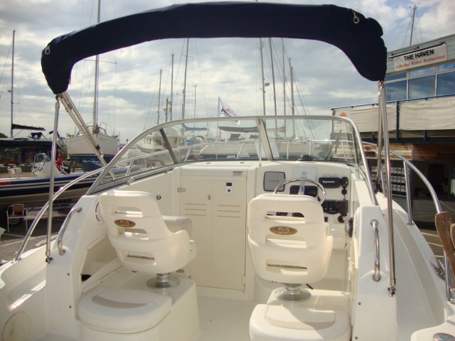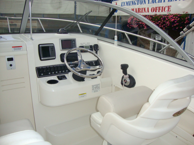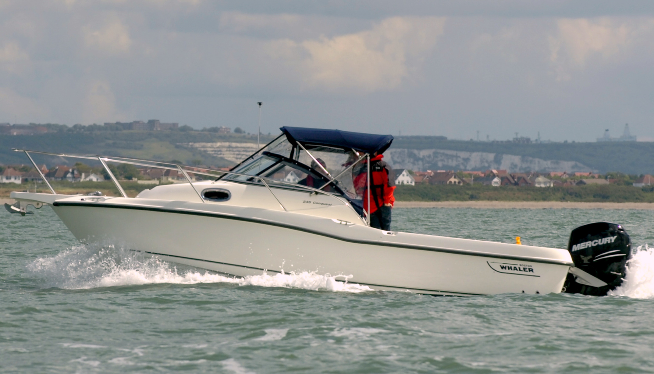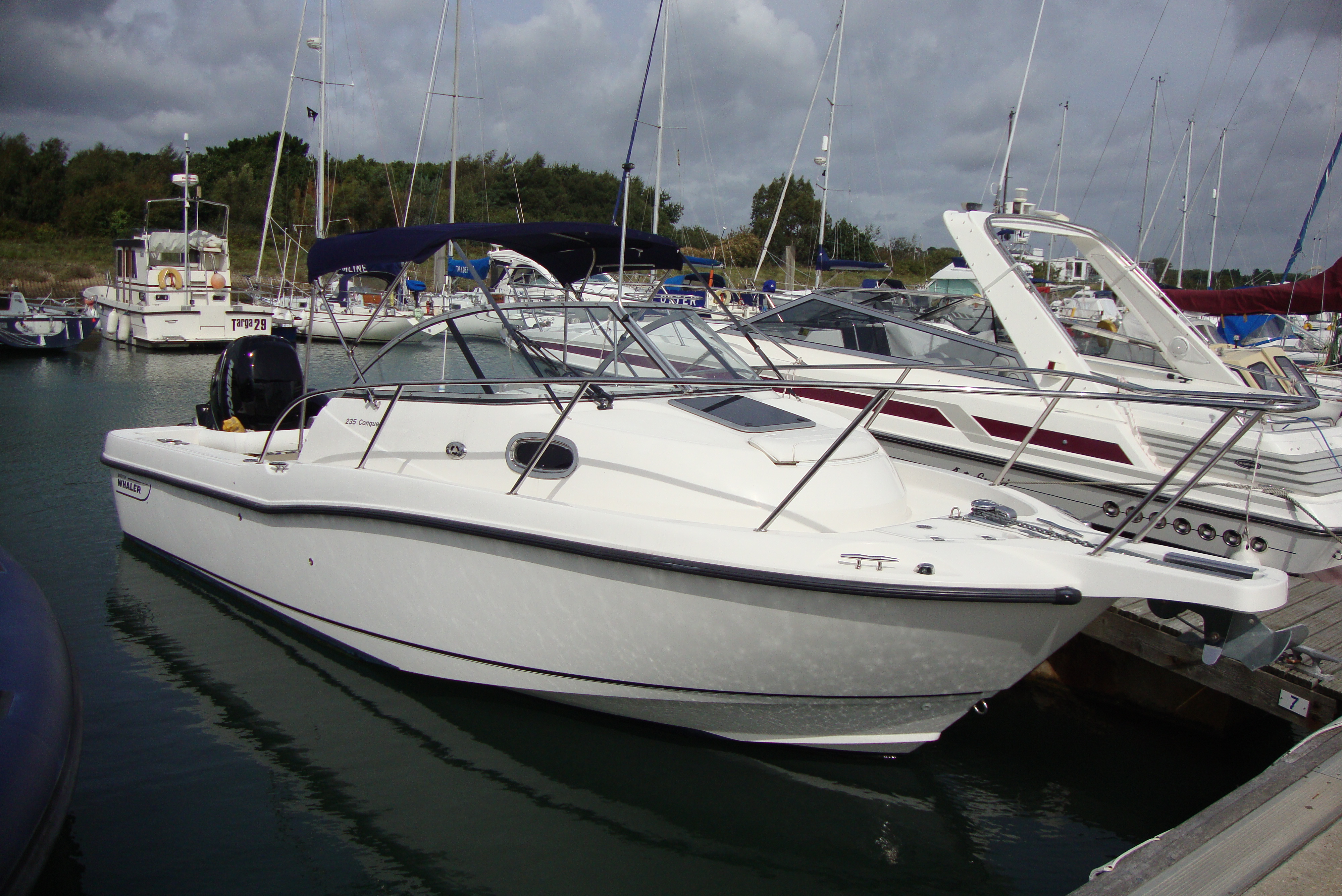 Boston Whaler 235 Conquest built in 2007 as 2008 model. Deep V planing hull sports cruiser with walkaround bow and expansive cockpit for fishing or entertaining. Cuddy cabin sleeps two with portable toilet neatly hidden away under berth infill. There are rod holders in the transom and cockpit and rod racks in the cockpit and cuddy cabin. Powered by Mercury 250hp Verado outboard capable of speeds up to 40 knots, the 235 combines big boat capabilities in a manageable size. Lying ashore in Lymington (South Coast, UK) and available for viewing via prior appointment only.