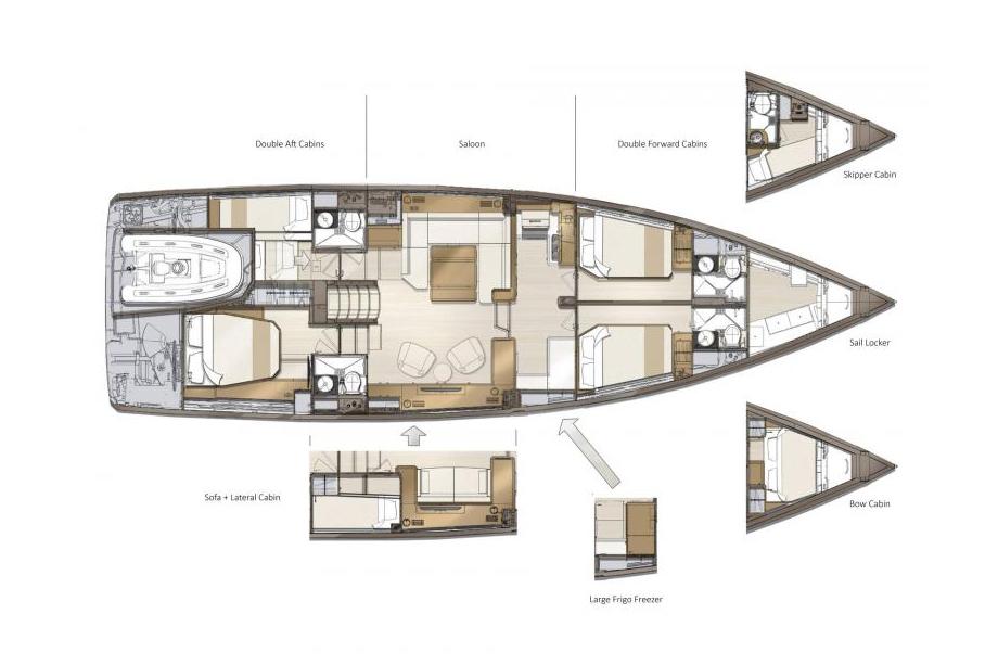 The JEANNEAU YACHTS 60 can be split into four living areas, each offering multiple options: the forepeak, the forward cabins, the salon with the forward galley, and the aft cabins. The forepeak: three versions are possible, with a large sail locker, a skipper cabin, or a sixth cabin. Next, two versions of the forward area are possible: an owners’ cabin or two cabins, each with a double berth. The bulkhead that divides the two forward cabins can be slid forward into a dedicated storage space creating one open space. Then one berth can be transformed into a sofa, creating a suite on demand.