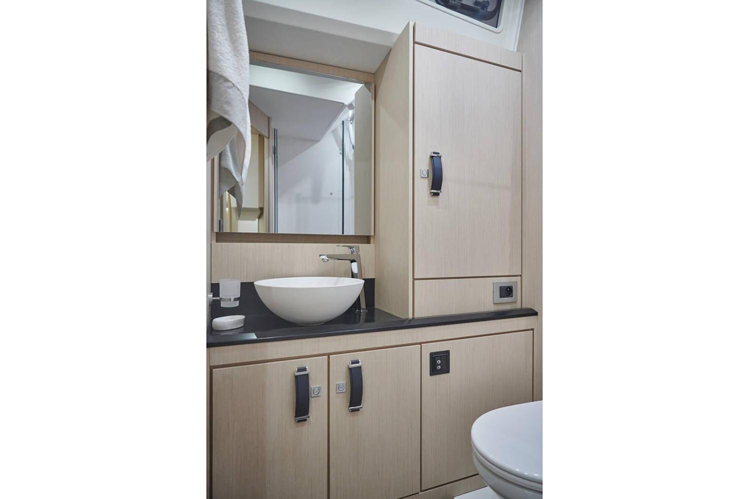 Three possible layouts are available for the starboard side of the salon: a version with a sofa and adjacent chart table, a lateral twin bunk cabin, or an “open plan” version that could accommodate two free-standing armchairs. Finally, the aft living area can be configured as either an owner’s cabin or as two cabins, featuring one double berth on starboard, and a twin bunk to port.